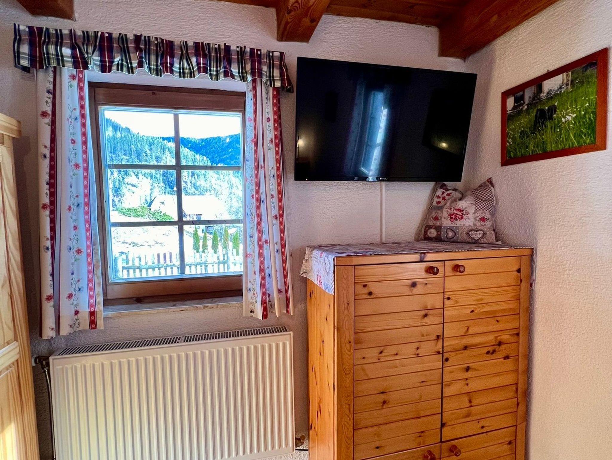 Zweibettzimmer mit Zirbenbett, Kommode, Schrank und Flachbild-TV.