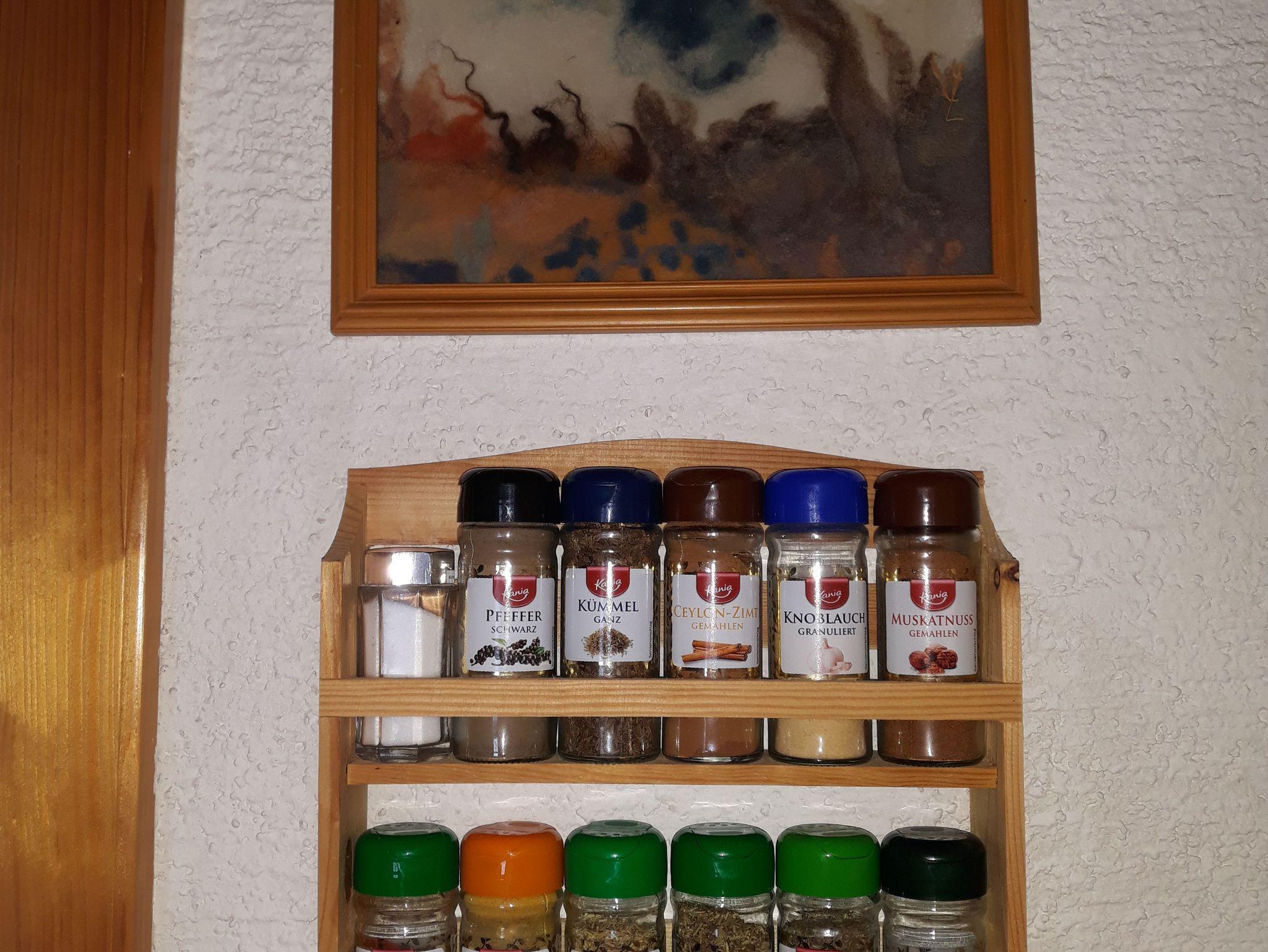 Wohnküche mit voll ausgestatteter Küchenzeile, E-Herd, Mikrowellenherd, Geschirrspüler, Kachelofen und Sitzecke. Genug Geschirr für 6 Personen.