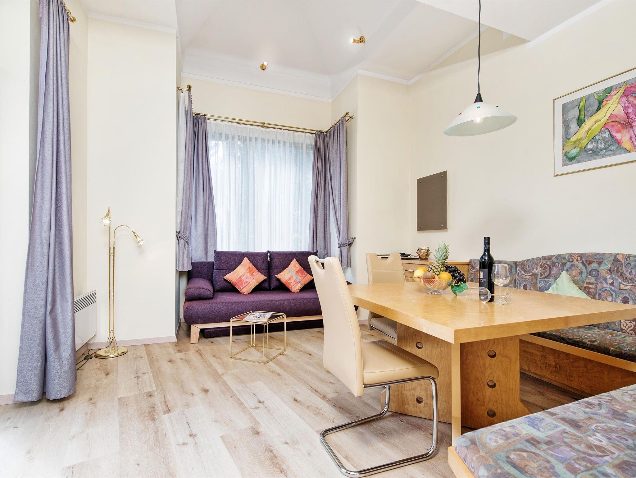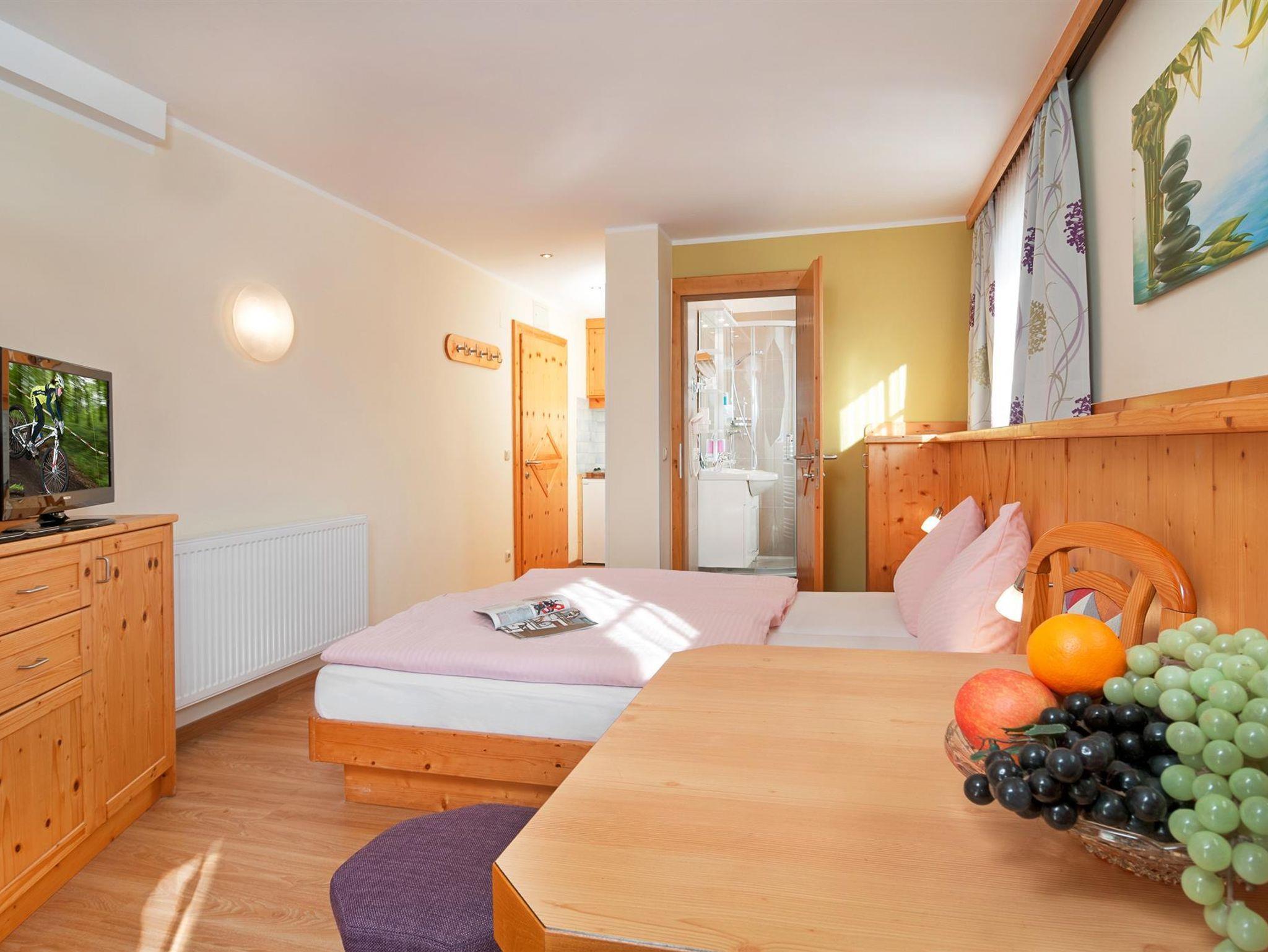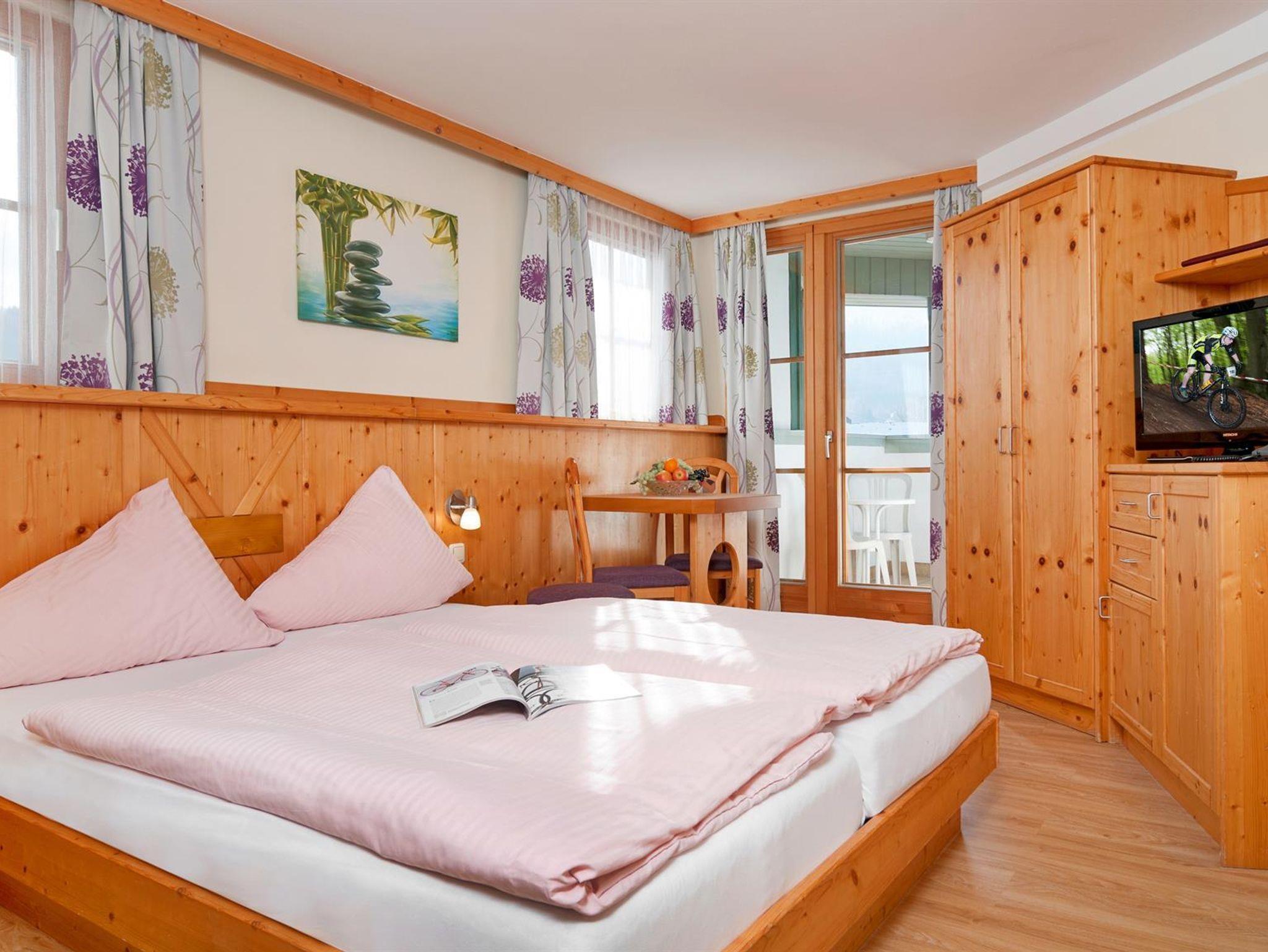 Studio für 1-2 Personen, 1 Wohn- bzw. Schlafraum in ruhiger Südlage mit Panoramabalkon, Eßecke, Kaffeemaschine, komplette Kochnische mit Kühlschrank, Du/WC, Radio, FLAT-TV, Telefon, Hotelsafe. Auf Anfrage auch als Doppelzimmer Mittagskogel buchbar = Ihr Preisvorteil!