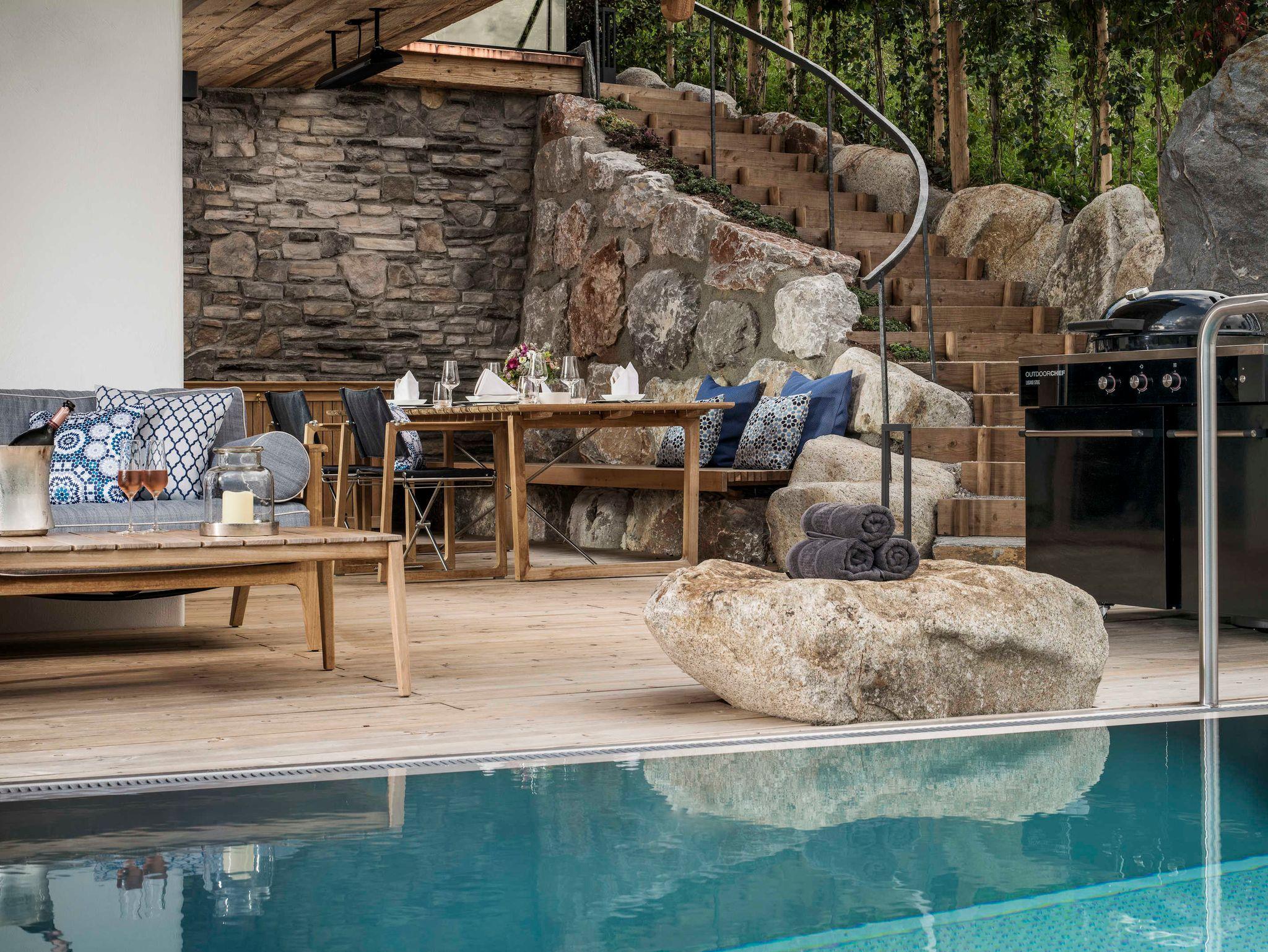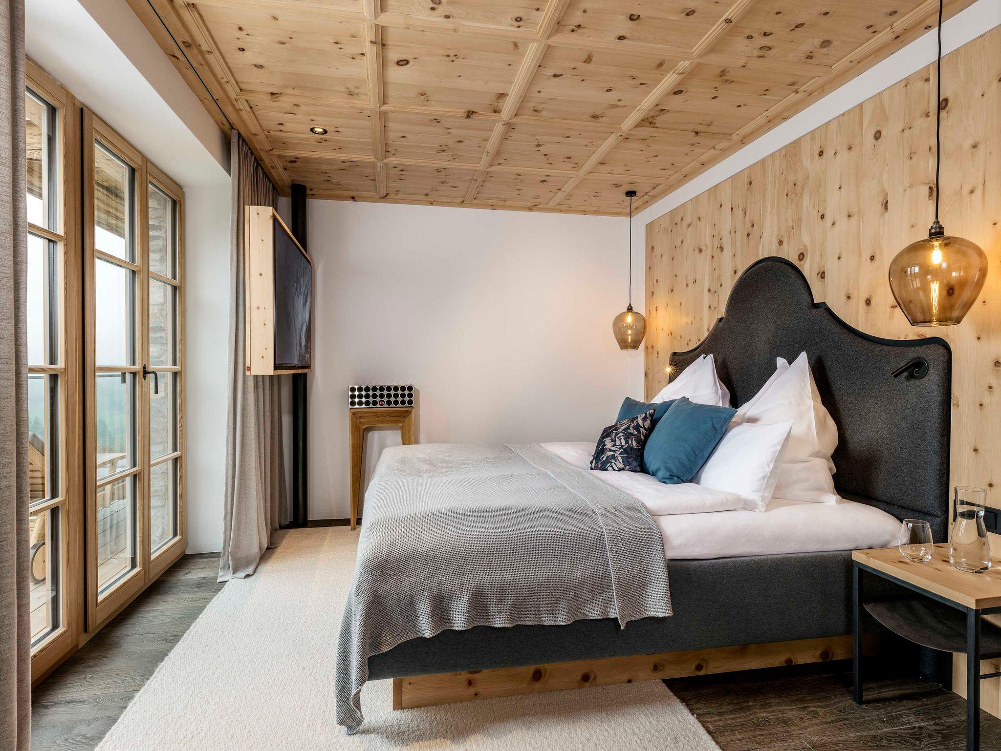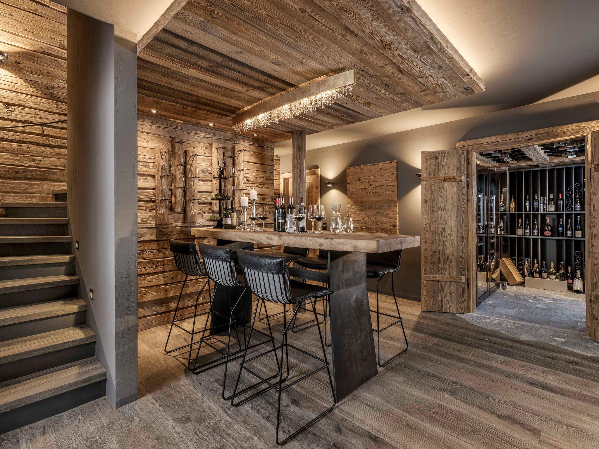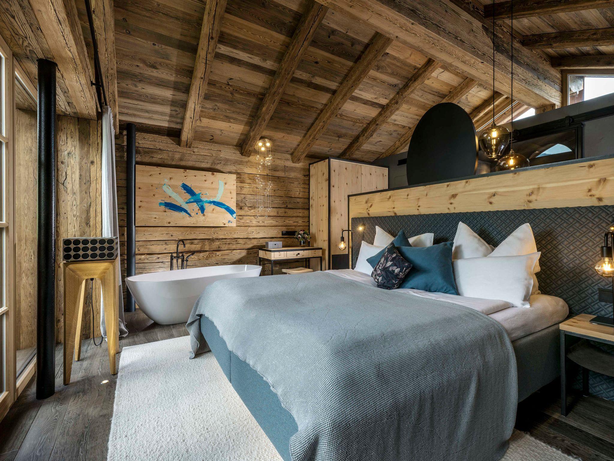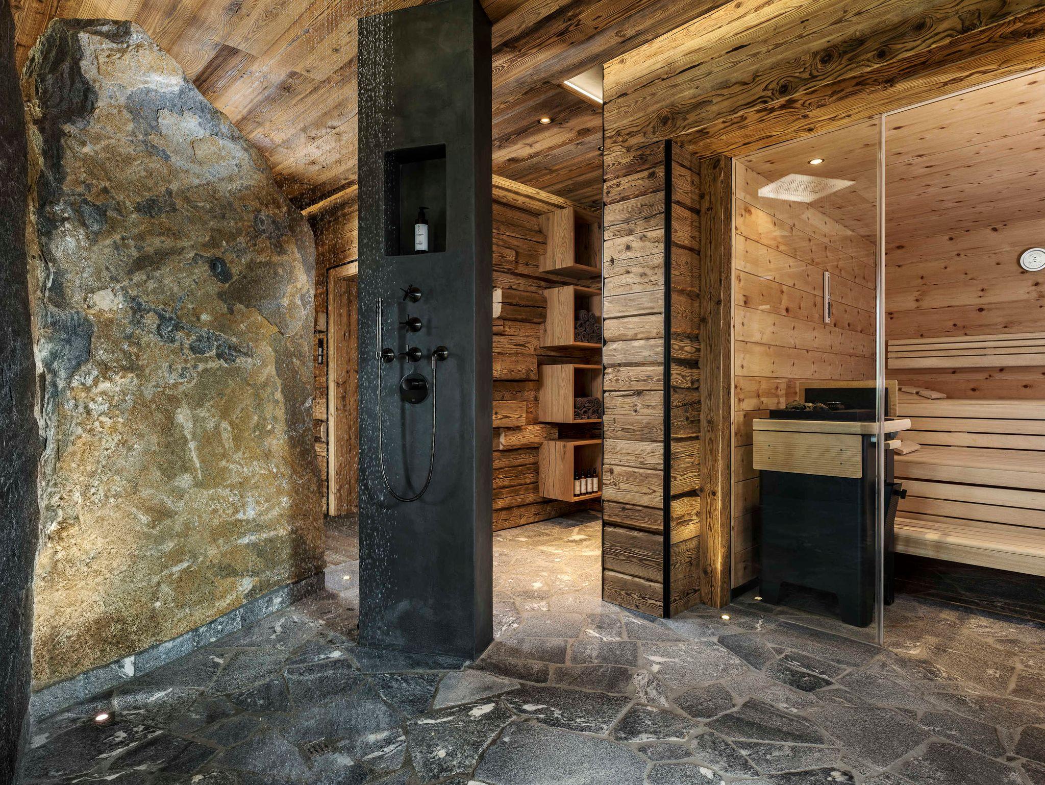 Murmeltiere und Langschläfer aufgepasst. Drei Doppelschlafzimmer mit Zirbenholzbetten sorgen für erholsamen Sommer- wie Winterschlaf. Eines davon im Obergeschoss mit hohem Sichtdachstuhl, Blick zu den Steinbergen, freistehender Badewanne und Regendusche. Zwei weitere Ruhepole finden sich im ersten Untergeschoss. Ein Masterbedroom mit großer Glasfront und Blick ins Tal, freistehender Badewanne und Regendusche. Sowie ein Schlafzimmer zur Terrasse mit großer Duschgrotte in schwarzen marokkanischen Fliesen.