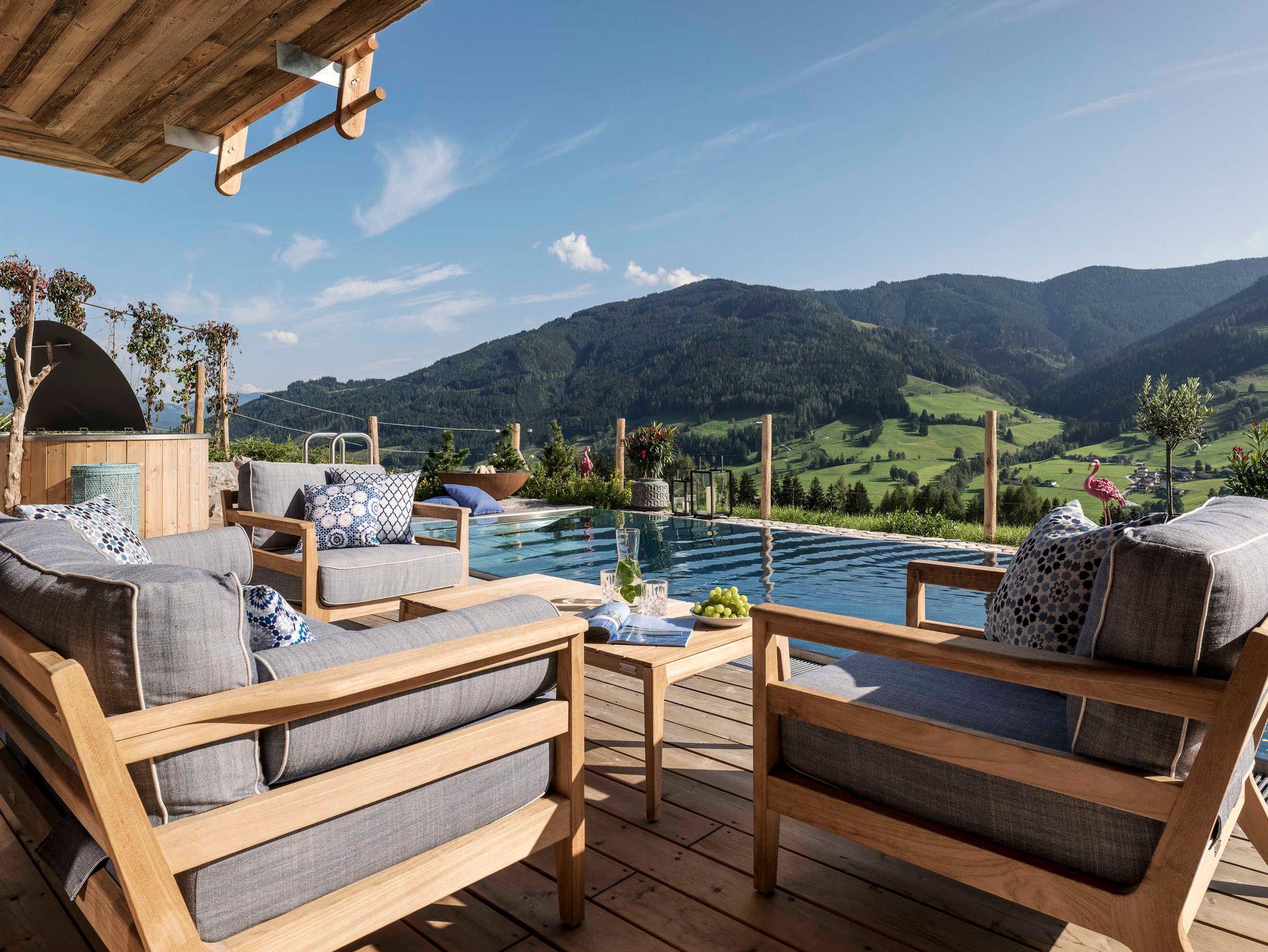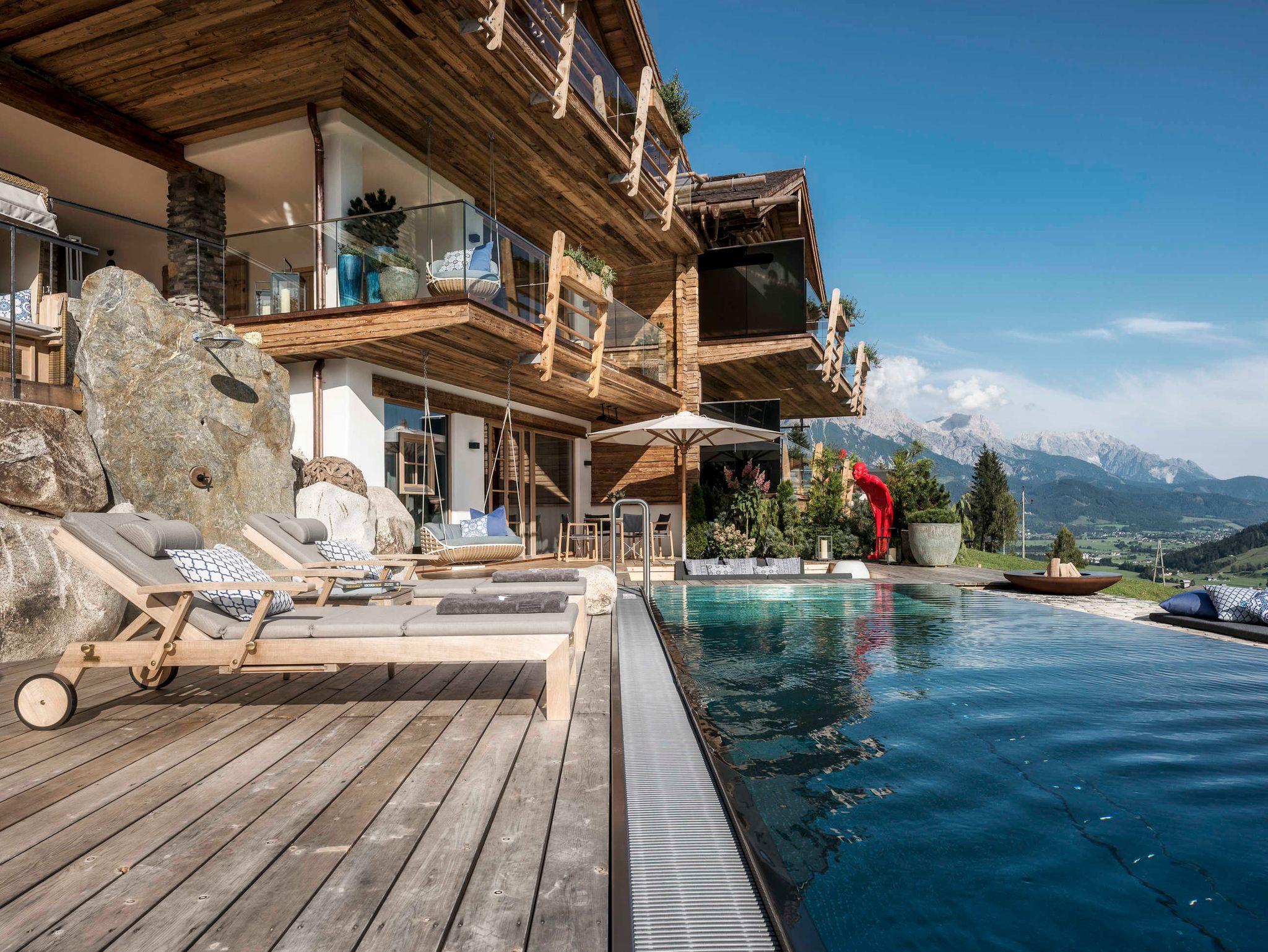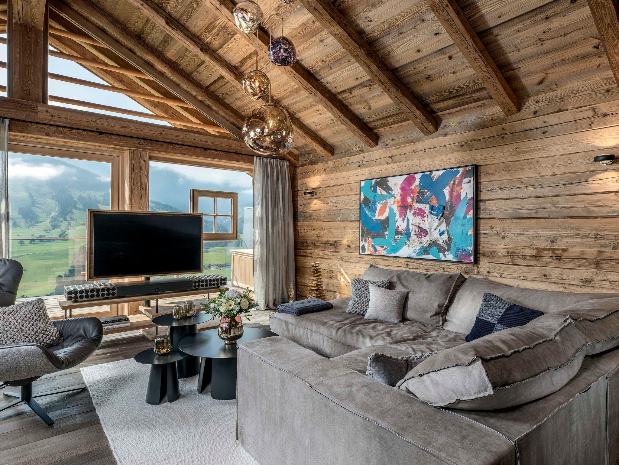 250 m2, die nur dem Sein geho¨ren. Der offene Wohnbereich mit Loft-Atmospha¨re und sichtbarem Dachgeba¨lk aus Altholz ist mit Mo¨biliar von Fritz Hansen wie dem Sofa Luna und dem Egg-Chair ausgestattet und geht leichtfu¨ßig in die Ku¨che mit Sitzgelegenheiten u¨ber. Die zwei Master Bedrooms sowie das zusa¨tzliche Schlafzimmer - alle mit SAMINA-Schlafsystem, eigenen Ba¨dern mit Wellness- Badewannen sowie Berg- und Talblick bis zu den Saalfeldener Steinbergen, verteilen sich fu¨r ungesto¨rte Privatspha¨re auf verschiedene Ebenen und bieten Zugang zu den großzu¨gigen Balkonen und Terrassen. Den Ho¨hepunkt offenbart ein eigener Wellnessbereich mit ganzja¨hrig beheiztem Infinity Outdoor-Pool fu¨r endlos entspannte Stunden mit Weitblick. Natu¨rliche Materialien, Eichenholzbo¨den und Zirbenholzdecken kombiniert mit großen Fensterfronten spenden viel Licht und lassen zur Ruhe kommen ? am besten vor dem knisternden Kamin.