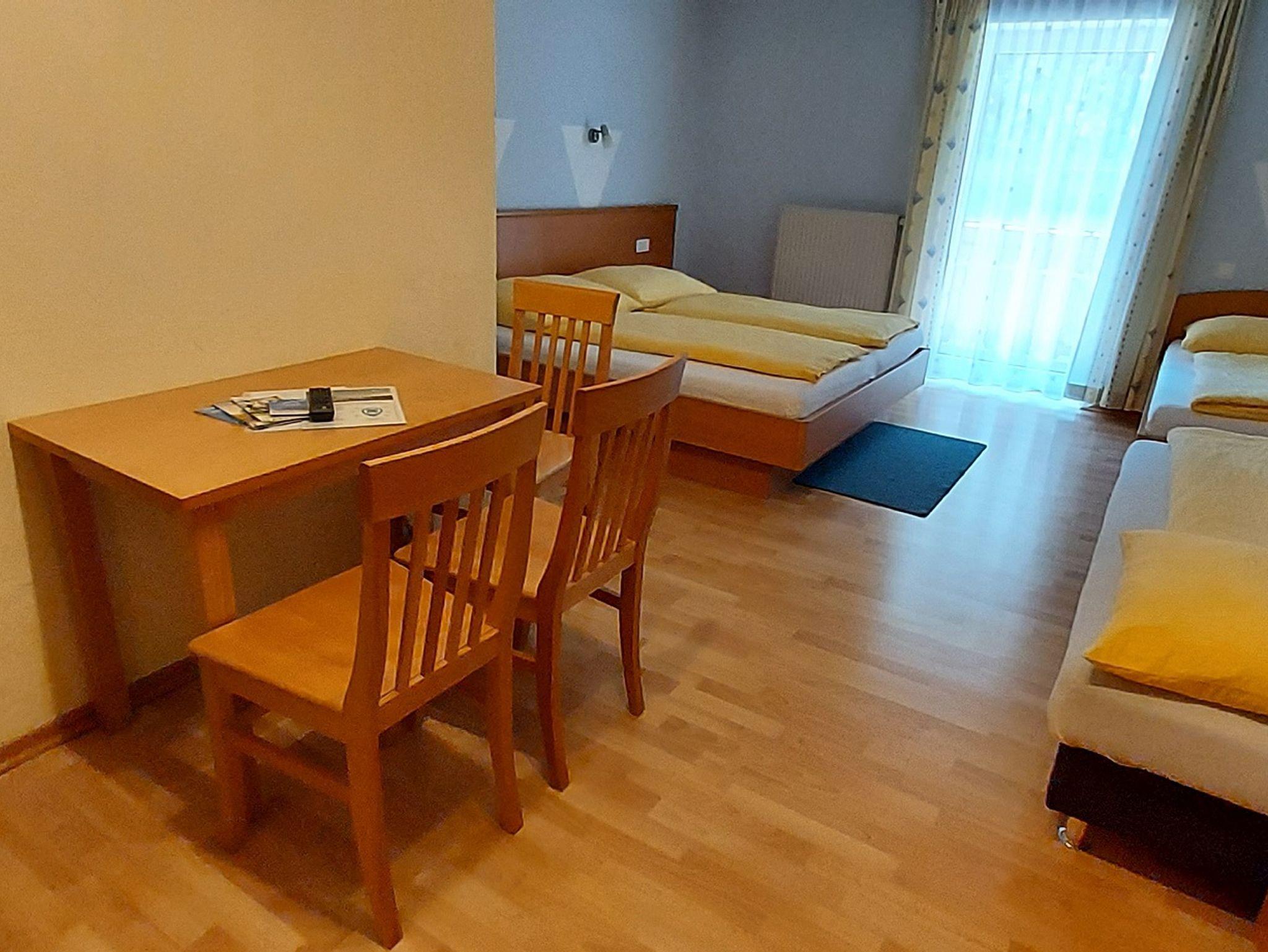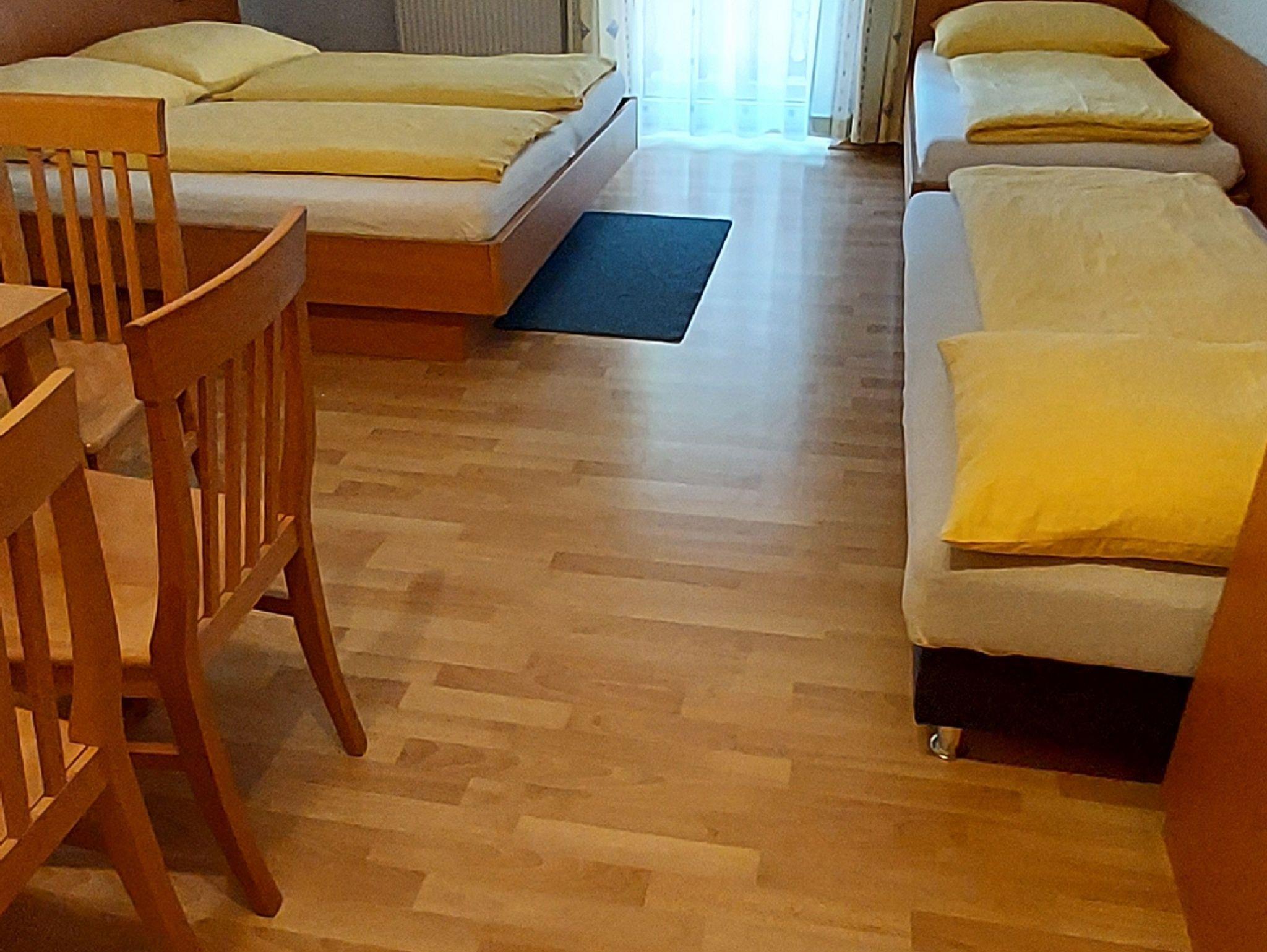Das helle und geräumige Vierbettzimmer mit 30qm bietet einen traumhaften Blick auf die Berge. Es verfügt entweder über ein Doppelbett und zwei Einzelbetten oder ist mit zwei Doppelbetten ausgestattet. Ein Kleiderschrank und TV befinden sich ebenfalls im Zimmer. Das Badezimmer mit Dusche oder Badewanne, WC und Fön rundet das Gesamtbild ab. Auf dem Balkon können Sie entspannte Abende verbringen. Haustiere sind gestattet. Möglicherweise fallen Gebühren an. Das WLAN und den Parkplatz vor dem Haus können Sie kostenfrei nutzen.