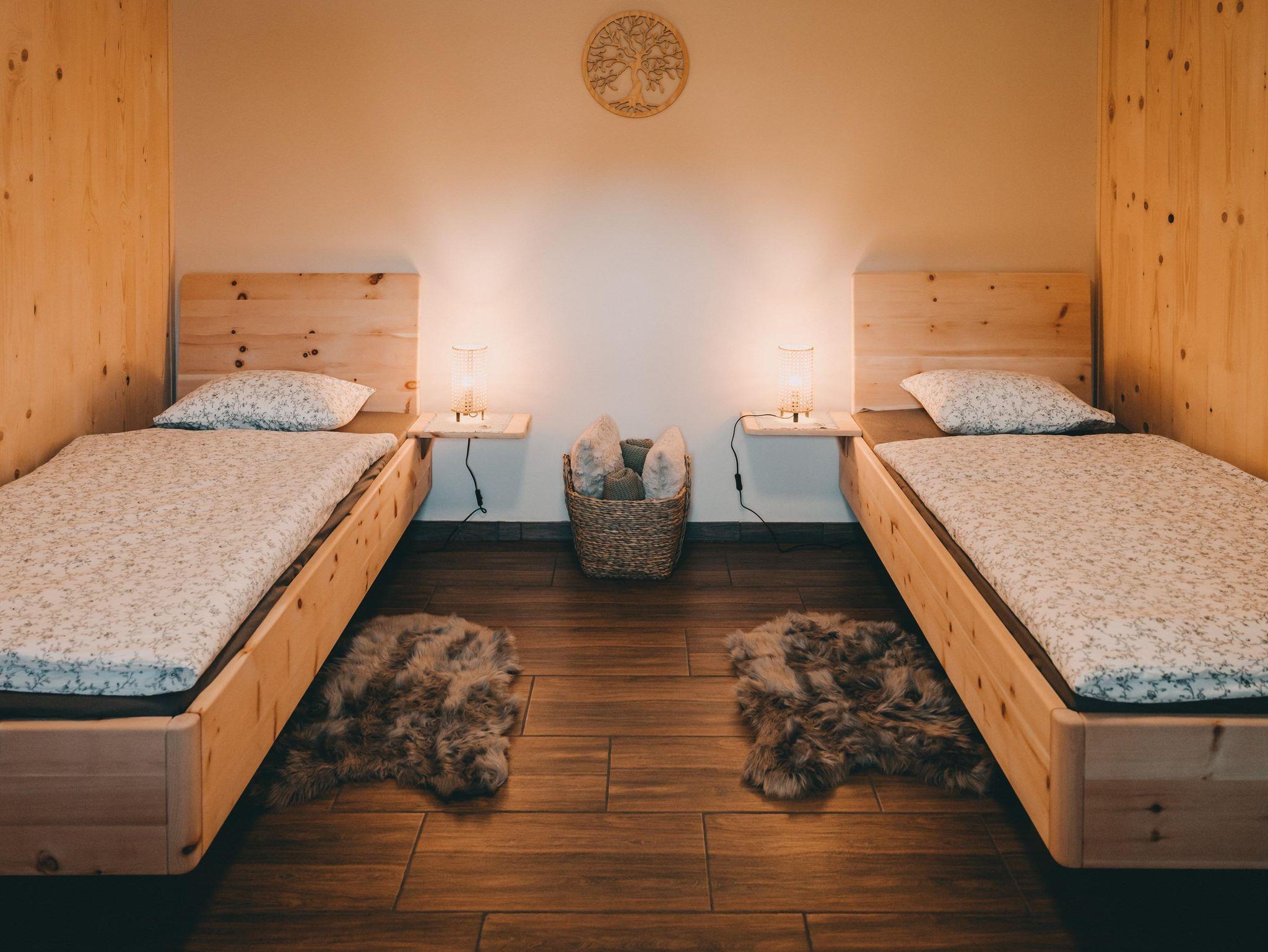 • Schlafzimmer mit zwei Einzelbetten aus Zirbenholz