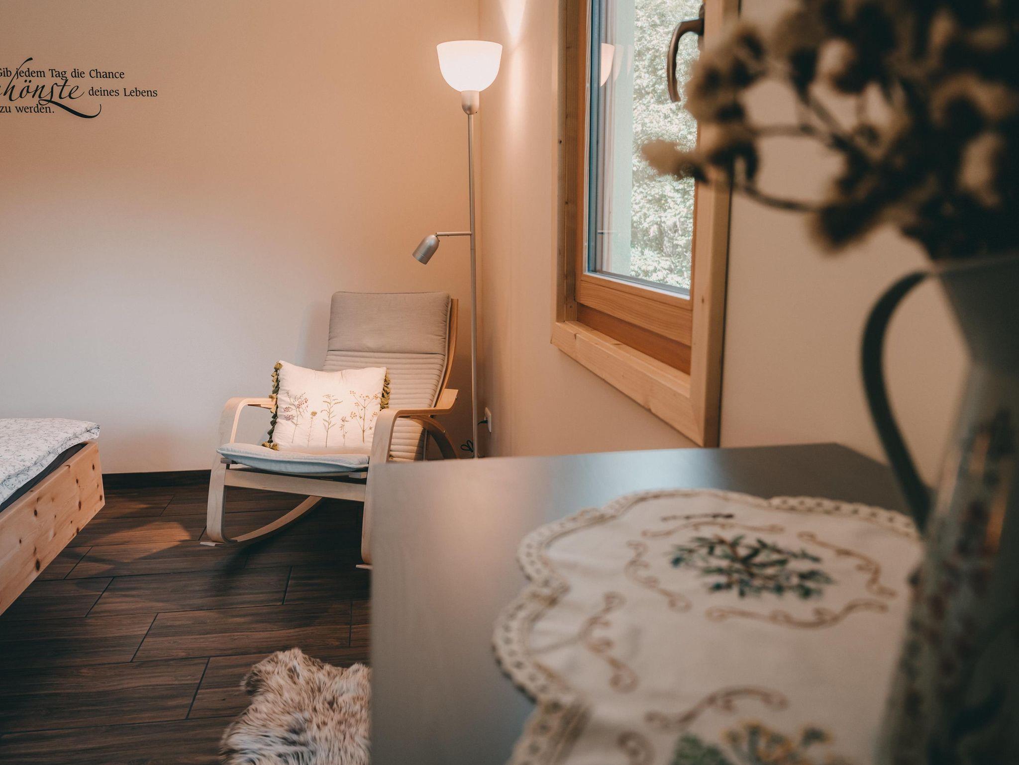 • Schlafzimmer mit Doppelbett aus Zirbenholz und Schaukelstuhl