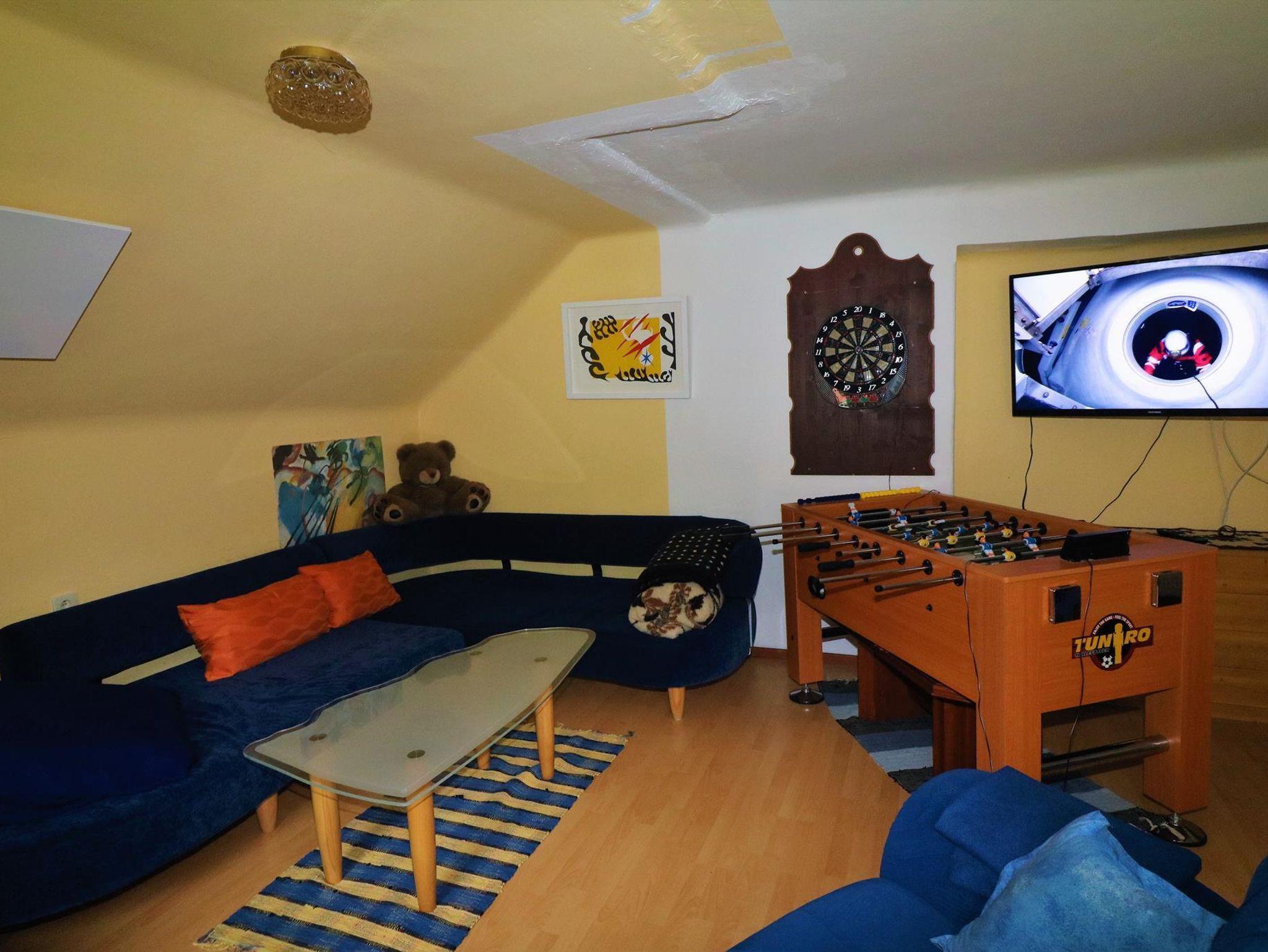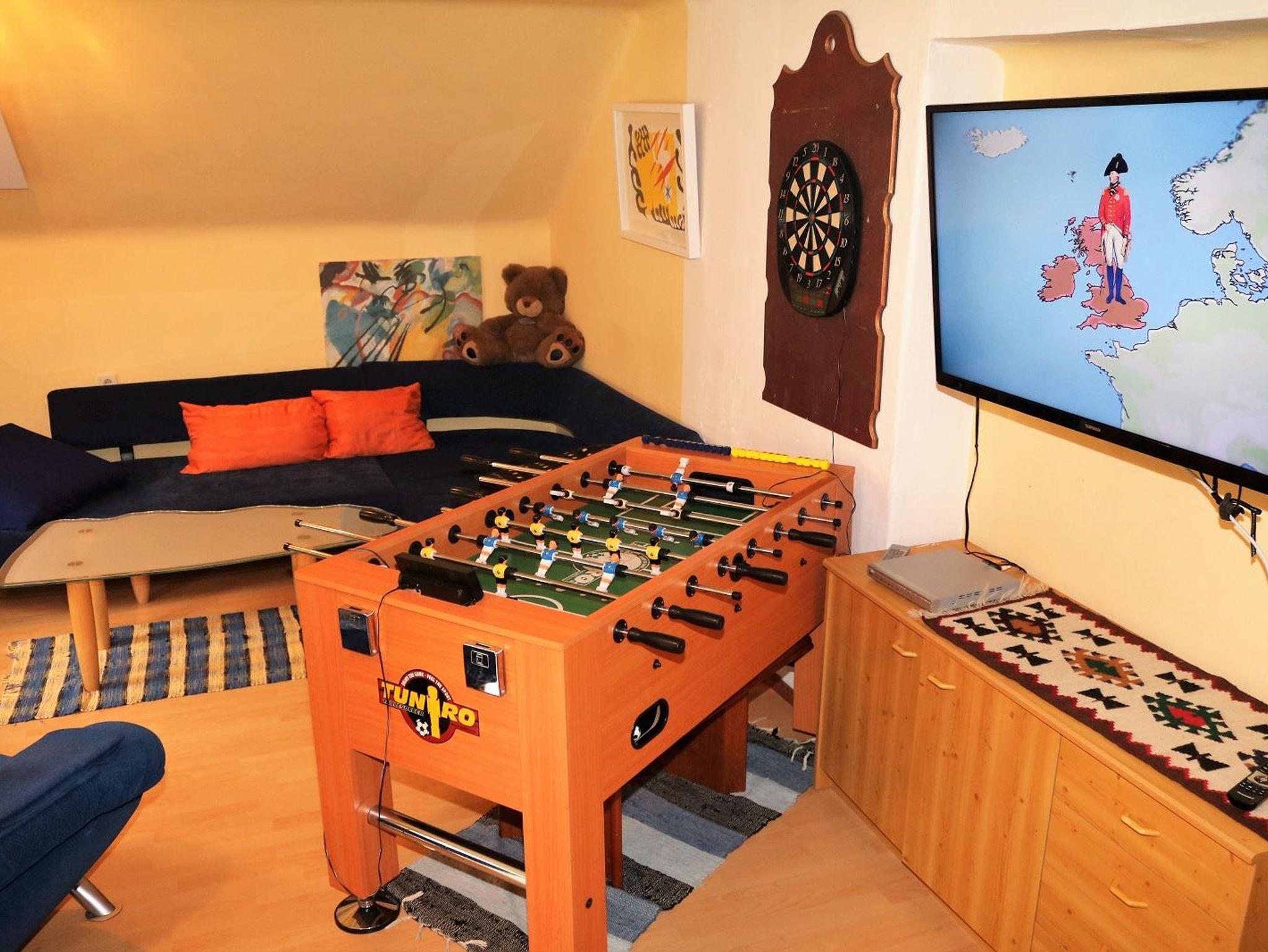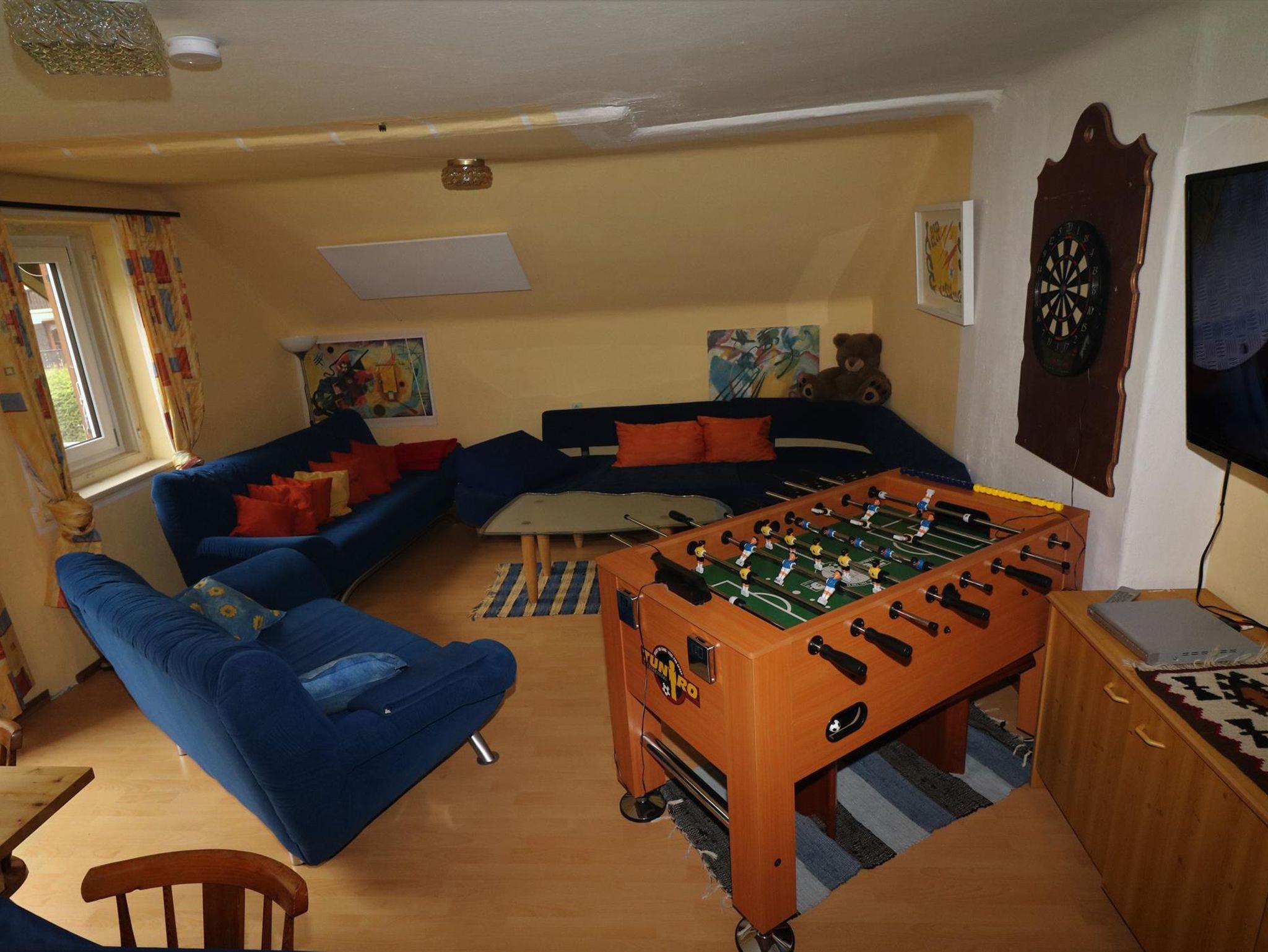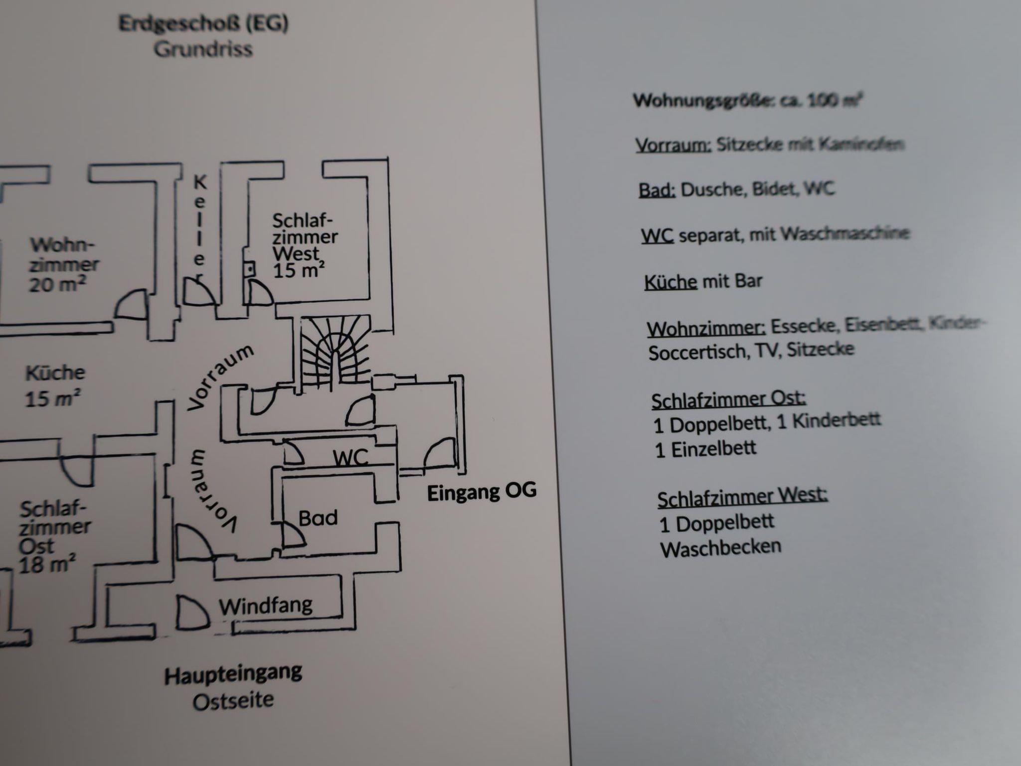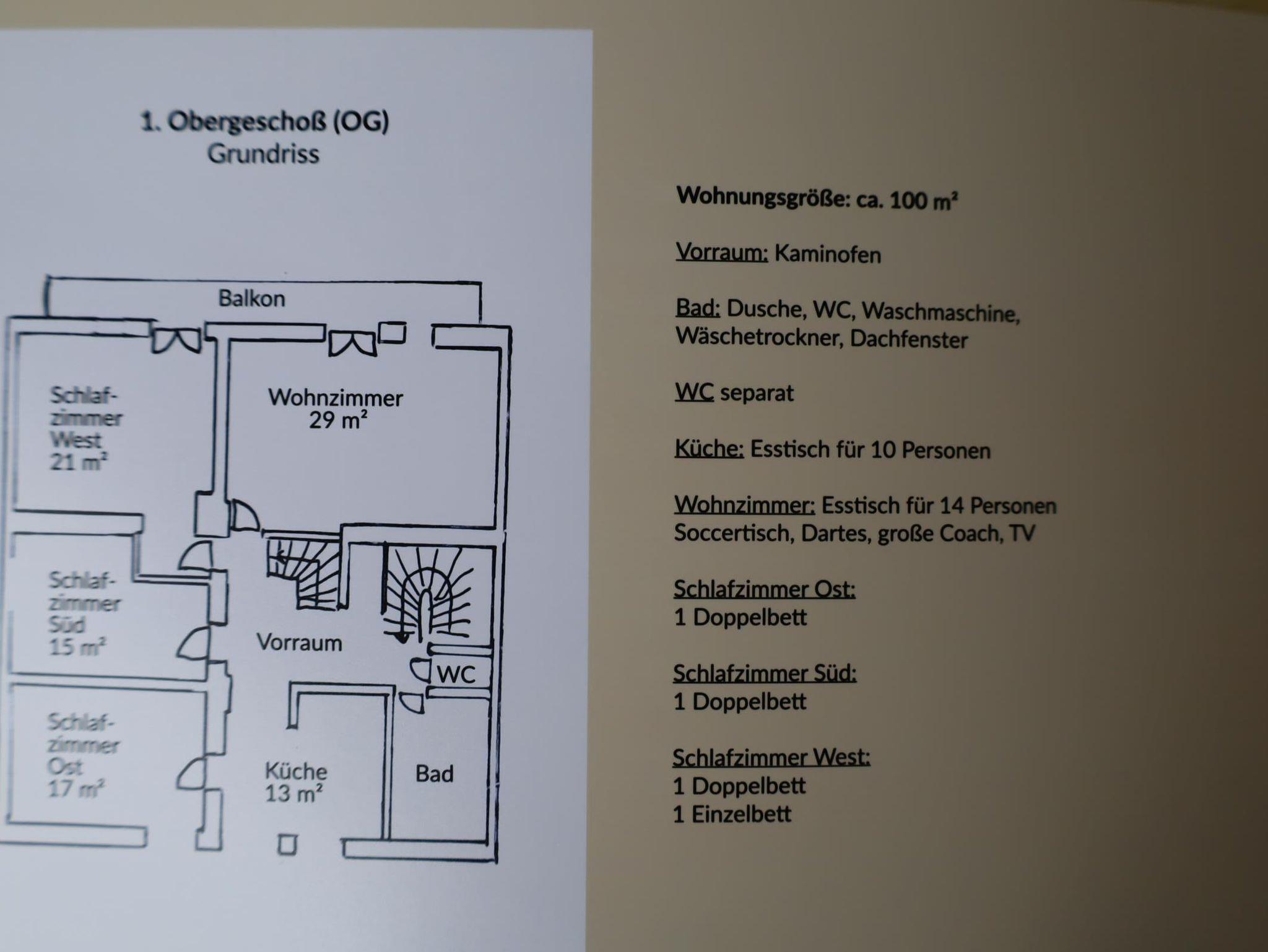 1. Obergeschoß: 100 qm, 2 Doppelzimmer, 1 Dreibettzimmer, Küche (Mikrowelle, Geschirrspüler, Esstisch für 14 Personen), großes Wohnzimmer, Tischfußballtisch, SAT-TV, CD-/DVD-Player, Bad (Dusche, WC), separates WC, Kaminofen, WLAN