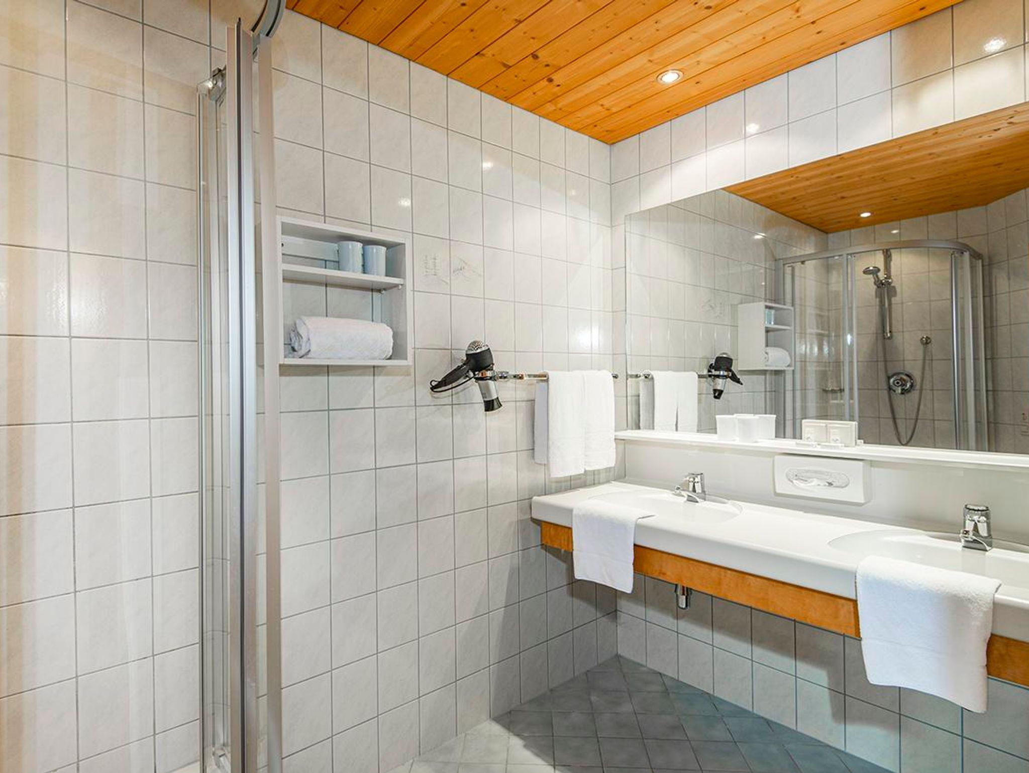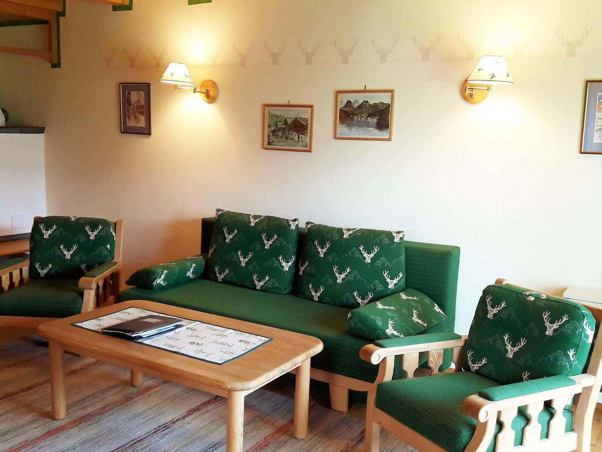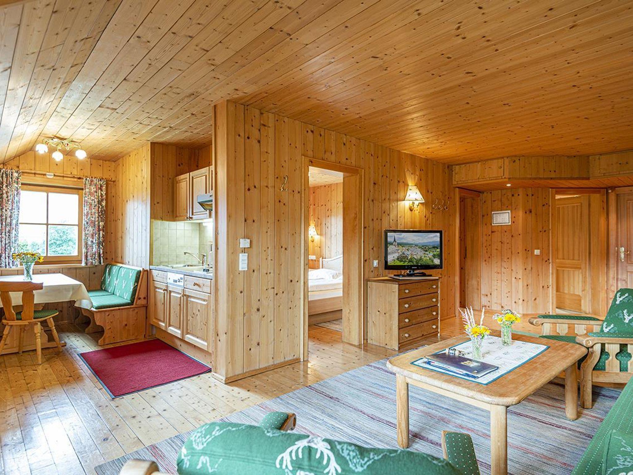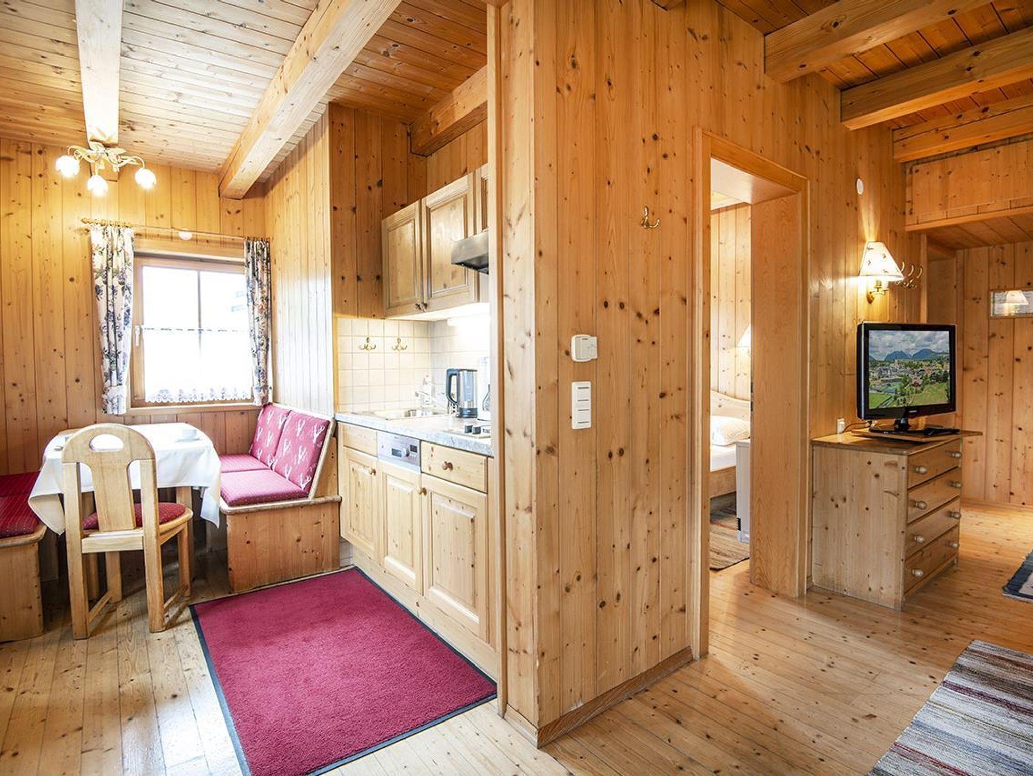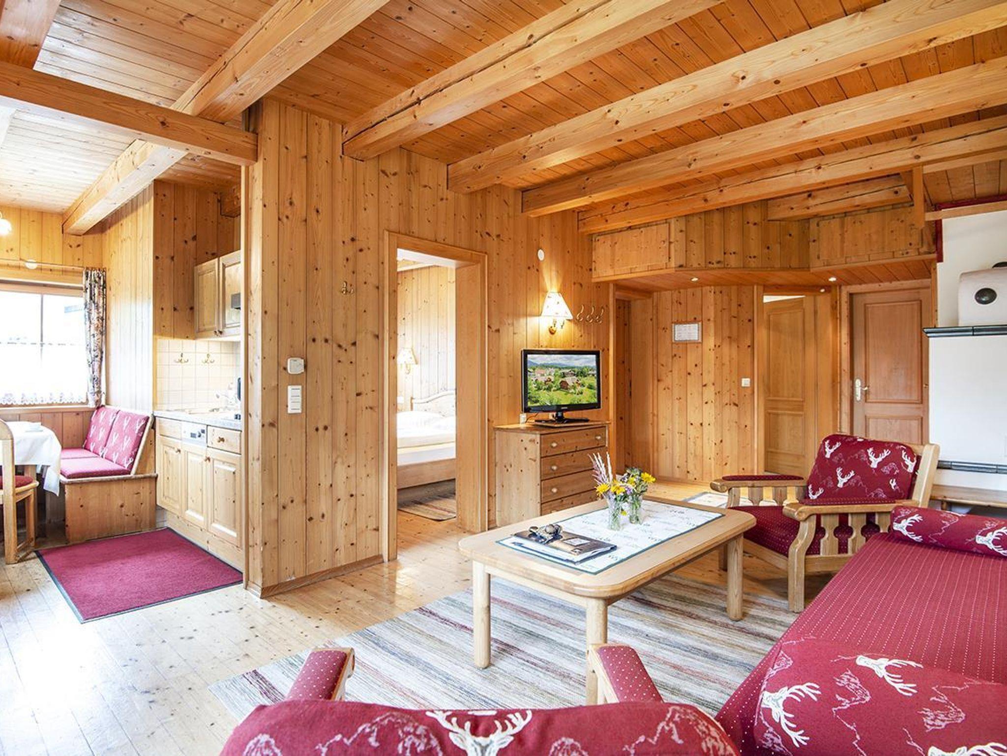2 getrennte Schlafzimmer (1 x Doppelbett und 1 x zwei getrennte Betten), ein gemütlicher Wohnraum mit Sitzgarnitur/Couch (ausziehbar für die 5. und 6. Person), Kachelofen, Flatscreen-Kabel-TV, W-LAN, Zimmersafe, Radiowecker, Kochnische (2 Ceranfeld-Platten, Kühlschrank mit großem Gefrierfach, Geschirrspüler, Abwasch, Kaffeemaschine, Koch- und Essgeschirr, Mini-Backofen, Mikrowelle), Tisch-, Bett-, und Toilettwäsche, Esstisch, Loggia bzw. Terrasse mit Gartenmöbel, Badezimmer mit Doppelwaschbecken und Dusche, Haarfön, separates WC, Holzfußboden, Elektroheizung, Autoabstellplatz bzw. Garage (Einzelbox).