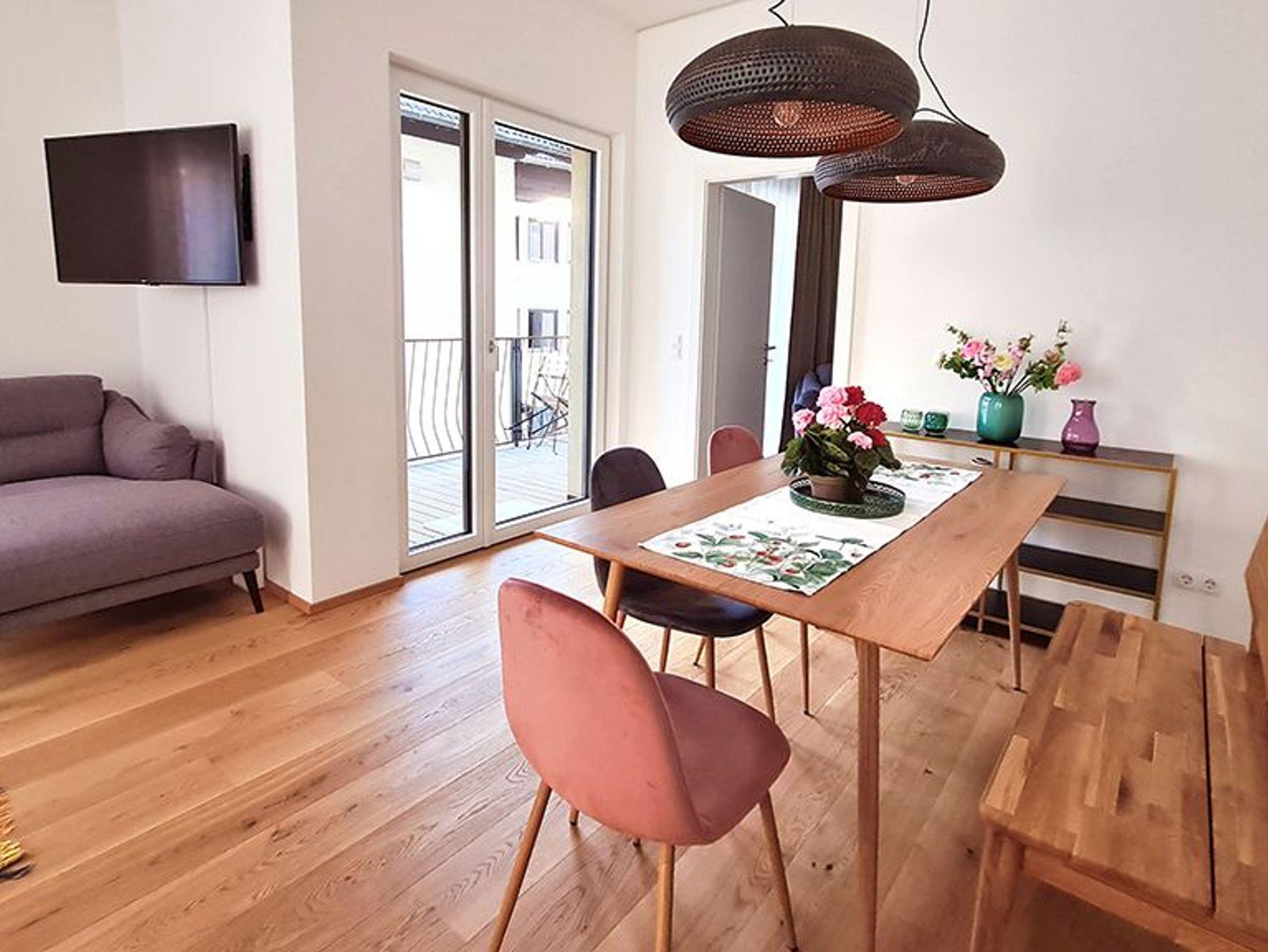 Die Ferienwohnung Franz befindet sich in einem 2020 neu errichteten Gebäude im sogenannten 'Obermarkt' von Mondsee, nur 3 Gehminuten vom historischen Marktplatz und der Basilika entfernt. Die Wohnung ist liebevoll modern eingerichtet und hat einen Balkon in Richtung Süden. In der Wohnung finden Sie zwei Schlafzimmer, eines mit einem Doppelbett, eines mit einem Etagenbett. Es gibt ein getrenntes WC und zusätzlich ein WC im Bad. Das Bad ist mit einer geräumigen Dusche und Handtuchheizkörper ausgestattet. Handtücher und Bettwäsche werden wöchentlich zur Verfügung gestellt. Sollten Sie einen häufigeren Wechsel benötigen, bitten wir um Information vor Anreise. Die Ferienwohnung ist sehr geräumig, hat einen großen Wohn-Essbereich mit einem Esstisch für 6 Personen und einem Küchenblock, an dem man auch sitzen kann. Sie finden in der Wohnung eine Waschmaschine, Wäscheständer zum Trocknen Ihrer Wäsche, Bügelbrett und Bügeleisen, in der Küche eine Mikrowelle, Toaster, Wasserkocher und Filter-Kaffeemaschine.