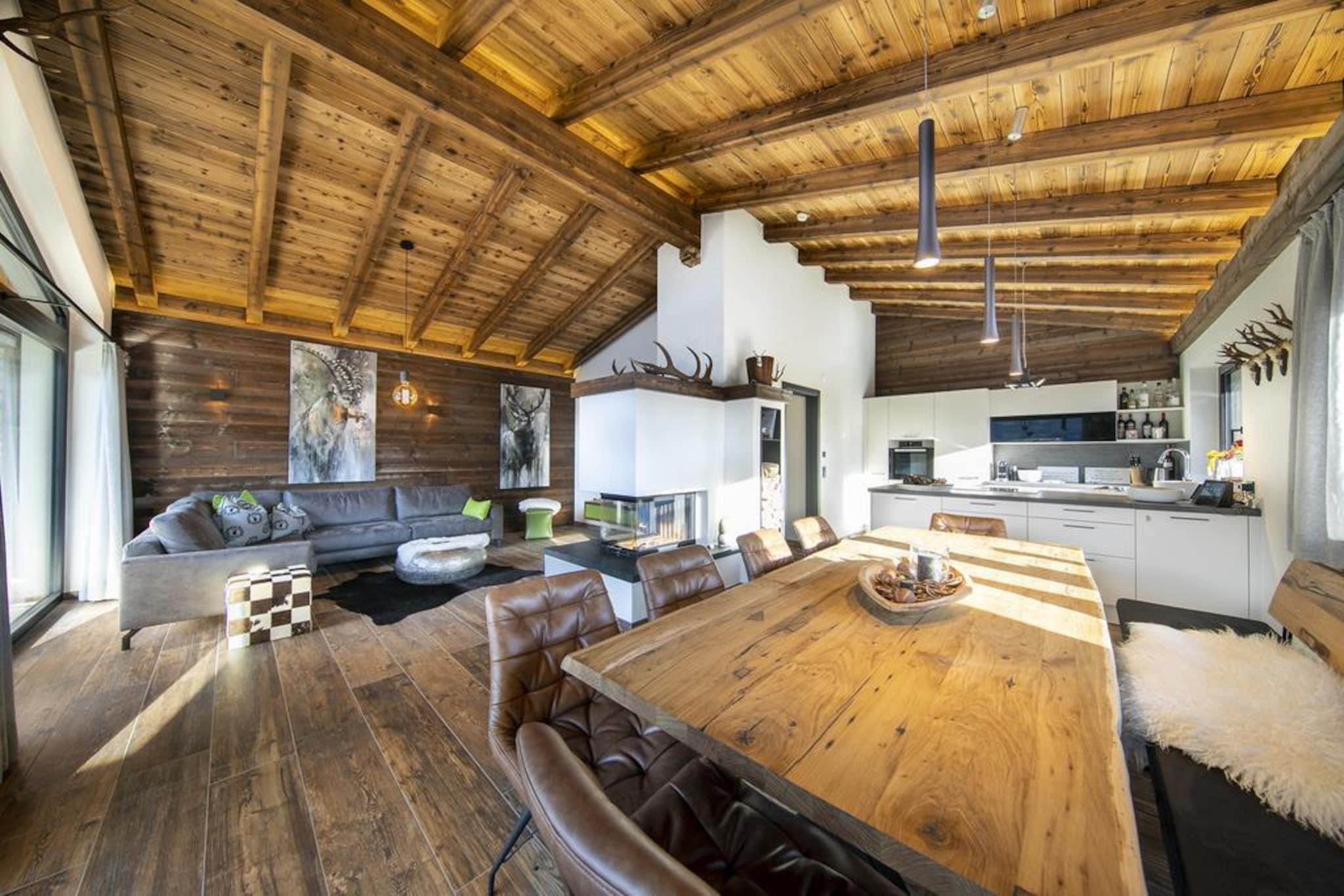 In a very special place, southwest of the well-known Neukirchen am Großvenediger and surrounded by the fresh mountain air, green meadows and beautifully snow-covered white hills, this very luxurious chalet has been built on the sunny slope of the Roßberg. The magnificent chalet has been designed with character. The use of lots of wood, specific details and a perfect finish in combination with the use of high-quality materials ensure a particularly comfortable and luxurious house. You will immediately feel at home. Your chalet, which you of course occupy alone, has three floors. One of the floors is the living floor, which offers an outstanding view with its huge window sections. In addition to a living and dining area with a cosy wood-burning stove, there is a modern open-plan kitchen equipped with up-to-date appliances. The bedrooms, which are spread over the floors, are very cosy and furnished to a high standard. In addition, you have your own private sauna. You can park your car (two stuccoes) in the partly covered parking spaces. There are other chalets in the immediate vicinity so a kind of village has been created. A ski rental with a ski school is centrally located. There is also a snack bar with a small menu for a snack or a drink. Would you like fresh bread rolls every day? No problem, these can be ordered at reception. The ski lift with practice meadow is within easy walking distance of the chalet and is perfect for families with small children or for beginners. Advanced skiers can be taken to the lift of the magnificent Wildkogel Arena ski area by the free ski bus. With the location right on the slopes, you can ski back to near your chalet if there is enough snow. Would you like to experience something different for once? The skiing areas at Zillertal Arena or Kitzbühel/Kirchberg are only a few minutes away by car. In summer, the surrounding mountains and the many sights in the immediate vicinity offer numerous opportunities for the active holidaymaker or those seeking peace and quiet. In the period from May to October inclusive, as a guest, you receive the National Park Summer Card with free access to the lifts, swimming pools, activities, public transport and much more. Really recommended! A supply of firewood is included in the price.