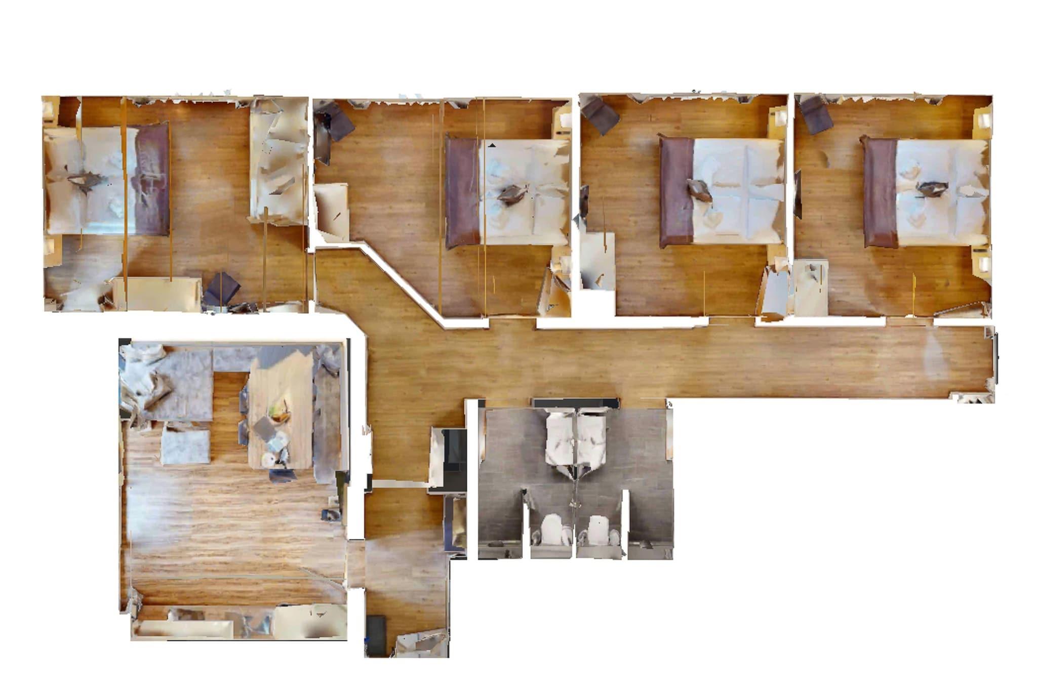 Kitchen, Living/diningroom, bedroom(double bed), bedroom(double bed), bedroom(double bed), bedroom(double bed, bunk bed), bathroom(shower, toilet), bathroom(shower, toilet), TV, stove, electric kettle, coffee machine, oven, microwave, fridge, tumble dryer, washing machine, balcony or terrace, baby crib(free)