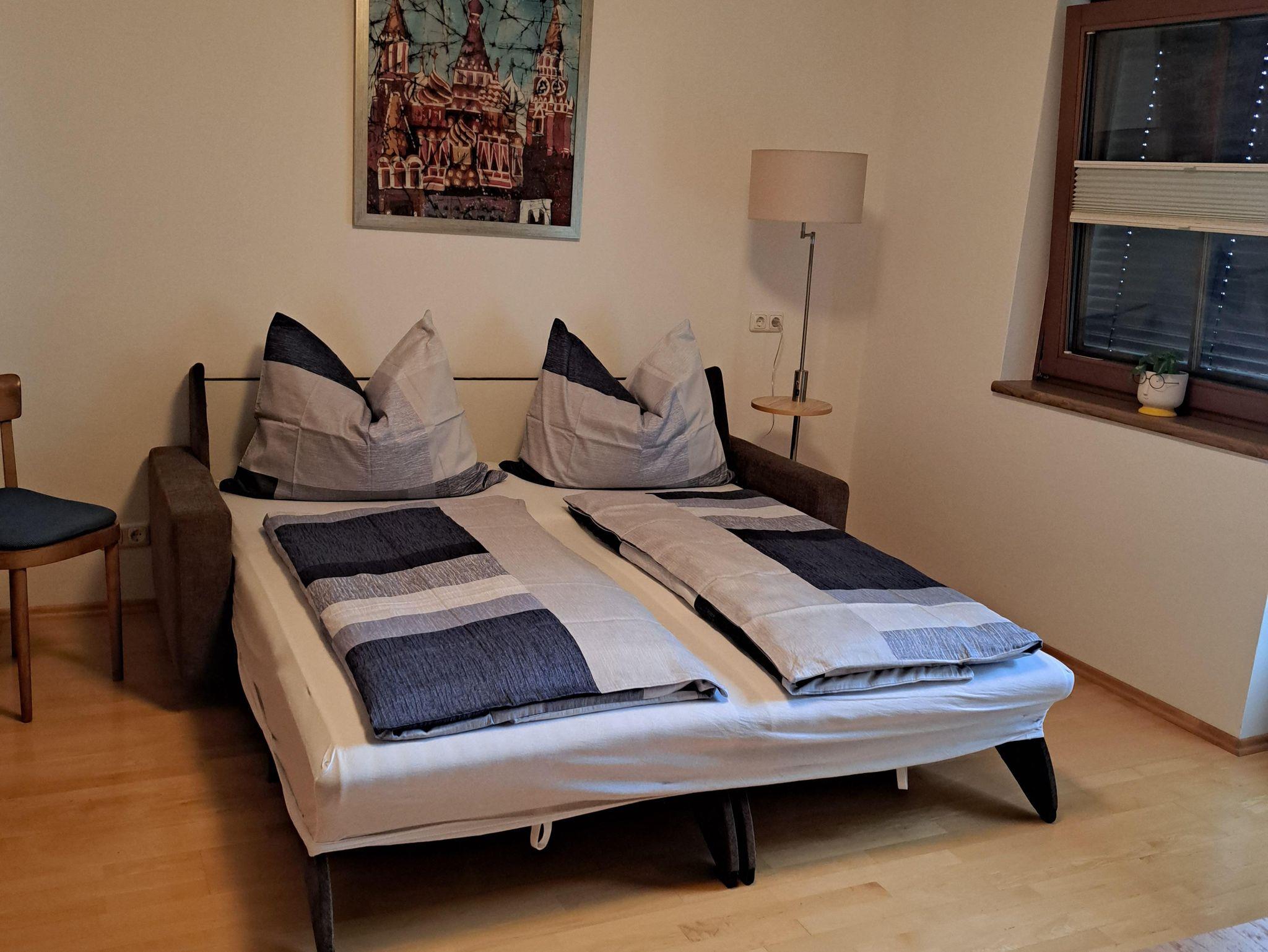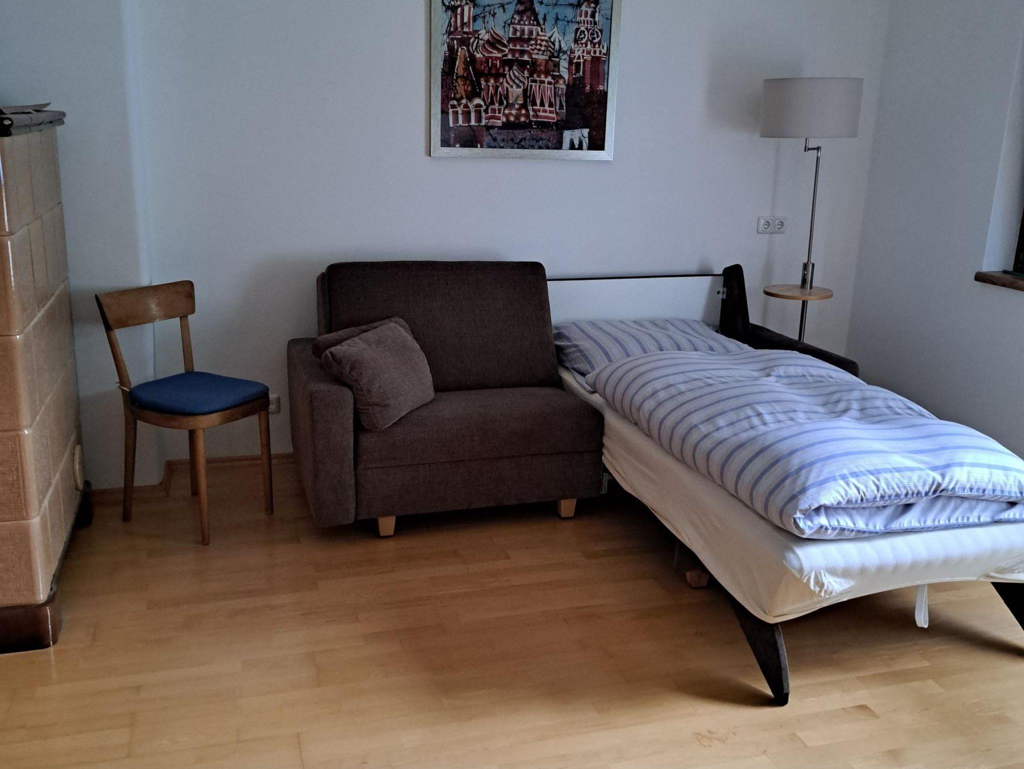 Wohn-/Schlafzimmer mit ausziehbarer Couch, Schreibtisch, Sat-TV