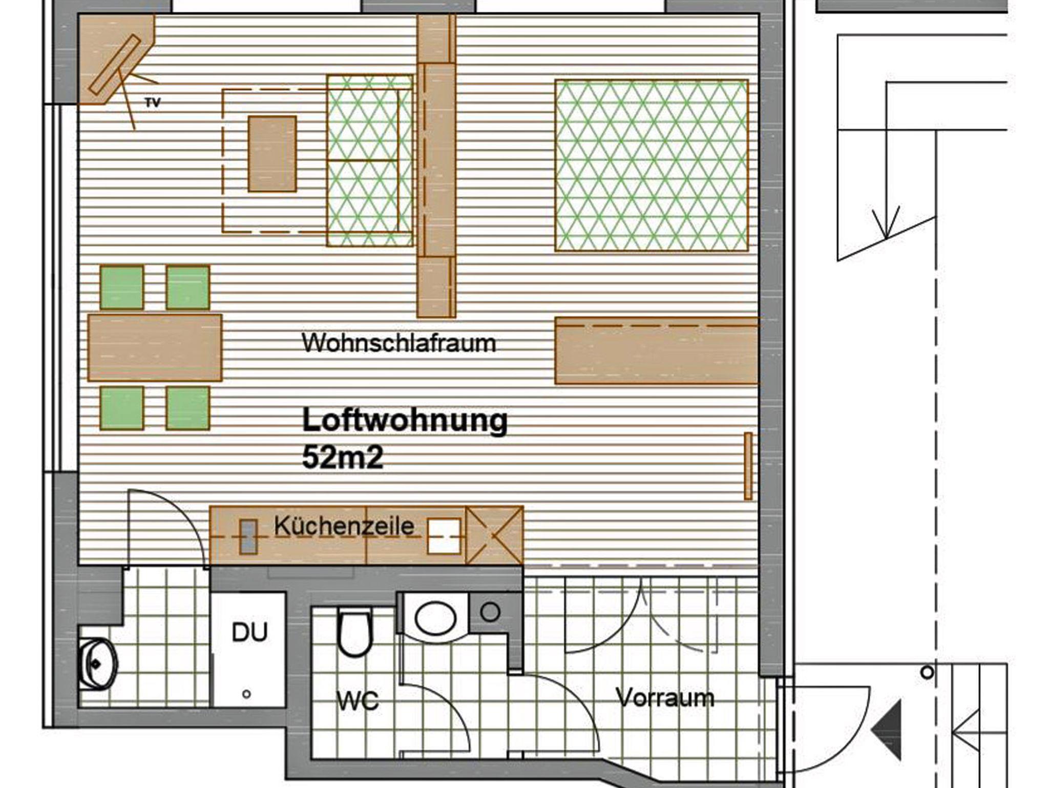Neue, ebenerdig gelegene, geräumige, helle lichtdurchflutete Loftwohnung mit 52m². Durch einen Vorraums betreten Sie den hellen 42 m² großen Raum. Hinter dem geräumigen Schiebetürschrank befindet sich das bequeme Vollholz-Doppelbett (180/200cm). Links von Ihnen befindet sich eine wunderschöne Küchenzeile (weiß/matt). Inklusive Geschirrspüler. Zwei Kommoden sind im Raumteiler inkludiert. Dahinter befindet sich eine gemütliche, ausziehbare Couch (KabelTV, WLAN). Eine Sitzgruppe (für 4 Pers.) bildet den Abschluß des Raumes. Dusche und WC sind räumlich getrennt.