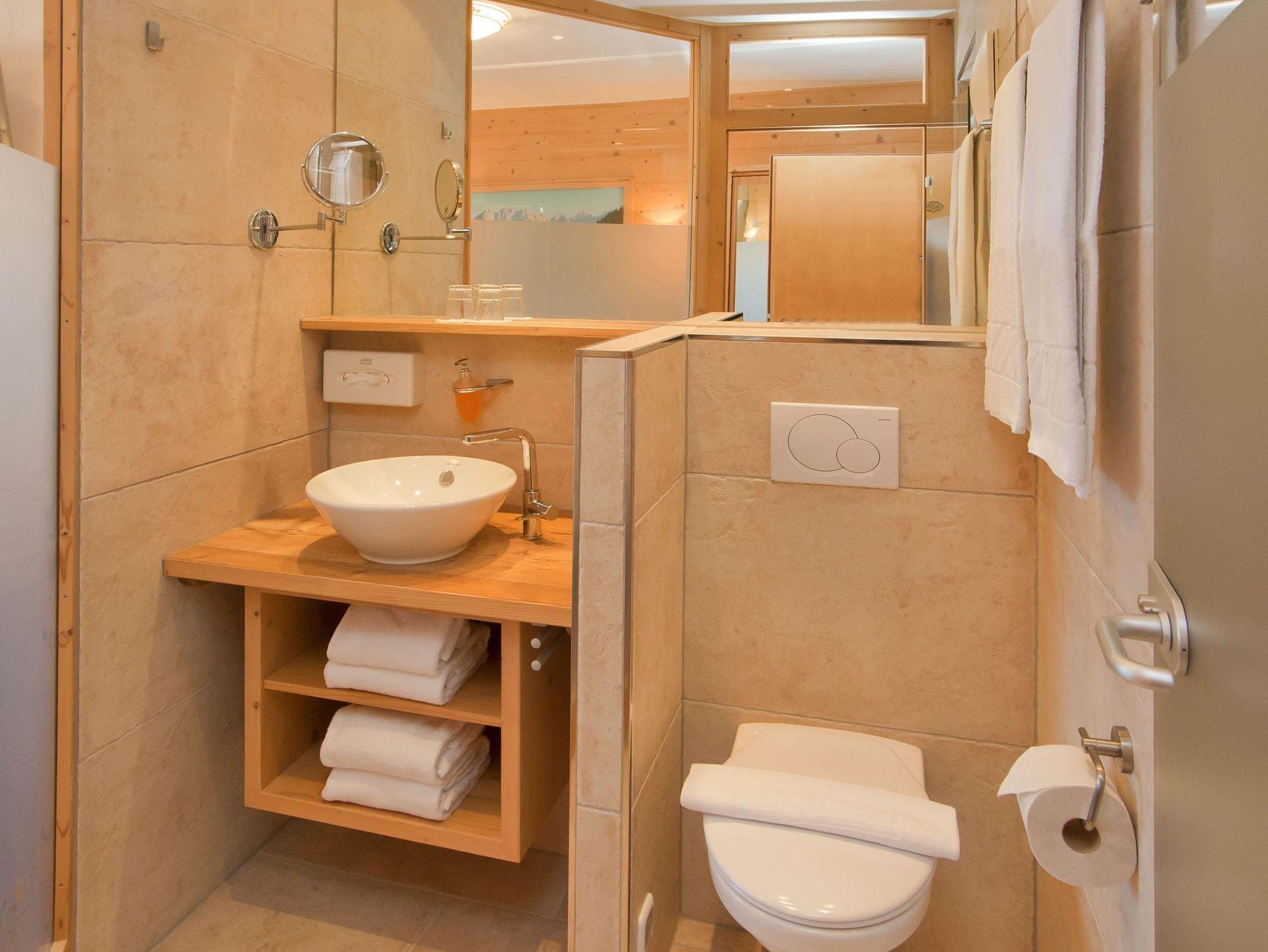 • Zimmer mit Loggia (verglast) : kleines Bad, Zimmer Waldseite größeres Bad, alle mit Du/WC, Haartrockner, Handtücher