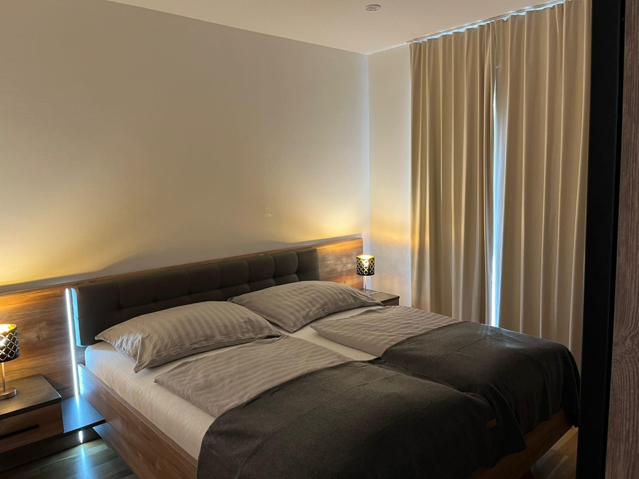 "Luxury Sunrise", 2-room apartment 75 m2 on 2nd floor. Spacious and bright, modern furnishings: large living/dining room with dining table, satellite TV and digital TV (flat screen). Exit to the balcony. 1 double bedroom. Kitchenette (oven, dishwasher, 4 ceramic glass hob hotplates, toaster, kettle, microwave, electric coffee machine, Capsules for coffee machine (dolce gusto) extra). Bath/shower, sep. WC, double hand-basin with corner bath. Underfloor heating. Parquet floors. Large balcony 28 m2. Balcony furniture. Facilities: washing machine, iron, hair dryer. Internet (WiFi, free). Parking space n 10 (roofed) at the house. Please note: non-smokers only. Maximum 1 pet/ dog allowed. Top equipped, modern apartment in an ideal location!