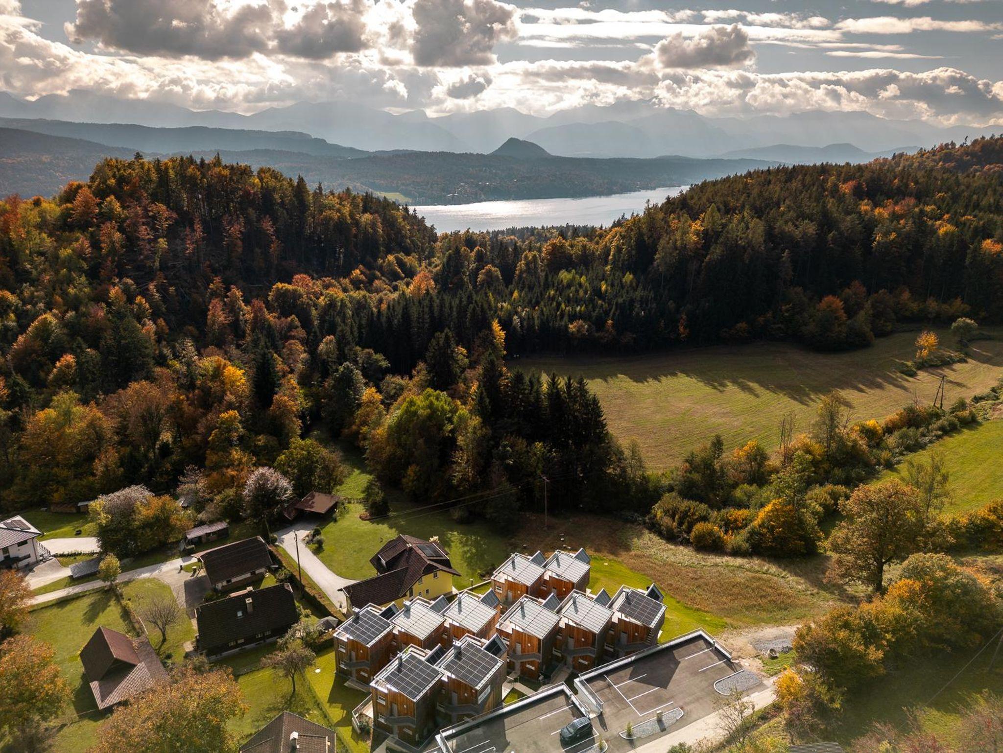 Gemütliche Holz-Lodges verbunden mit moderner, hochwertiger Ausstattung; ruhig mitten im Grünen und gleichzeitig seid ihr in wenigen Minuten direkt am Wörthersee. Auf 60m² Wohnfläche erwartet euch ein lichtdurchfluteter Wohn-Essbereich mit moderner, voll ausgestatteter Küche – ideal für gemeinsame Kochabende mit Familie oder Freunden. Die Küche lässt keine Wünsche offen. Zwei gemütliche Schlafzimmer – eines mit Doppelbett, das andere mit einem praktischen Hochbett – sowie eine bequeme Schlafcouch im Wohnzimmer bieten Platz für bis zu sechs Personen. An sonnigen Tagen genießt ihr eure Mahlzeiten auf eurer eigenen Terrasse mit kleinem Garten. Und wenn der Tag langsam ausklingt, wartet schon ein besonderes Highlight auf euch: die 50 qm große, private Dachterrasse mit gemütlichen Loungemöbeln. Hier seid ihr ungestört, vor Blicken geschützt – und der Sternenhimmel gehört ganz euch.