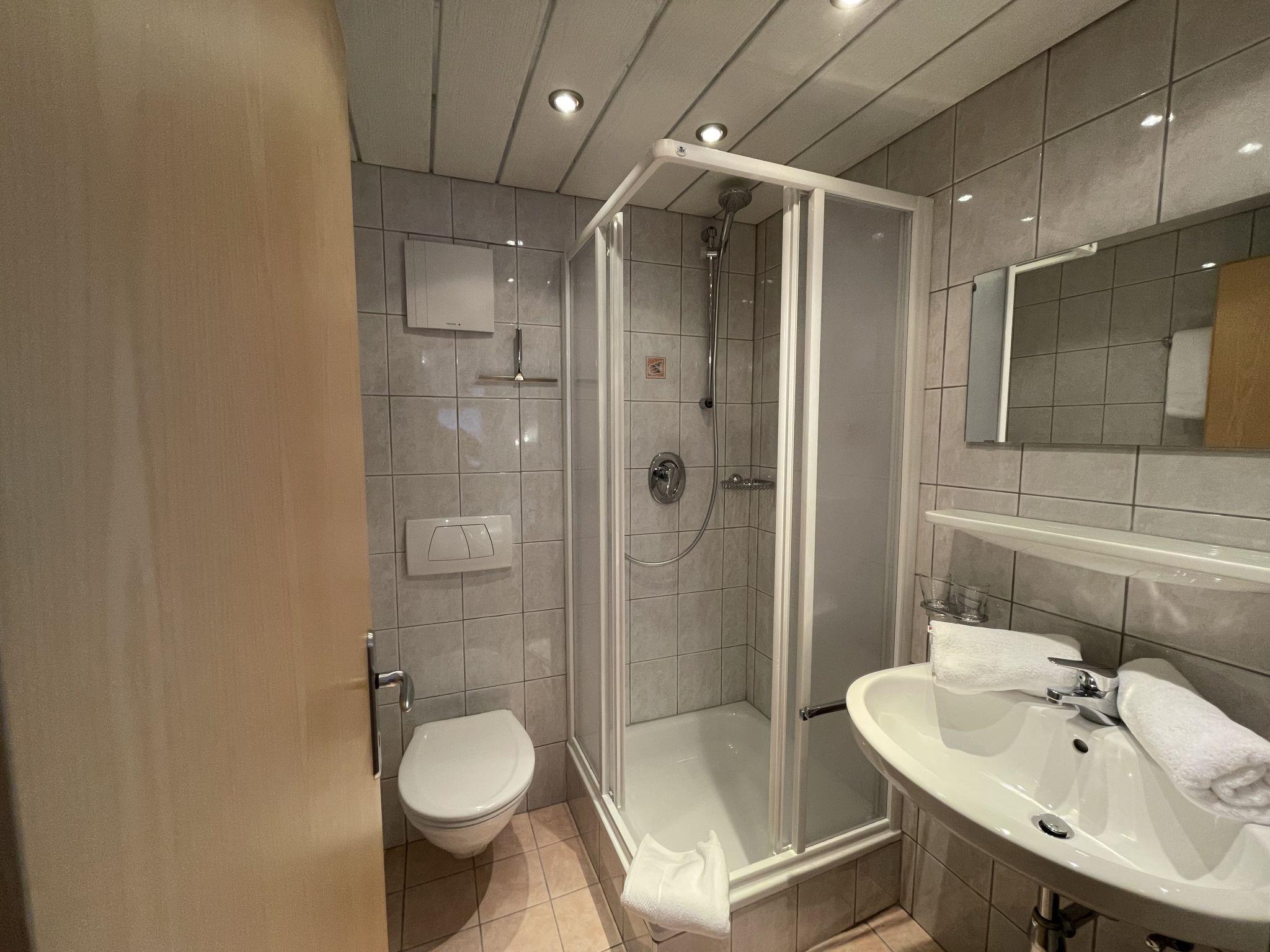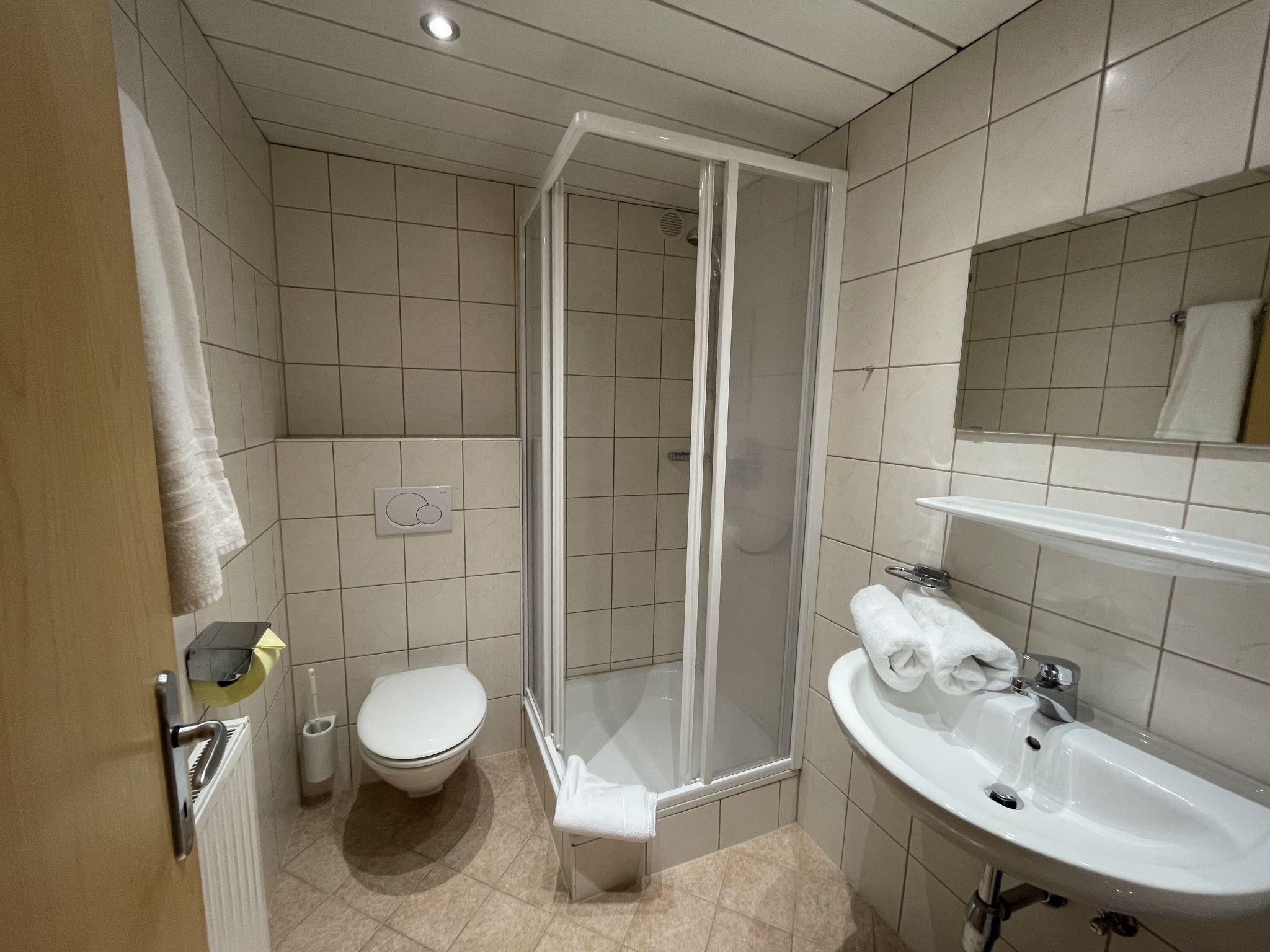 "Zentral", 6-room house 160 m2 on 3 levels. Bright, cosy furnishings: entrance hall. Upper floor: large living/dining room with satellite TV (flat screen). Exit to the balcony. Kitchen (oven, dishwasher, 4 ceramic glass hob hotplates, kettle, freezer, electric coffee machine). Sep. WC. 2nd upper floor: 3 double bedrooms, each room with shower/WC and satellite TV. 1 room with 2 beds, shower/WC and satellite TV. 1 double bedroom with shower and satellite TV. Sep. WC. Heating. Carpet. Large terrace 35 m2. Facilities: baby cot (extra). Internet (WiFi, free). Please note: non-smoking house. Smoke alarm.