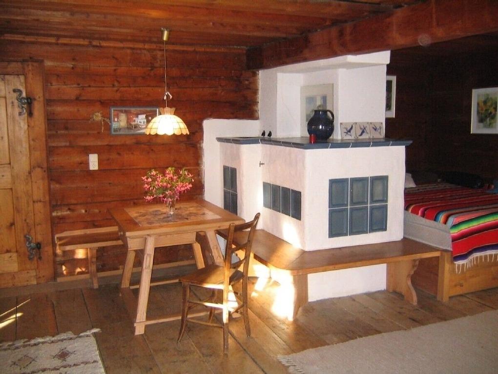 Im Wohnzimmer besteht die Möglichkeit das ein Erwachsener oder ein Kind hinter dem Kachelofen schlafen kann.
