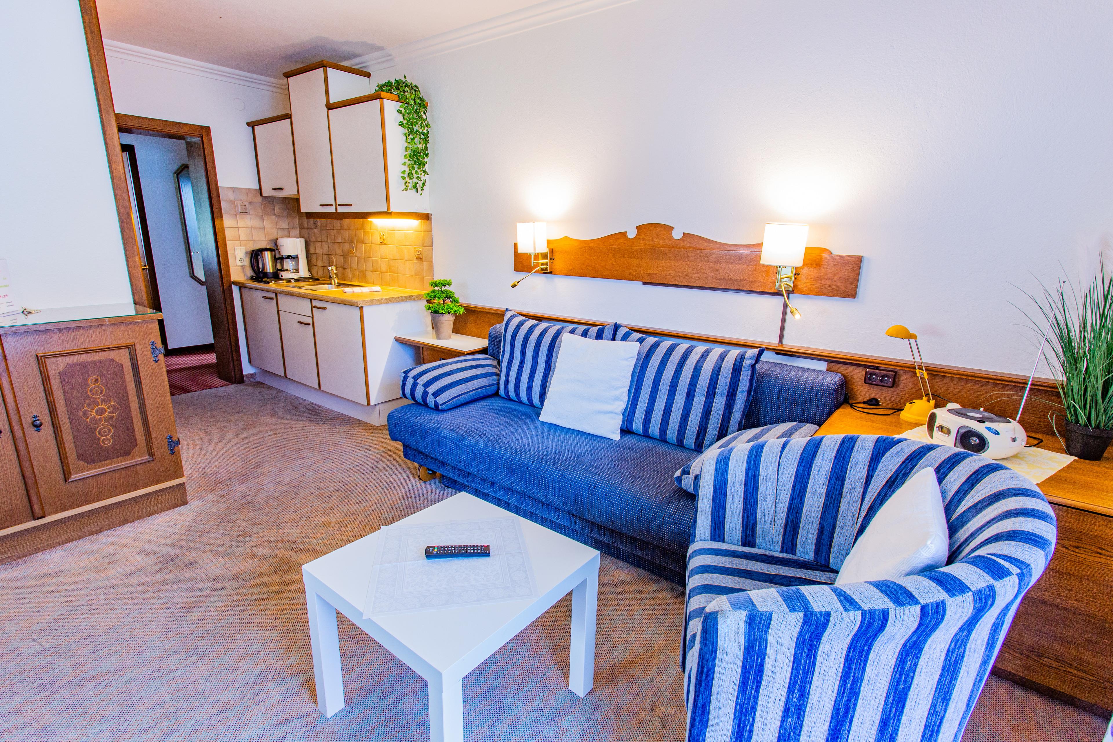 Ein helles geräumiges Apartment mit einem riesigen Balkon rund um die Ferienwohnung. Das gemütliche Wohnzimmer mit einer Schlafcouch, einem Esstisch mit 5 Stühlen und einer Kochnische bietet alles, was man für einen entspannten Urlaub benötigt.