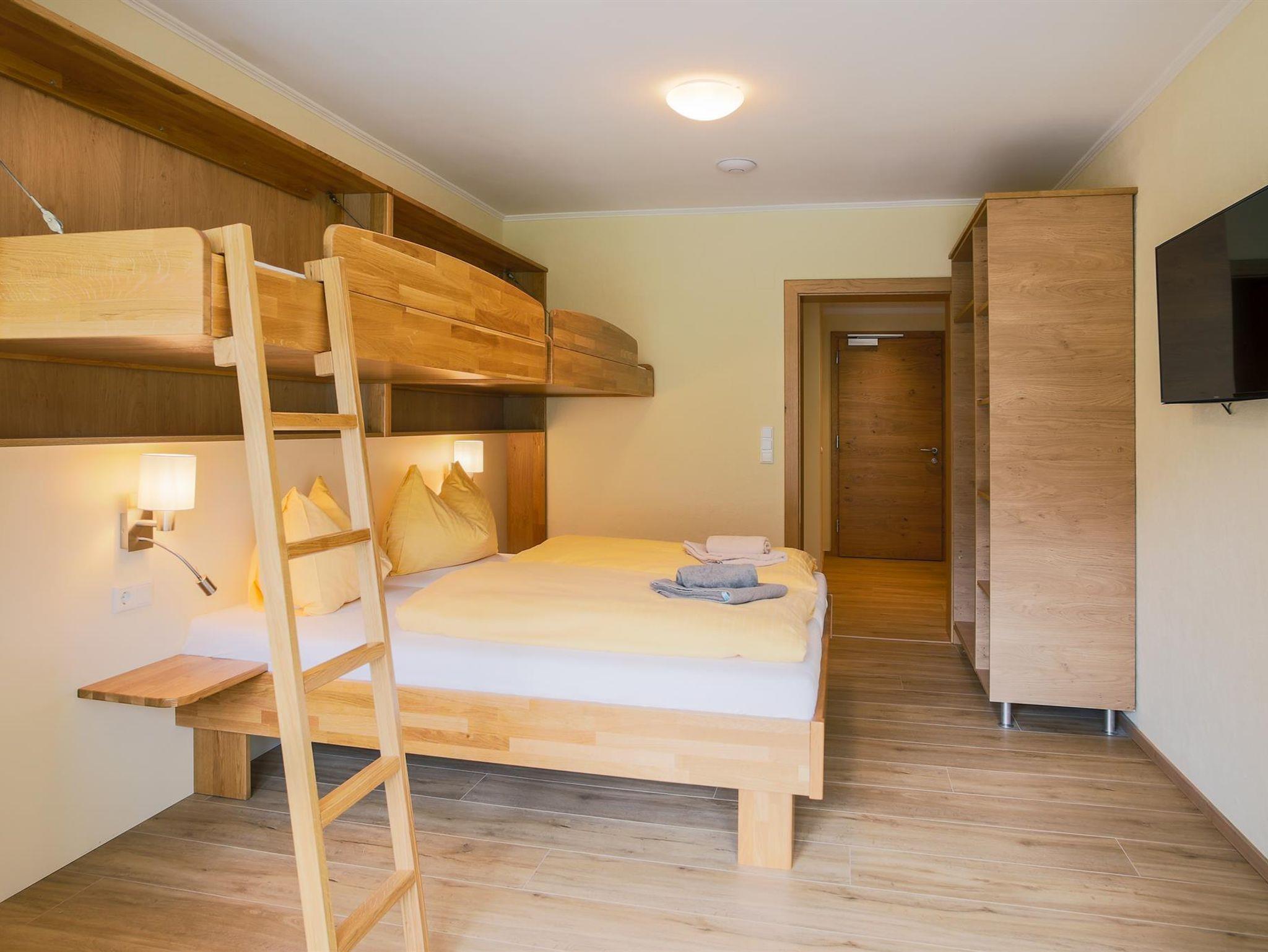 Das Appartement ist bis zu 8 Personen buchbar und hat 2 getrennte Schlafzimmer (2 Doppelzimmer mit jeweil 2 Klappbetten über dem Doppelbett), Küche mit Sitzecke, Dusche, separates WC, TV, Vorraum und eine Terrasse