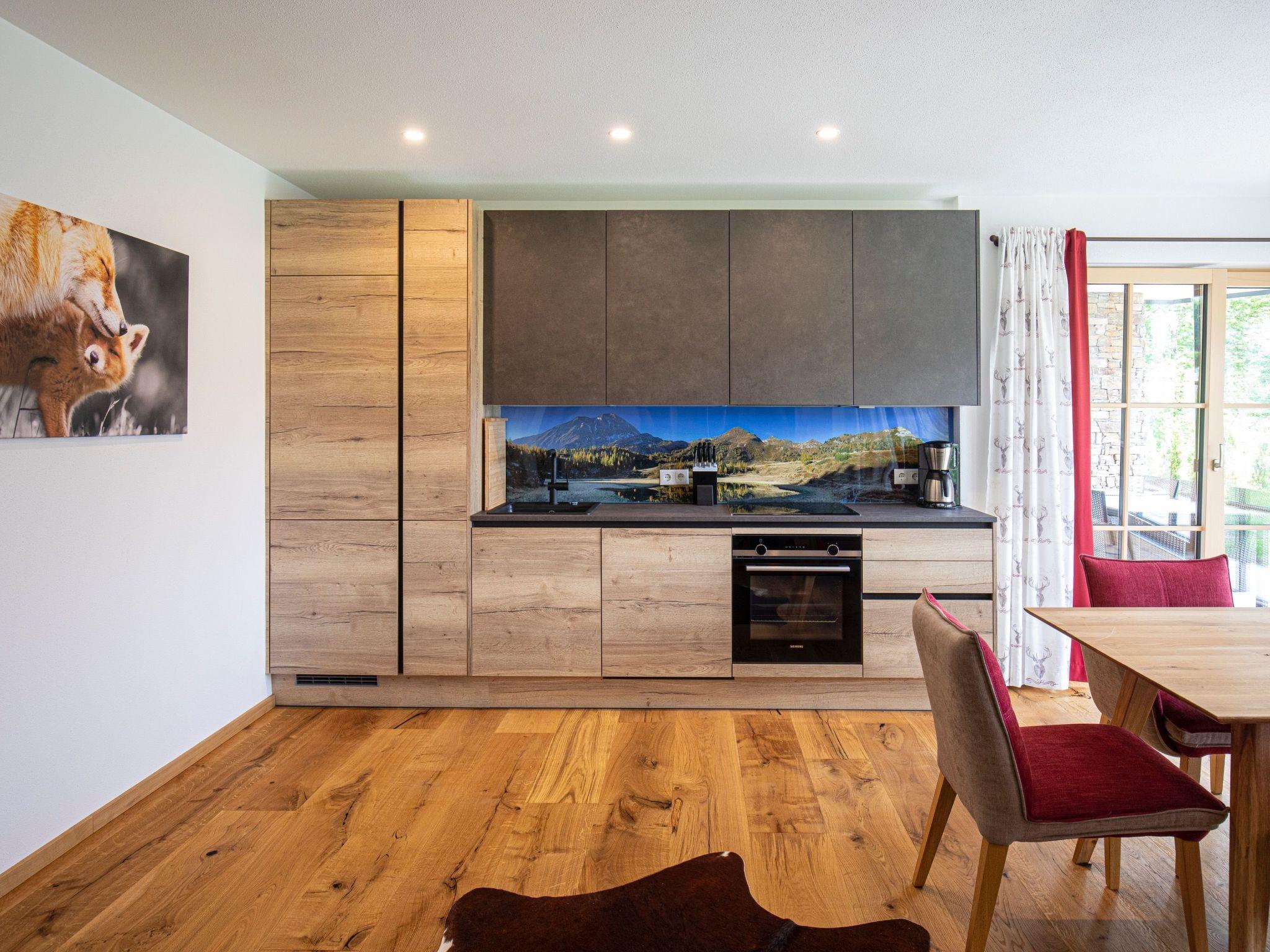 Our brand new Dachstein Chalet is located in a quiet and sunny residential area, directly adjacent to spacious grassland areas and with a magnificent view of mountains, green meadows, forests and in winter directly on the ski slope. The distance to the ski lift is around 900 metres. The village centre is around 350 metres away. In the winter season, the free shuttle bus to the lift stops right in front of the house and takes our guests to the lift and back.