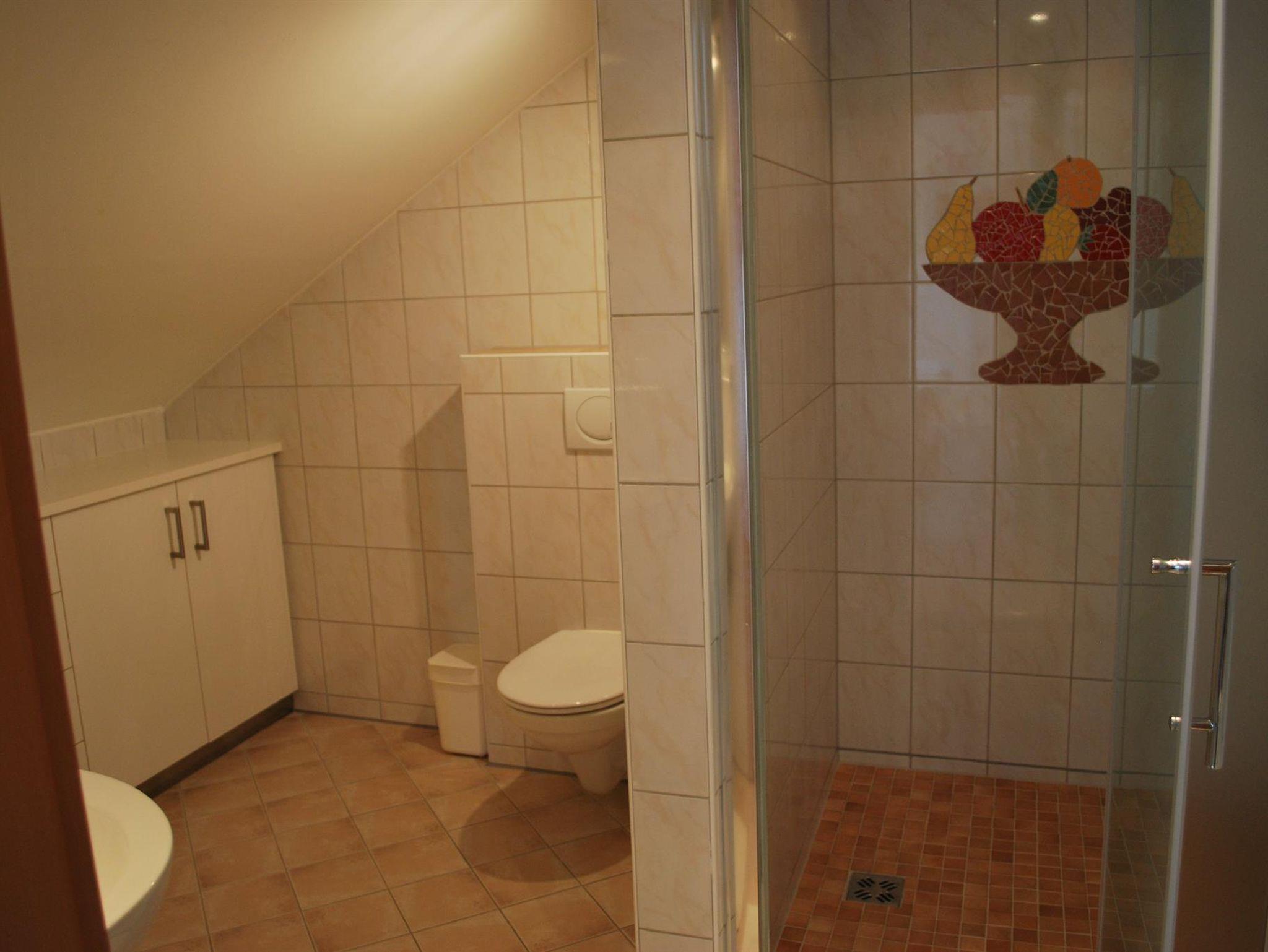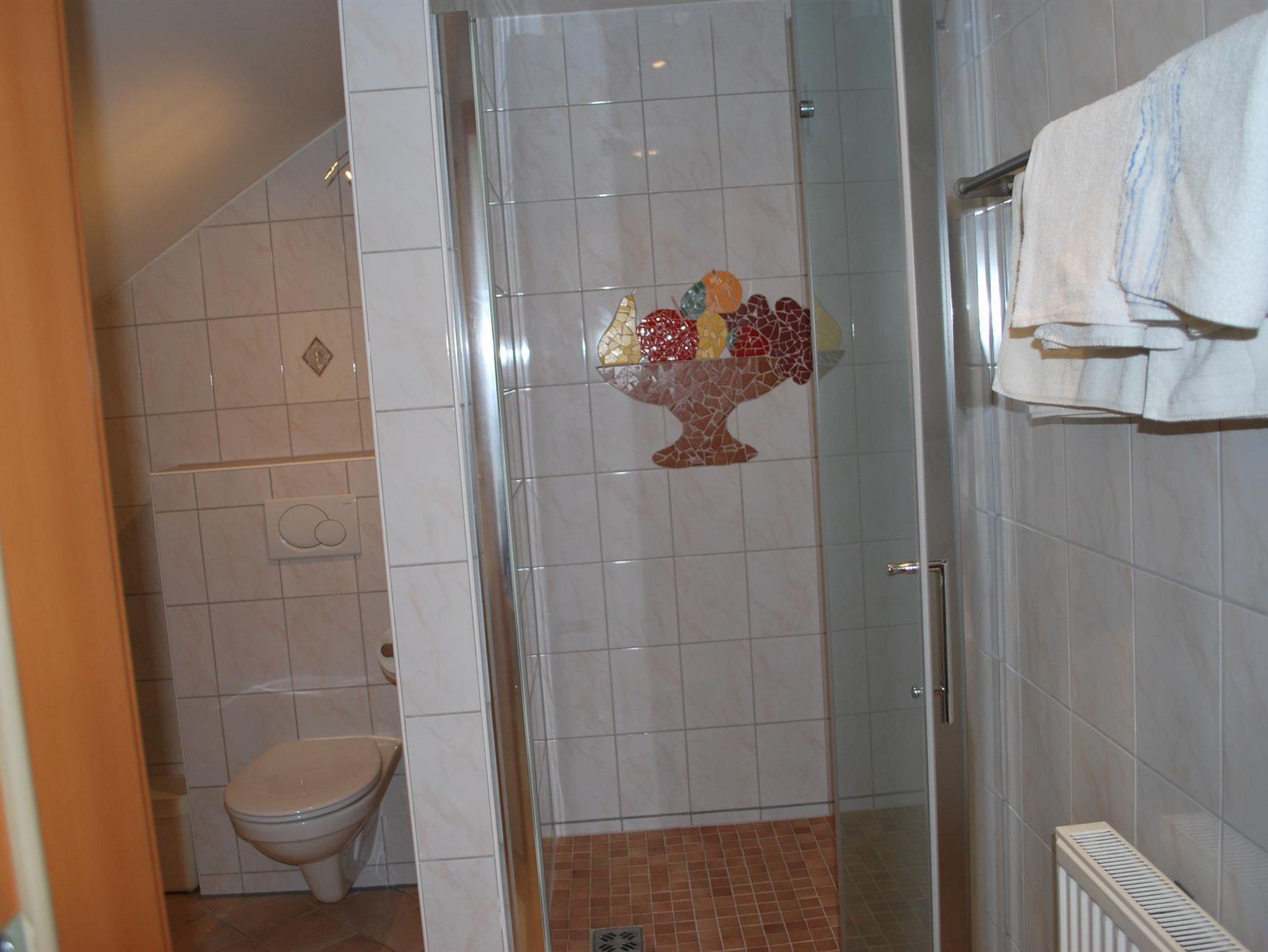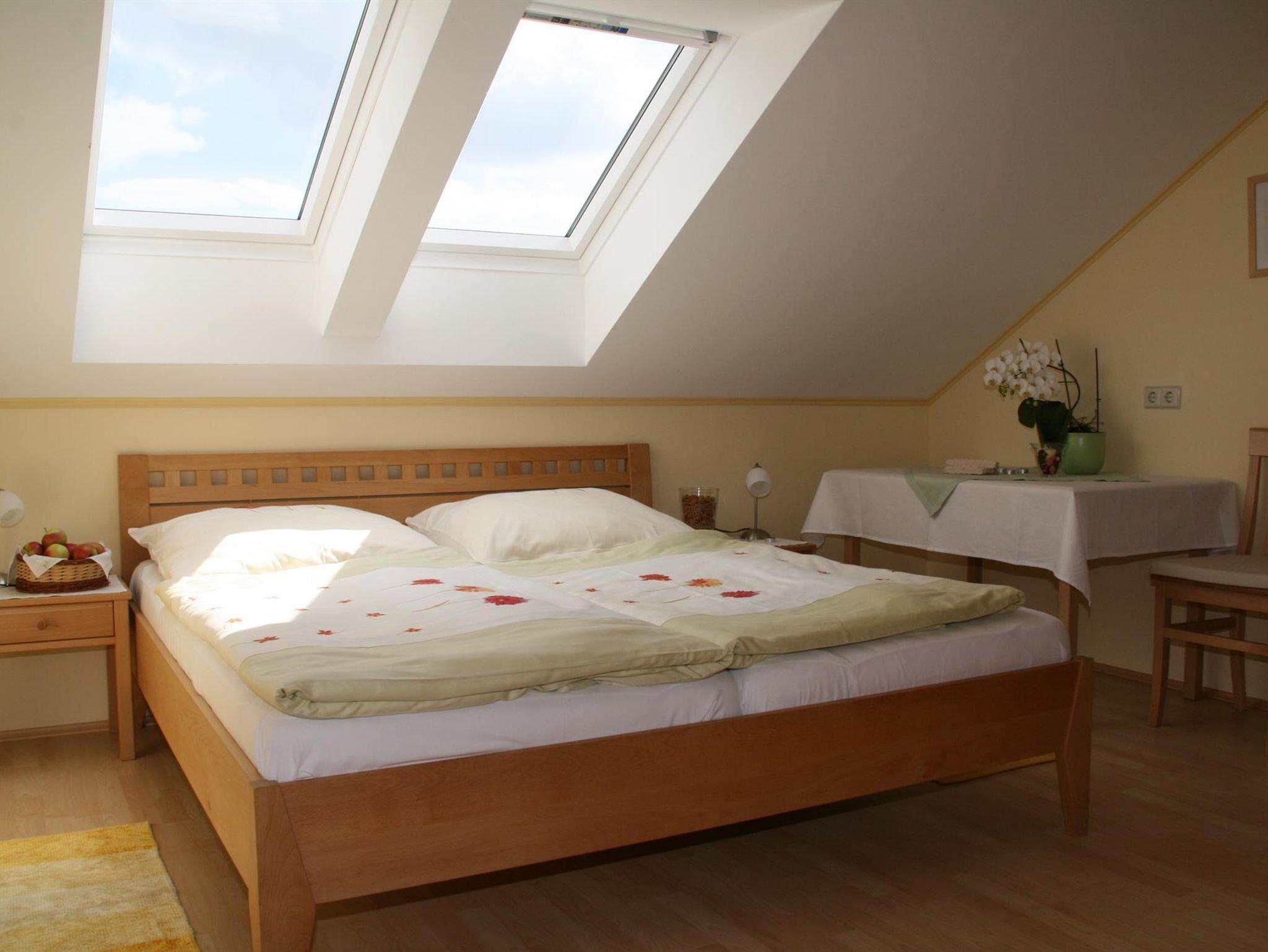 Ruhiges Doppelzimmer mit großzügigem Badezimmer mit Dusche und WC. Fernseher mit SAT-Anschluss. Die Dachflächenfenster bieten einen Ausblick auf den Sternenhimmel.