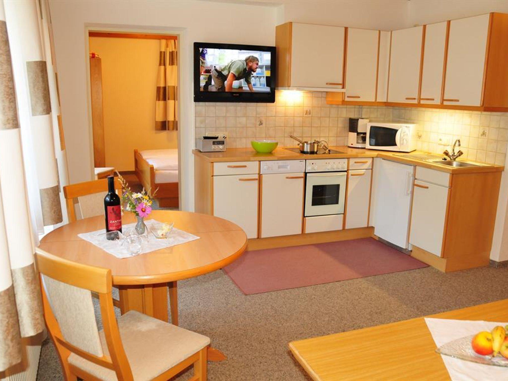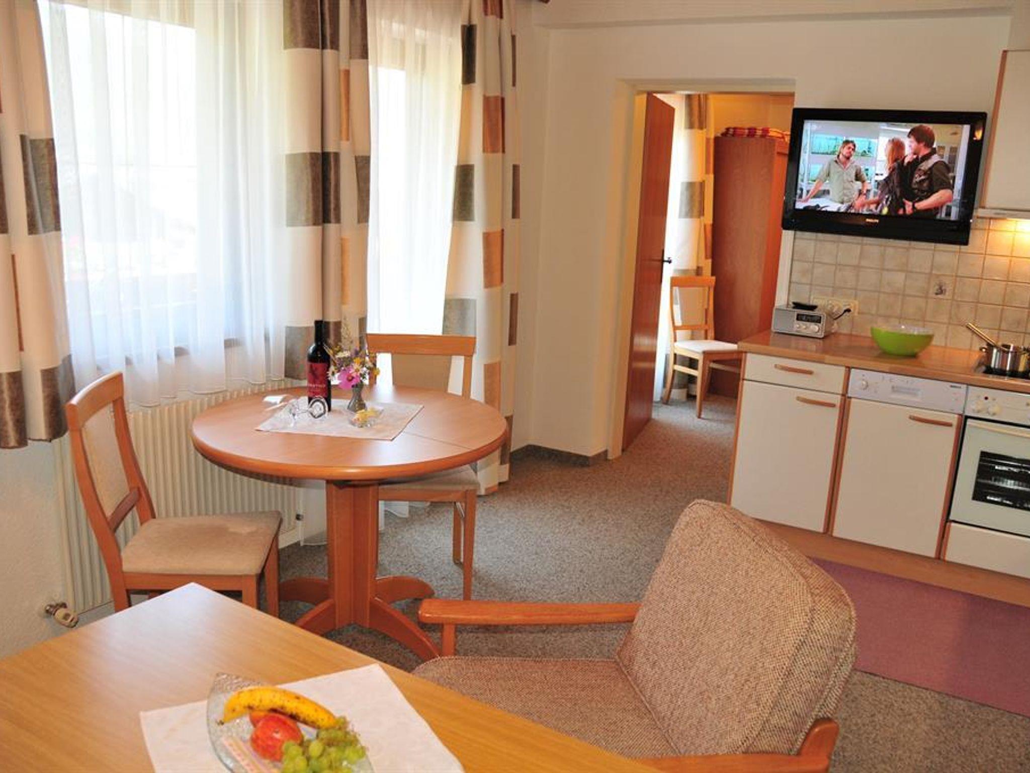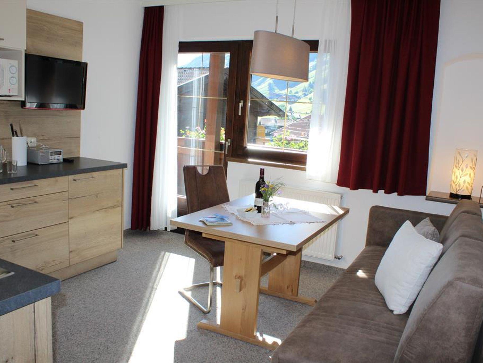 Appartement Nr.1: 35 m², Vorraum mit Garderobe, Wohnraum mit Couch u. Couchtisch, TV, Radio, Esstisch, Küchenzeile (E-Herd, Kühlschrank mit Gefrierfach, Kaffeemaschine, Wasserkocher,), ein Doppelzimmer, Dusche/WC, Balkon Westseite-schöne Aussicht.