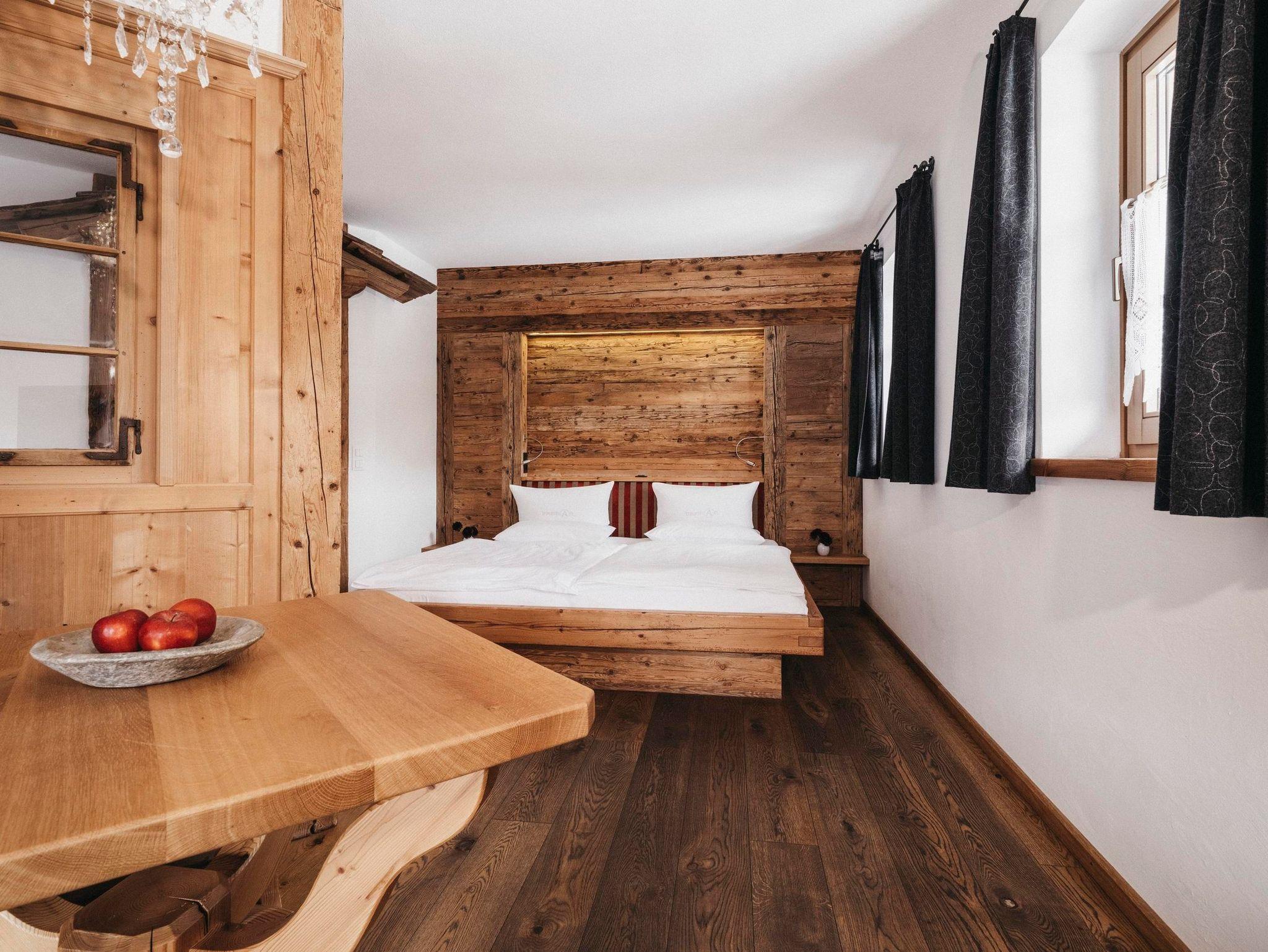 exklusive Ausstattung mit Holz aus dem 16. Jh., extra großes Doppelbett 210 x 200 cm, Schlaf- und Wohnbereich mit Kachelofen, Sitzecke und Diwan, Bad mit Dusche, Badewanne, Doppelwaschbecken, Handtuchtrockner, Haarfön, beleuchteter Schminkspiegel, getrenntes WC mit Bidet, SAT-TV, Radio-TV, Zimmersafe, Telefon, Möglichkeit zur Stromabschaltung im ganzen Zimmer (z.B. für einen besseren Schlaf), Naturholzboden, Balkon oder Terrasse (nicht behindertengerecht)