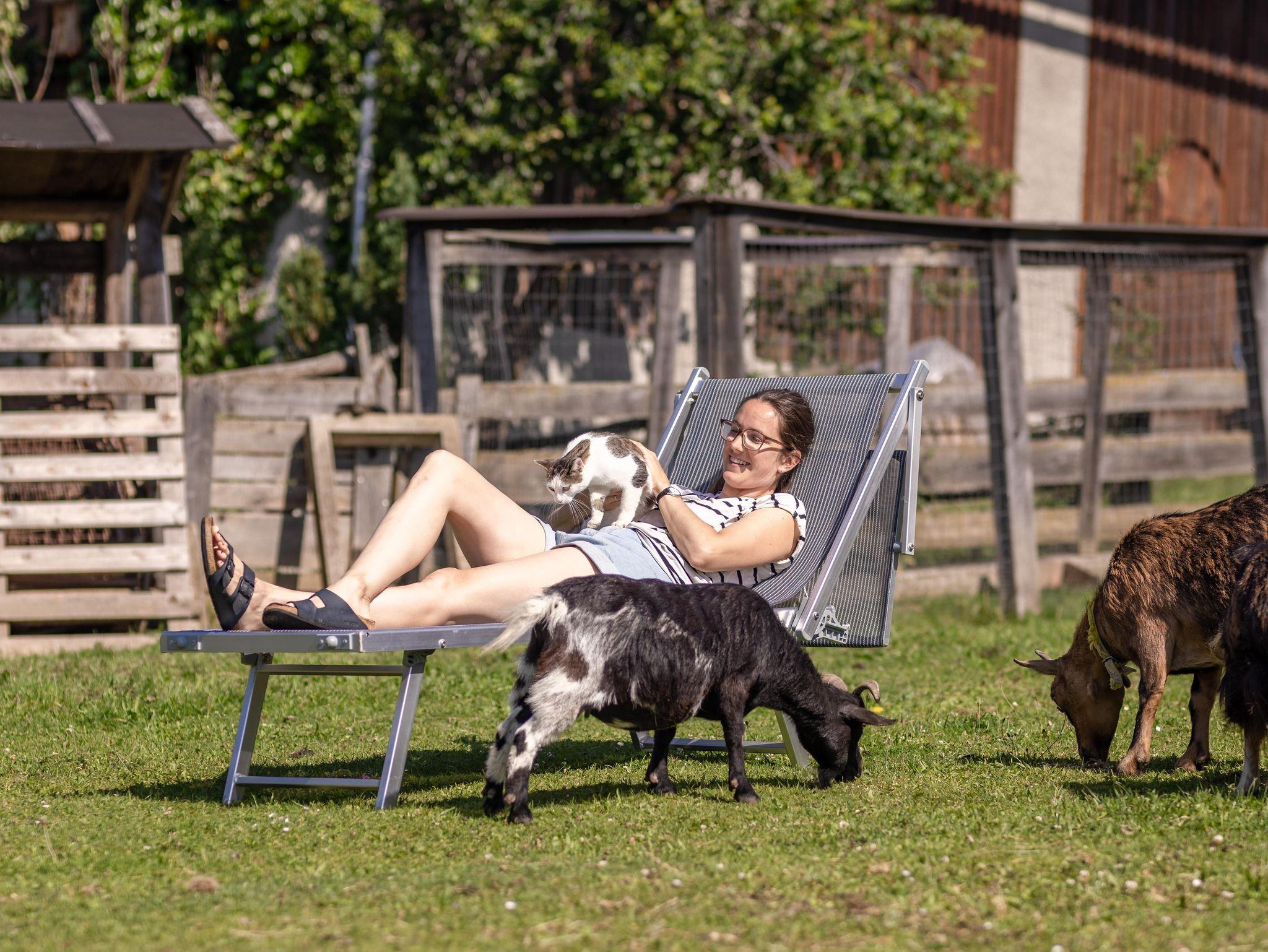 Unser Ferienhaus liegt am Ortsrand mit großer Spielwiese und kleiner Viehhütte für unsere Streicheltiere, Gartenhaus mit Grillmöglichkeit, Tourentipps, Wanderkarten zum ausleihen, Überdachter PKW Parkplatz. Spieleraum mit Tischtennis, Tischfußball, Dart und Stadelkino. Auf unserem Hof gibt es Kühe, Hühner, Katzen, Zwergziegen Jenny und Ella und unsere beiden Eselin SINA.