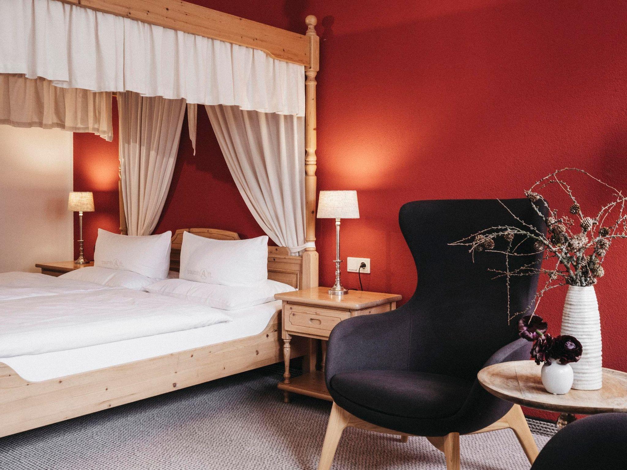 Himmelbett-Zimmer (Nichtraucher): 40 m² ohne Balkon, für 2 Personen, Sitzecke, Bad und Dusche, Doppelwaschbecken, getrenntes WC mit Bidet, Haarfön, beleuchteter Schminkspiegel, Sat-Tv, Radio-Tv, Zimmersafe, Telefon, Stromfreischaltung, Naturholzmöbel