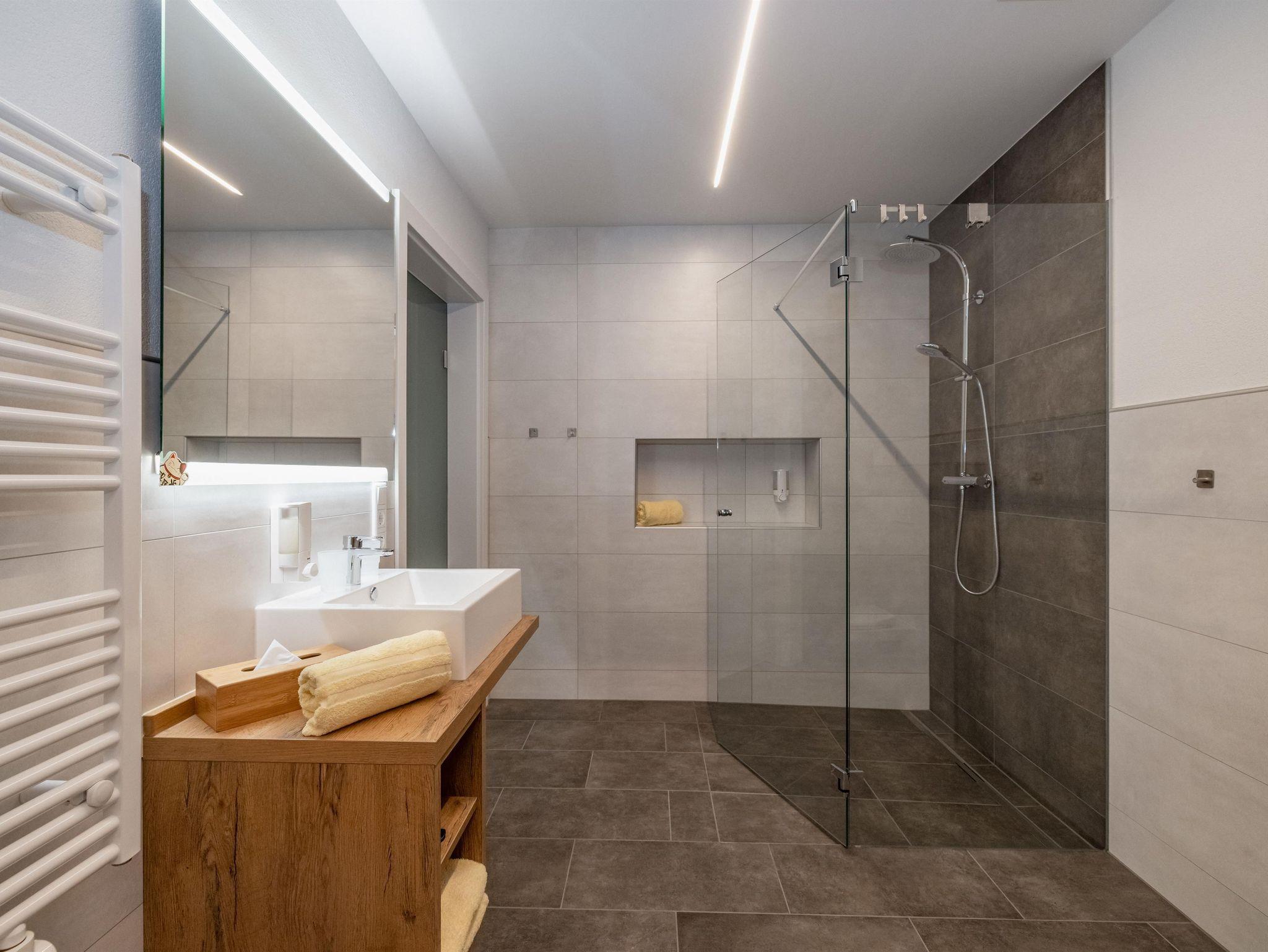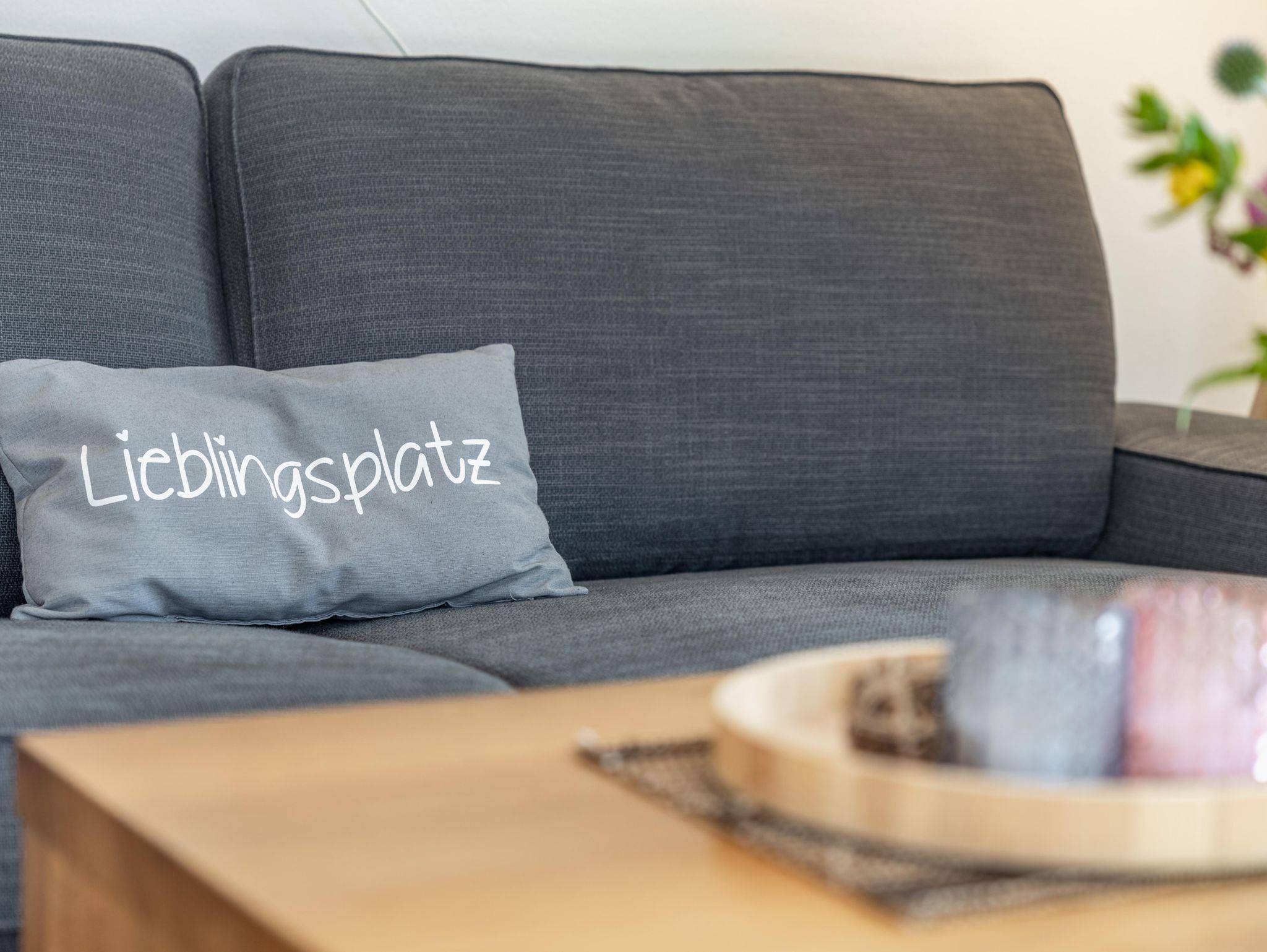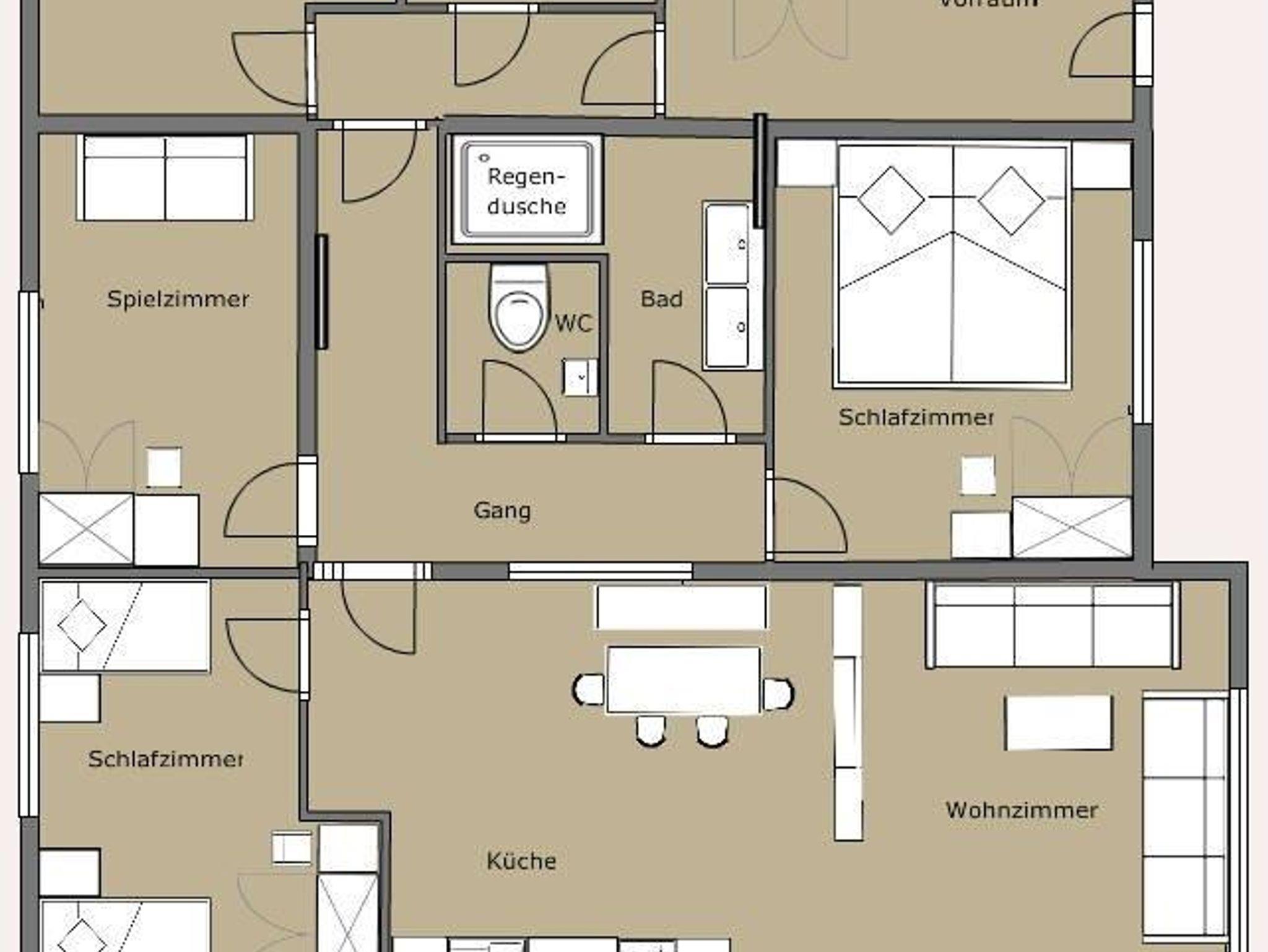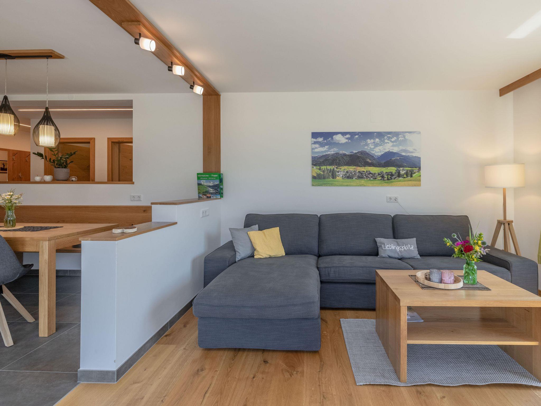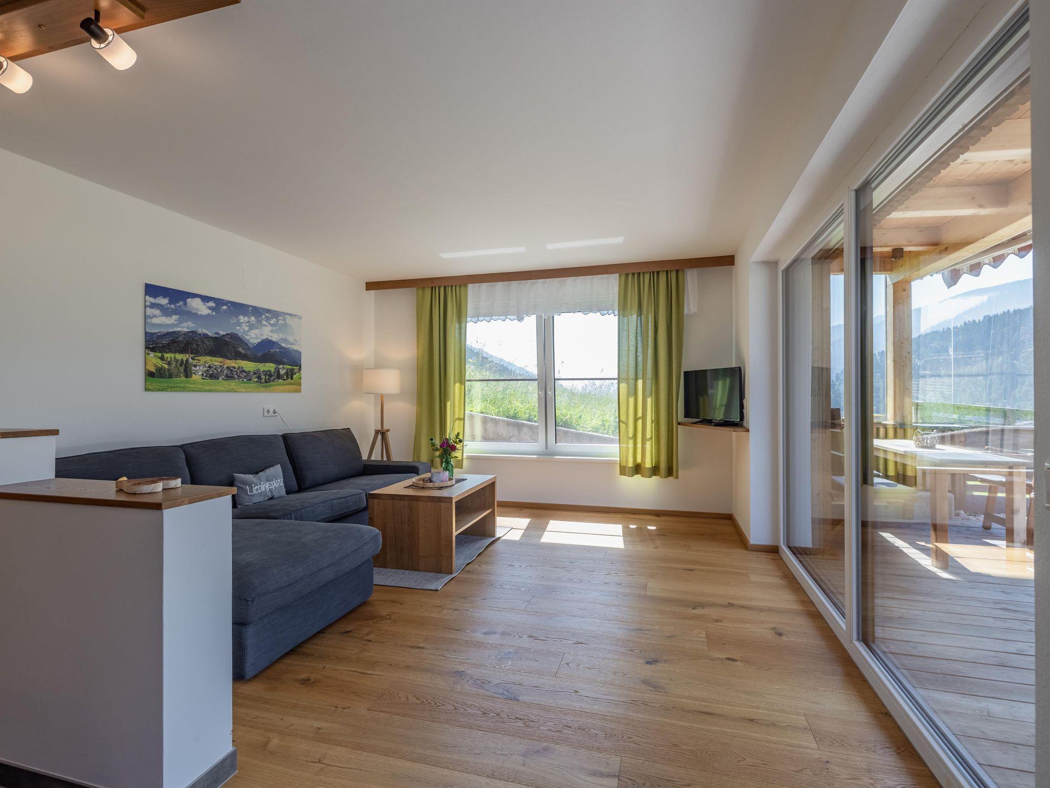 Die Wohnung mit 90m² (+ 24m² Südterrasse) für 2-4 (6) Pers. ist barrierefrei und besteht aus einem offenen Wohn-Koch-Essbereich (Geschirrspüler, E-Herd mit Backrohr und Dunstabzug, Kühlschrank mit Gefrierfach, Mikrowelle, Kaffeemaschine, Wasserkocher) mit SAT/TV, Bad mit Regendusche und Handtuchtrockner, getrenntes WC. Auf Wunsch kann ein zweites Bad mit Regendusche und WC dazugebucht werden. Die Wohnung bietet zwei Schlafzimmer für je 2 Personen mit geöltem Eichenparkett, ein Spielezimmer mit Ausziehschlafcouch und eine großzügige Südterrasse (24m²).