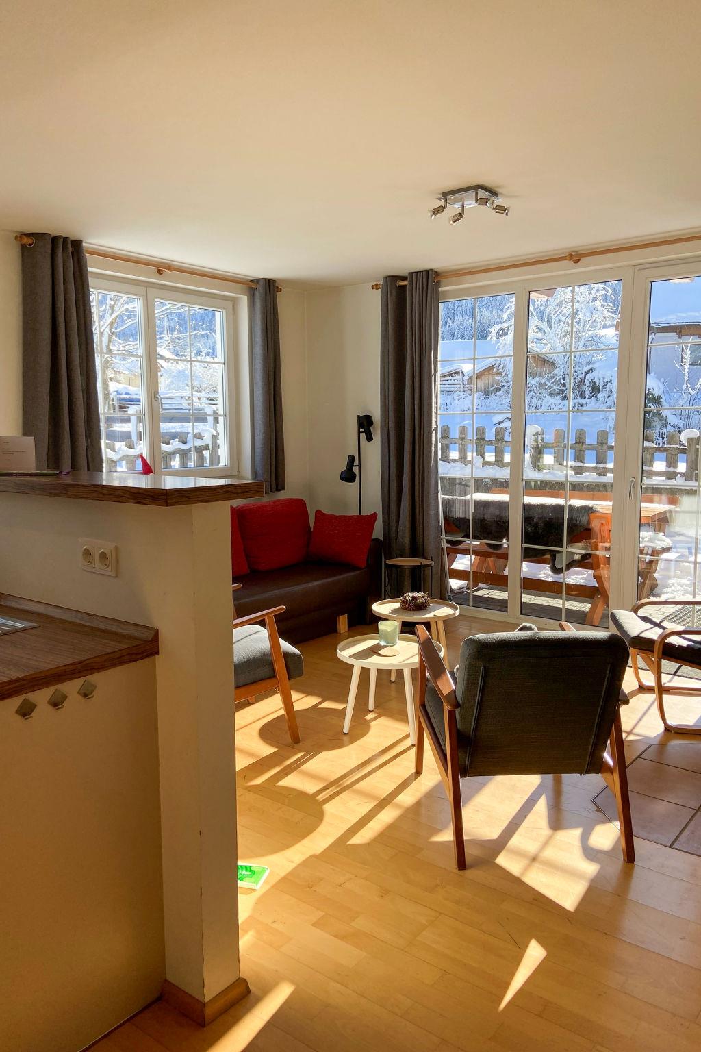 "Top 4", 2-room apartment 50 m2, on the ground floor. Comfortable and cosy furnishings: entrance hall. Living/dining room with 1 double sofabed (180 cm), Scandinavian wood stove, dining nook and satellite TV (flat screen). Exit to the garden, to the terrace. 1 double bedroom. Open kitchen (oven, dishwasher, 4 ceramic glass hob hotplates, toaster, kettle, freezer, electric coffee machine). Shower/WC. Terrace, large garden. Terrace furniture, deck chairs. Marvellous view of the ski run. Facilities: hair dryer. Internet (WiFi, free). Please note: smoke alarm, fire extinguisher. 50508-002504-2020