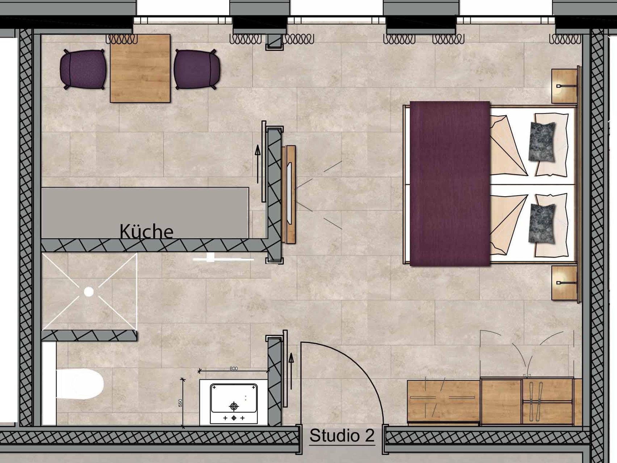 Separater Raum mit hochwertiger und voll ausgestatteter Küche für maximal 2 Personen: