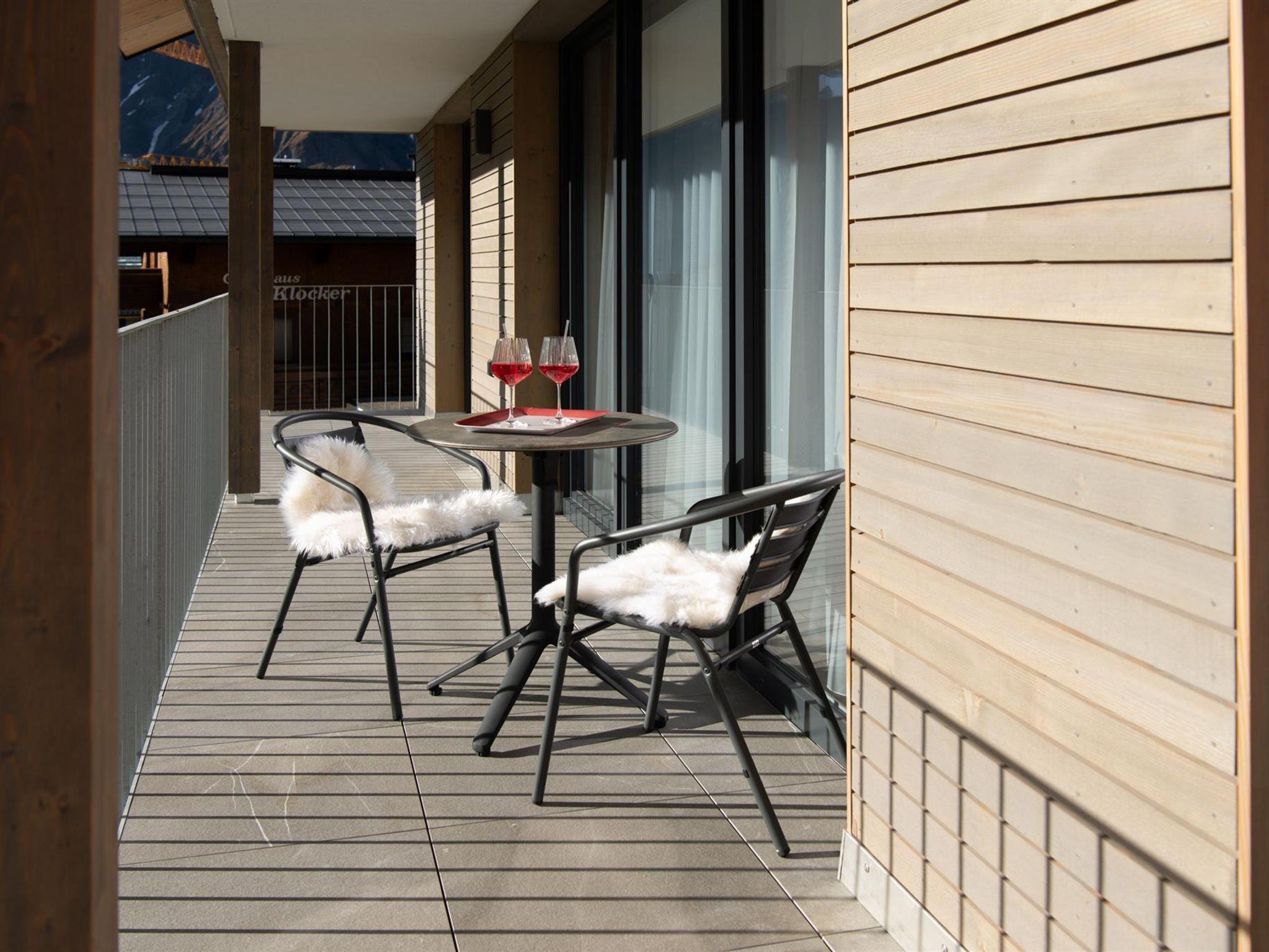 Überdachter Südbalkon mit Sitzmöglichkeit