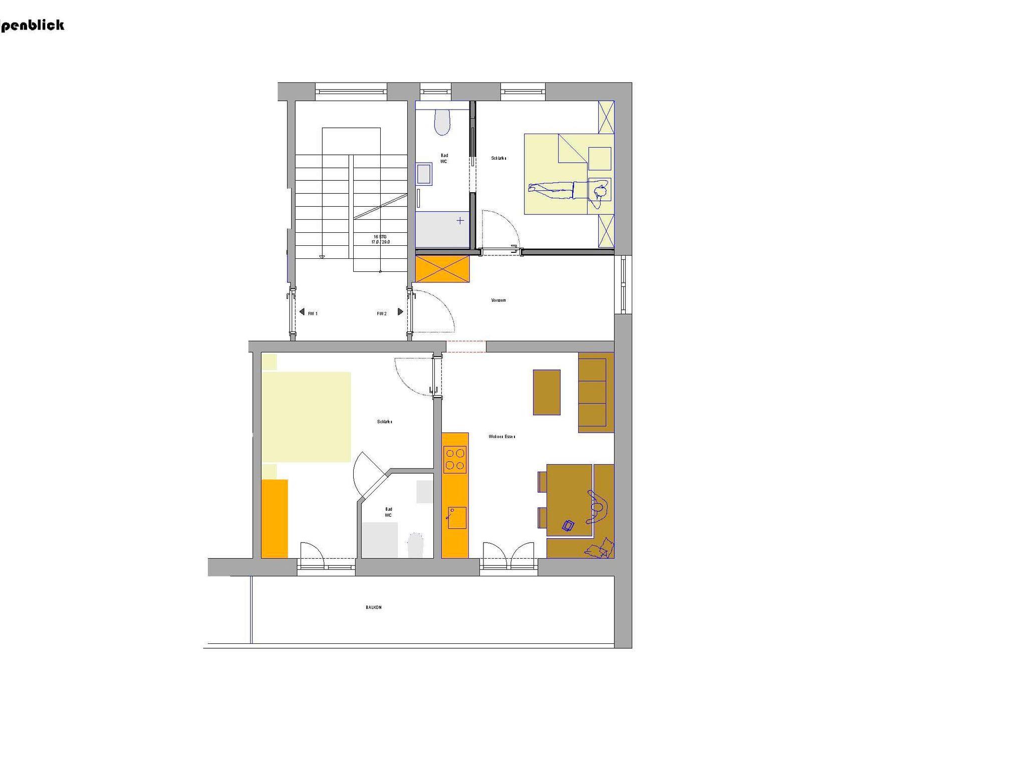 Raumaufteilung: 2 Doppelzimmer, 2 Dusche/WC, Küche, Balkon,