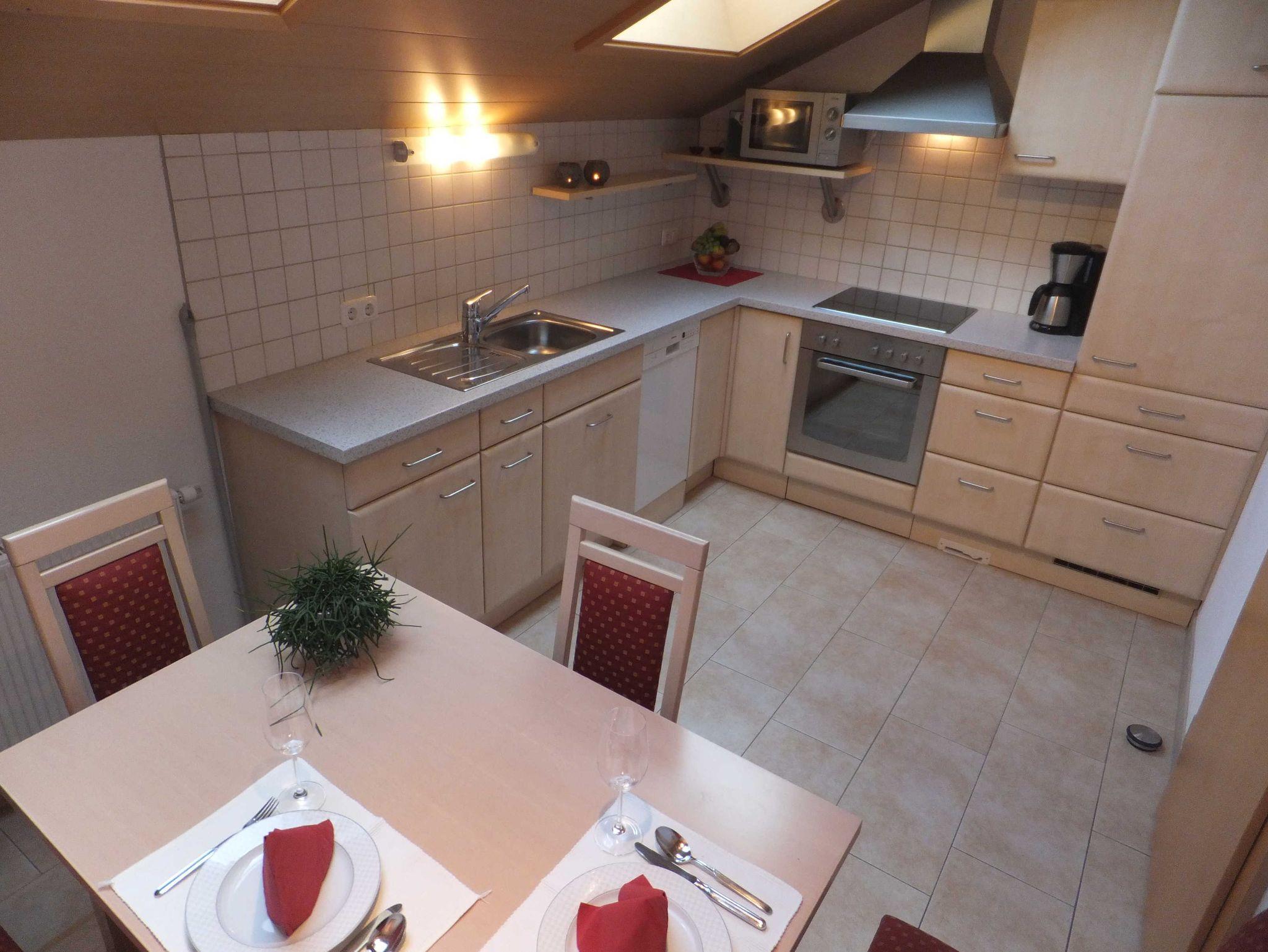Wohnküche in der Dachschräge mit Spülmaschine, Backofen und Mikrowelle,