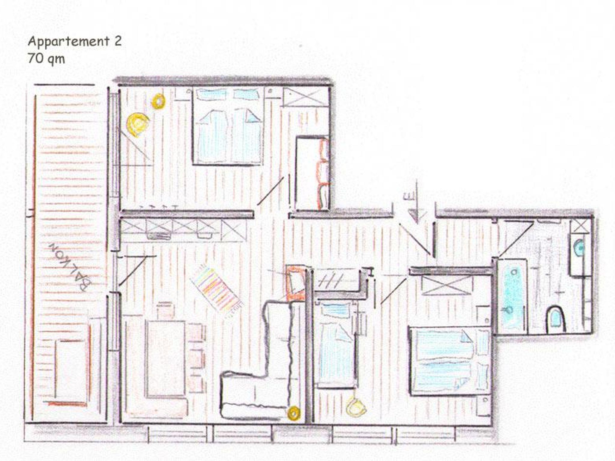 Das Appartement 2 in schlichtem Design und gemütlichen Ambiente hat 70 m² und ist für 4 -6 Personen, es verfügt über einen großen Wohn - und Essraum mit Küche, zwei getrennten Schlafzimmern, Bad und Balkon. Die großzügigen hellen Räume bestehen aus unbehandelten natürlichen Massivholz und schaffen ein gemütliches, gesundes wohnen.
