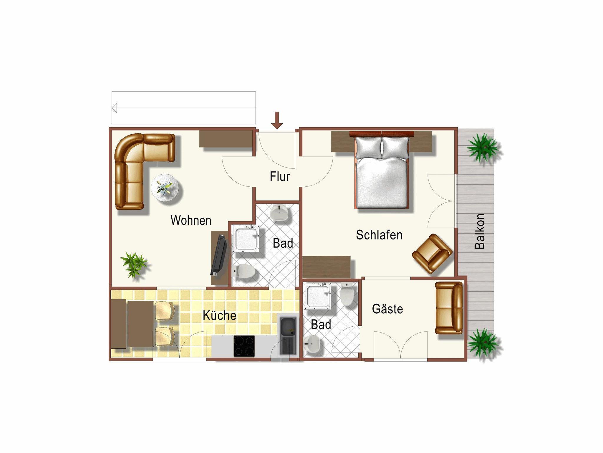 Komplett neu renovierte Wohnung im Landhausstil. 55 m² Appartement mit Schlafzimmer (Doppelbett) sowie Wohnzimmer mit großer Couch (ausziehbar als Schlafcouch für 2 weitere Personen / Liegefläche 1,50 m x 2,50 m) und zwei Badezimmern mit Dusche/WC. Im Schlafzimmer befindet sich zusätzlich eine weitere Couch, die auch als Schlafcouch verwendet werden kann.