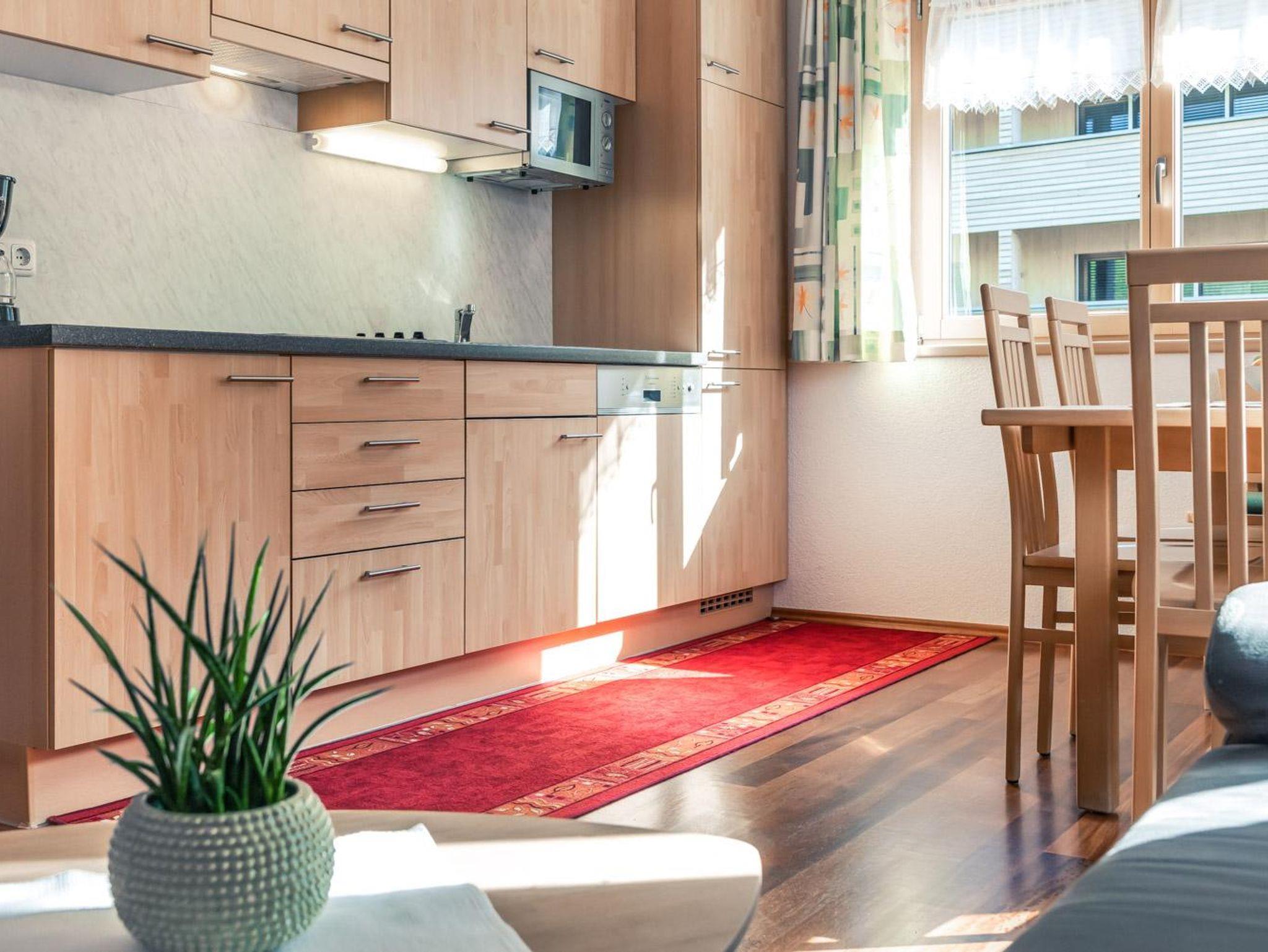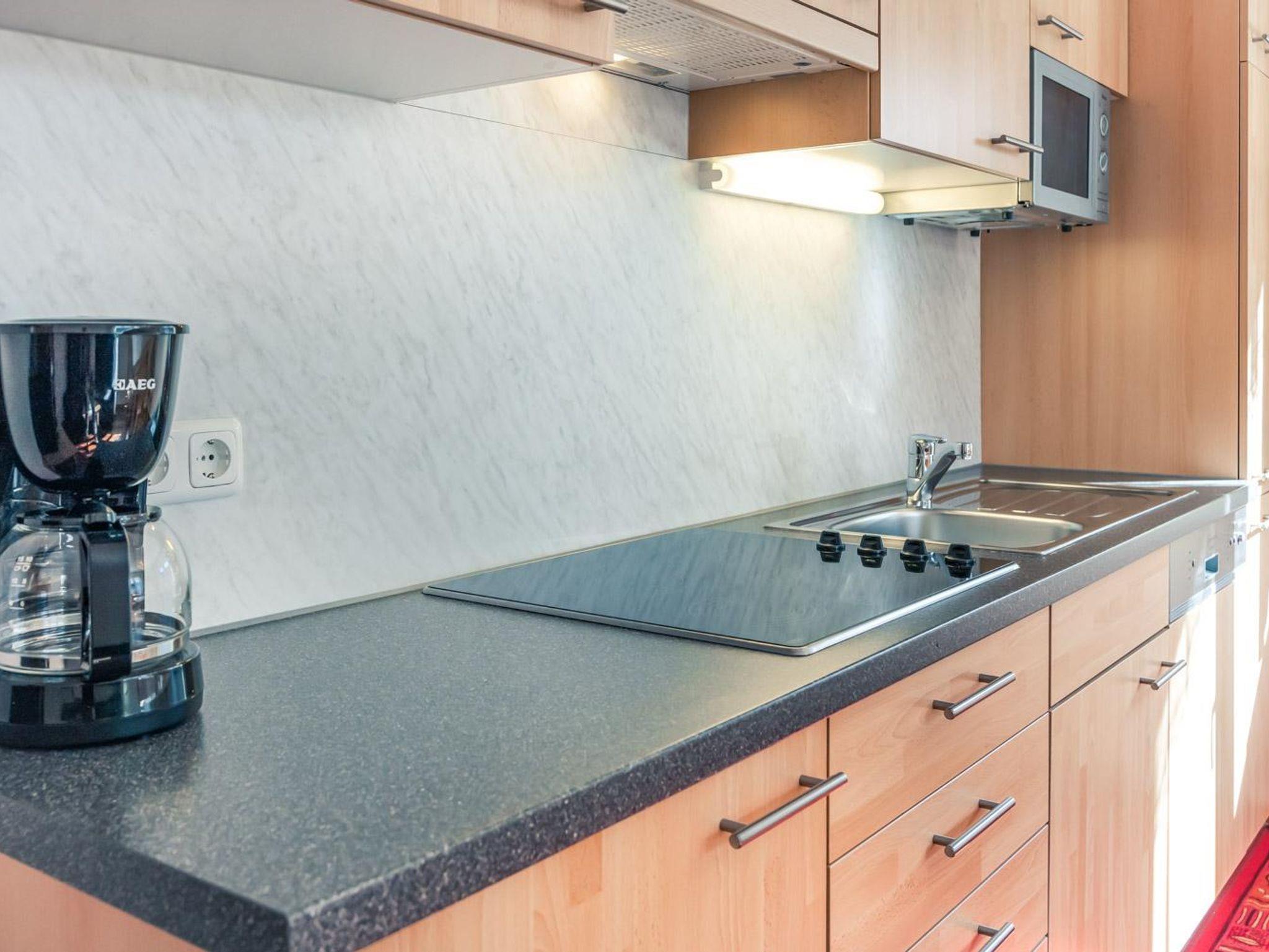 Kühlschrank mit Gefrierfach, Mikrowelle, Cerankochfeld (4 Platten), Geschirrspülmaschine, Toaster, Wasser- und Eierkocher, Kaffee-Filtermaschine, Kaffee Kapselmaschine (Caffissimo), Mixer, Rührstab, sowie ausreichend Geschirr, Gläser, Kochtöpfe und Pfannen.