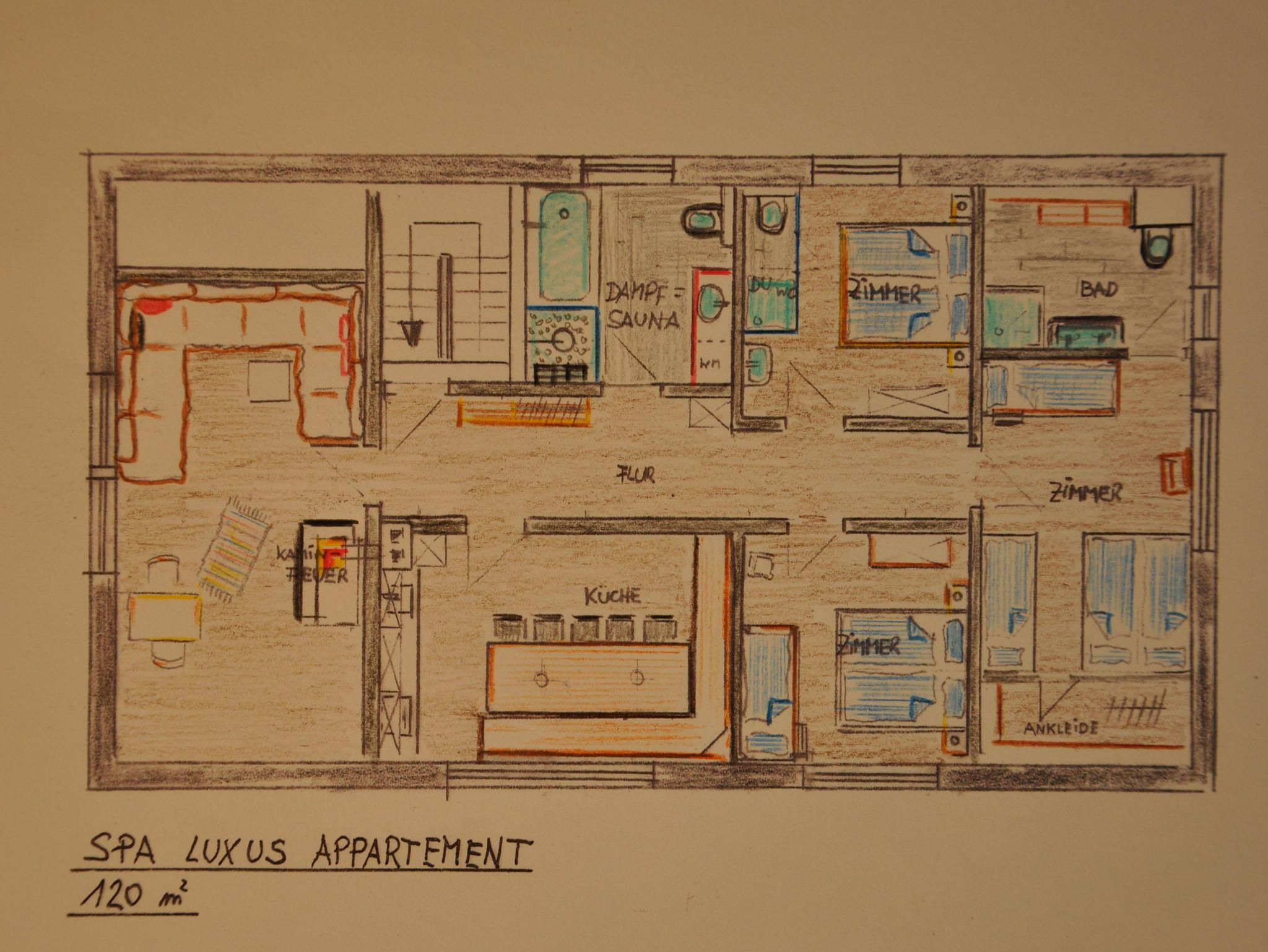 Unser Luxus Appartements, das besonders durch die Größe (120 qm) und der exklusiven Ausstattung besticht bietet drei Schlafzimmer, eine Spa-Dampf-Dusche, ein offenes Glasbadezimmer im Schlafzimmer integriert, die geräumige Wohnküche mit großer Tischecke und das gemütliche Wohnzimmer mit offenem Kamin sind weitere Argumente für diese Wohnung. Weitere Ausstattung: Waschmaschine, Wäschetrockner in der Wohnung.