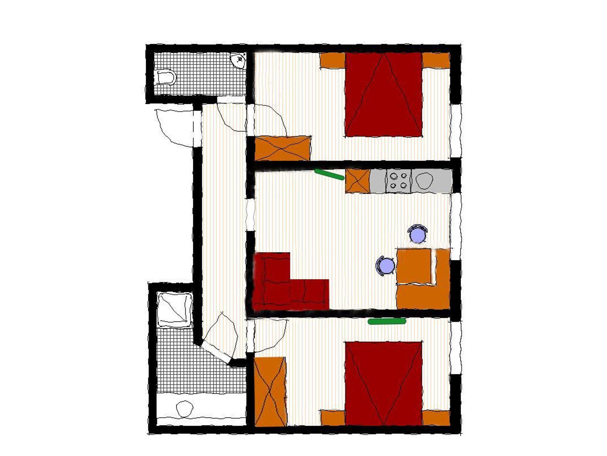 Großzügige Ferienwohnung mit 2 getrennten Schlafzimmer, Wohnküche mit Ecksofa, Dusche/WC (Haarfön vorhanden) und Waschtisch, sep. WC, WLAN