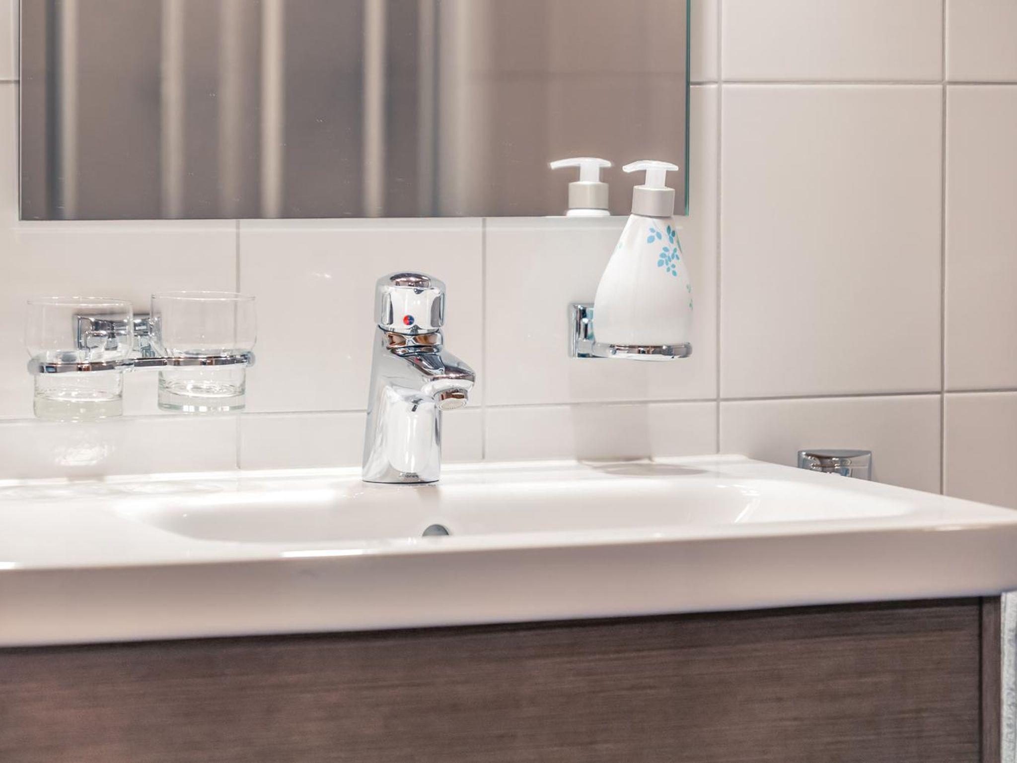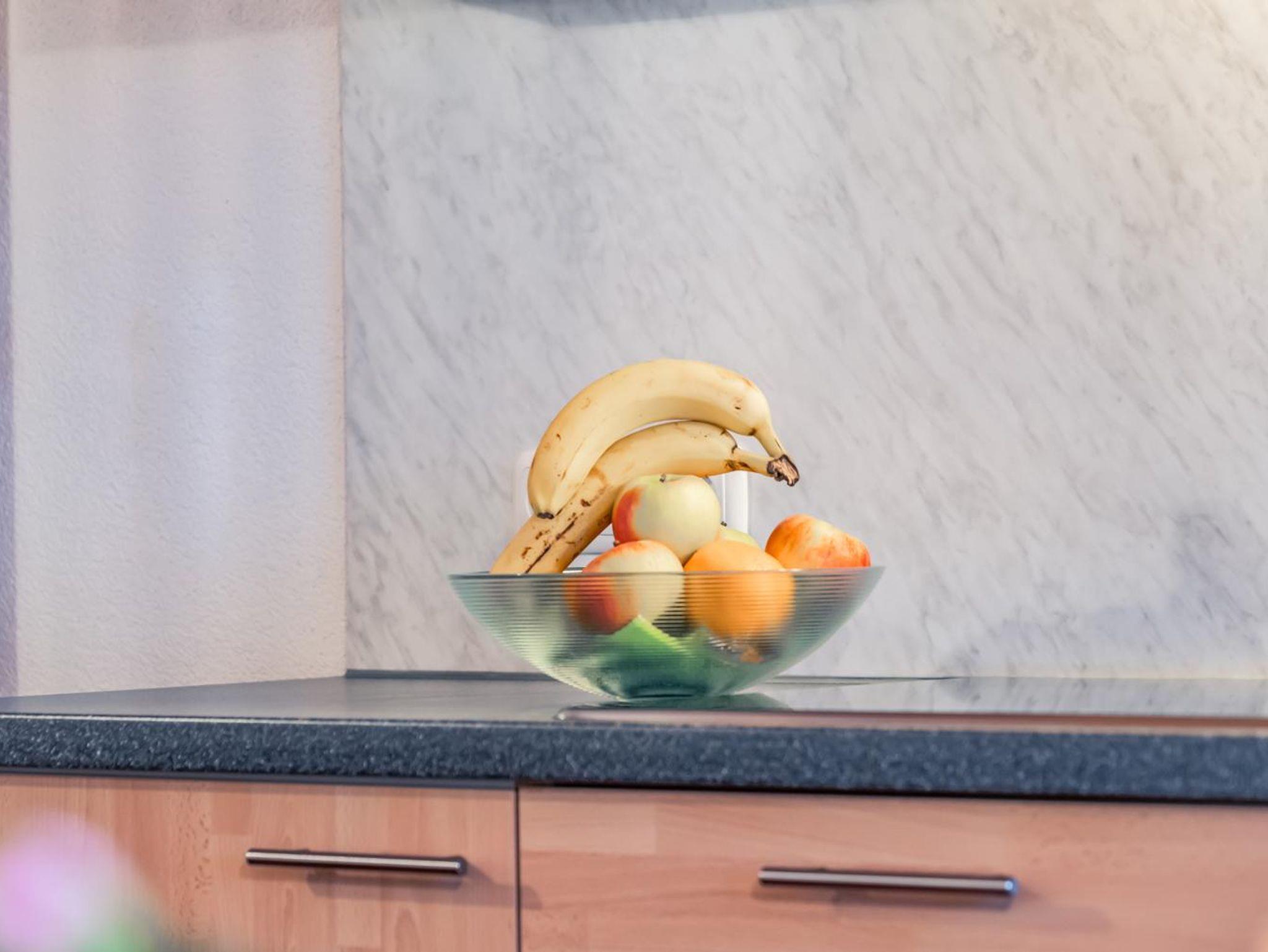 Kühlschrank mit Gefrierfach, Mikrowelle, Cerankochfeld (4 Platten), Geschirrspülmaschine, Toaster, Wasser- und Eierkocher, Kaffee-Filtermaschine, Kaffee Kapselmaschine (Caffissimo), Mixer, Rührstab, sowie ausreichend Geschirr, Gläser, Kochtöpfe und Pfannen.