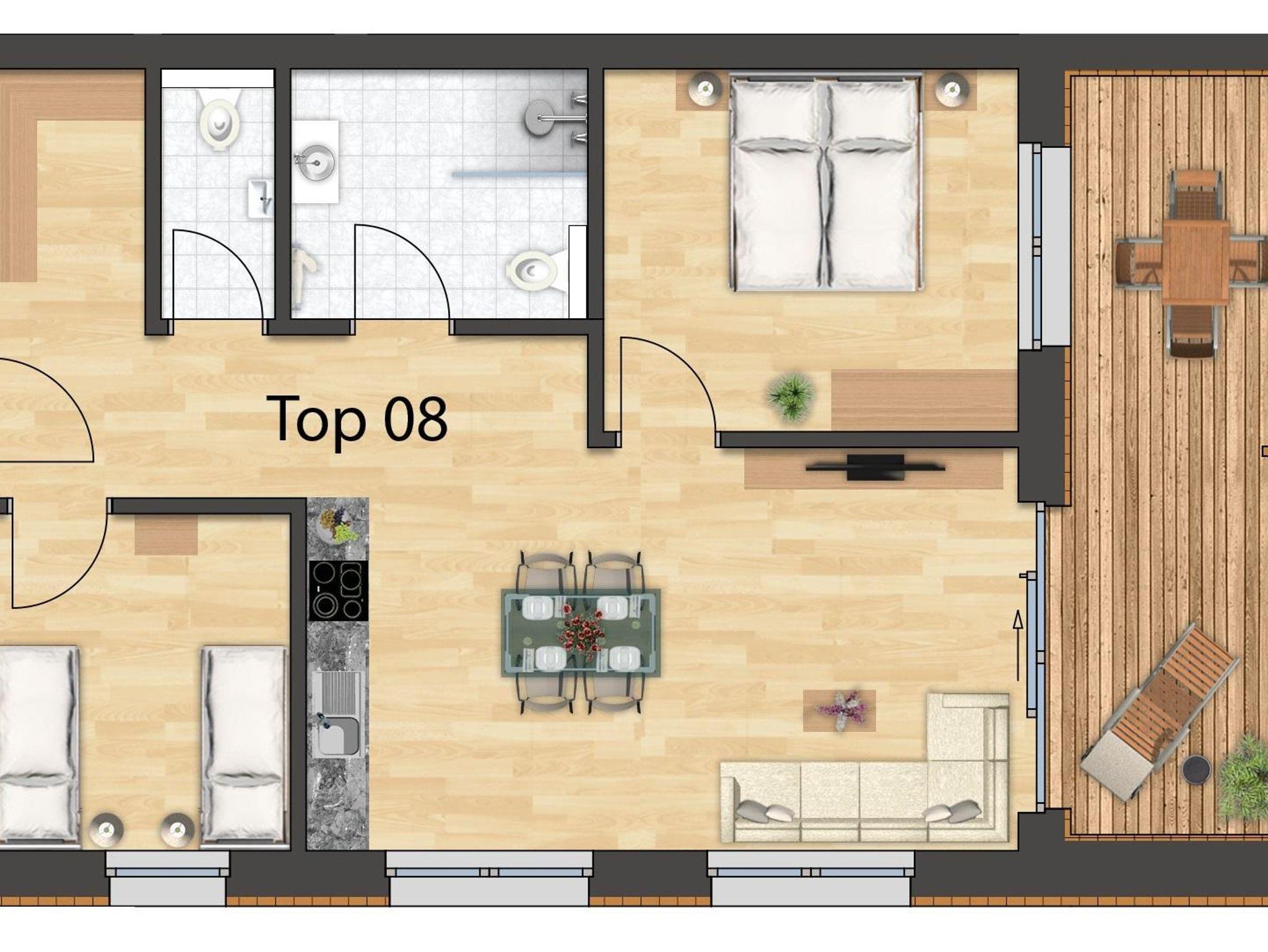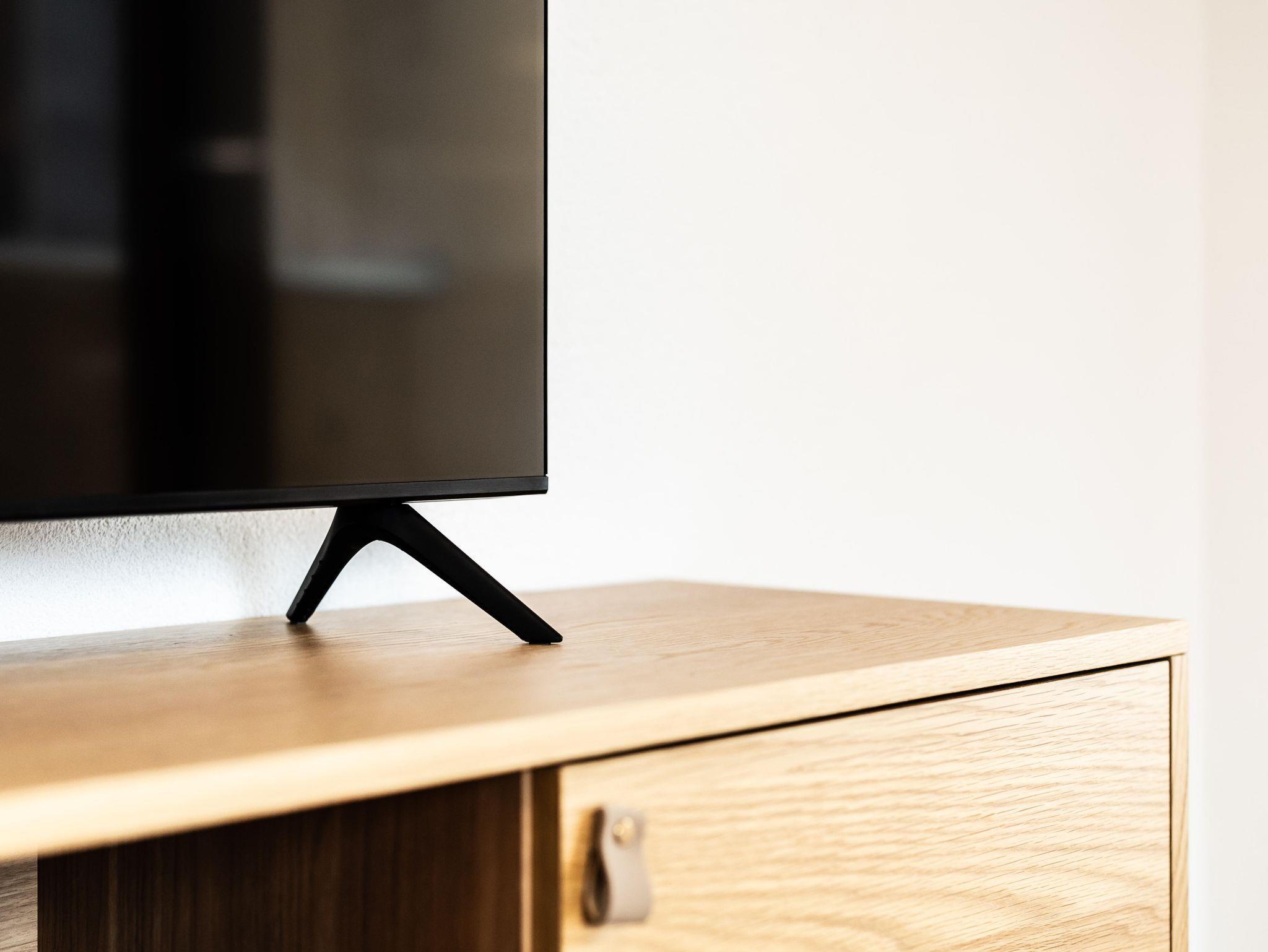 Bestehend aus einem Wohnraum mit Küche, Esstisch, Couch und TV.