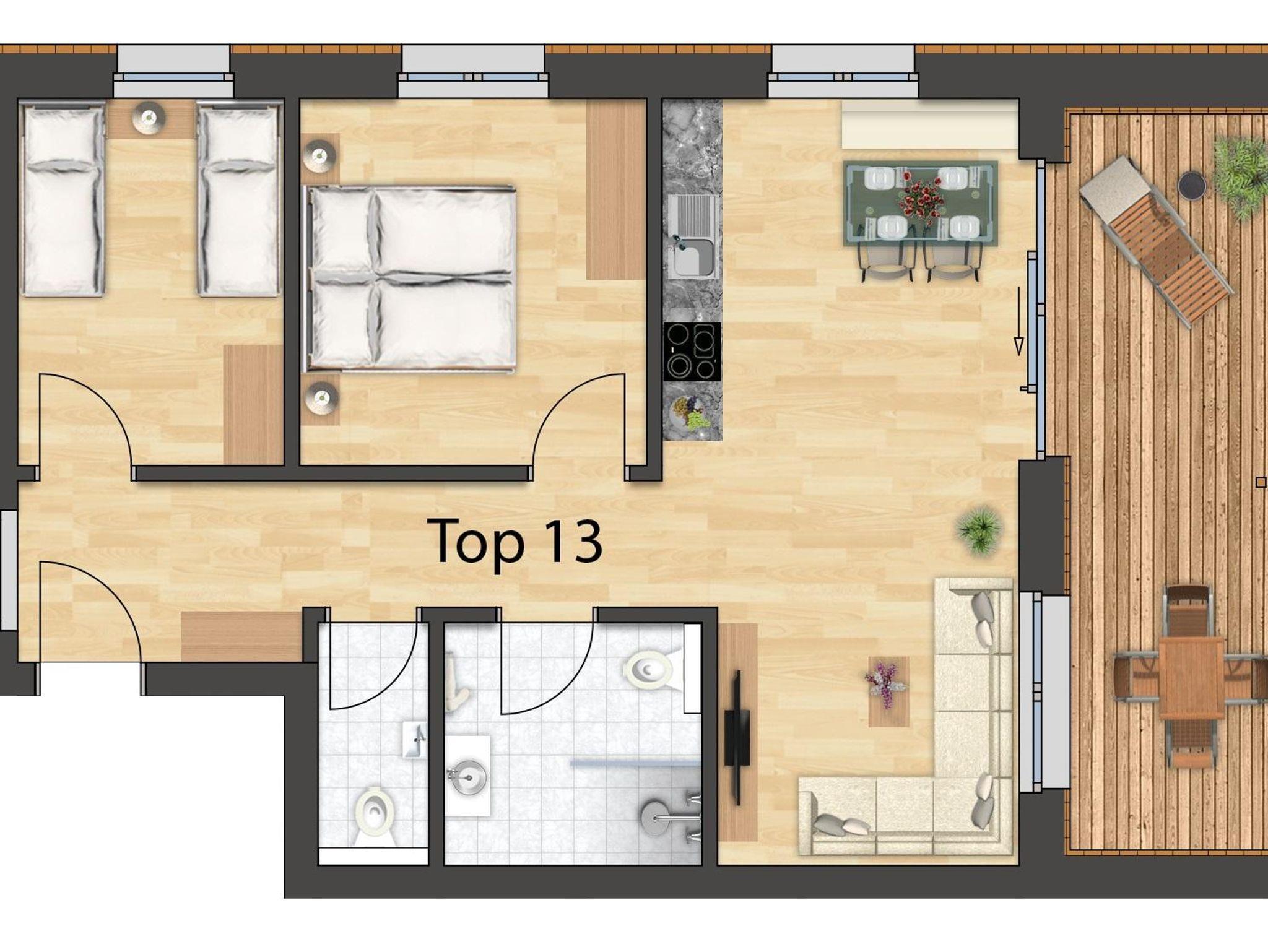 Bestehend aus einem Wohnraum mit Küche, Esstisch, Couch ausziehbar für 2 Personen und TV.