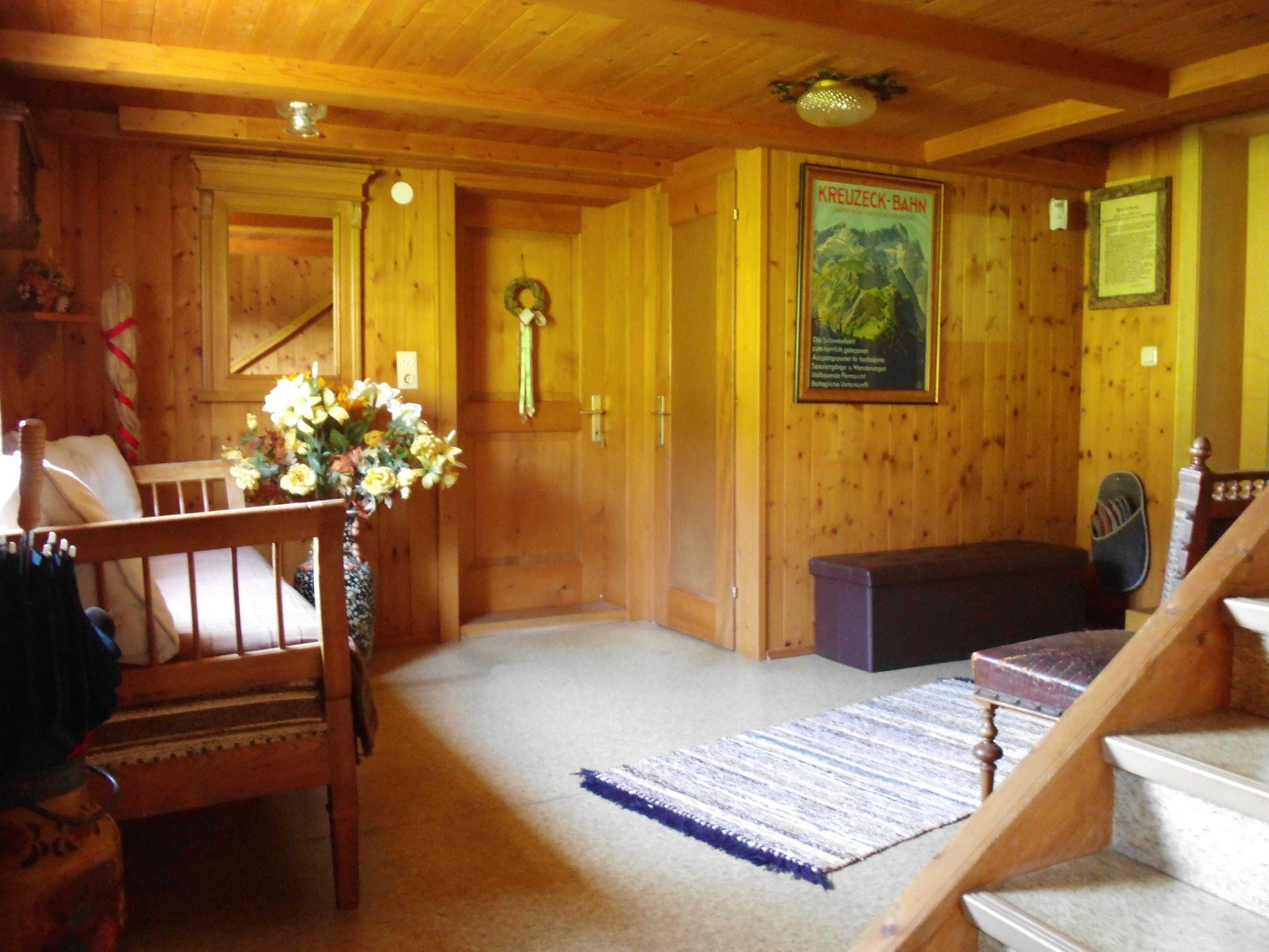 Im Eingangsbereich befindet sich eine Garderobe und eine kleine Sitzbank. Von da gelangen Sie ins Bad, in die Schlafzimmer und in den Küchenbereich.