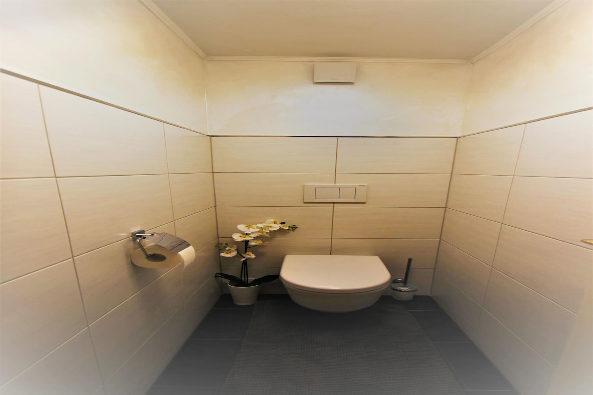 On the 1st floor: (Large kitchen(single sofa bed, TV(satellite), dining table, stereo unit, oven, microwave, dishwasher), bedroom(double bed, TV), bedroom(double bed, TV), bathroom(bath tub, shower, washbasin), toilet) infrared sauna, balcony, heating(central), air conditioning, terrace, garden(shared with other guests), garden furniture, parking, bicycles available, children's bed(on request)