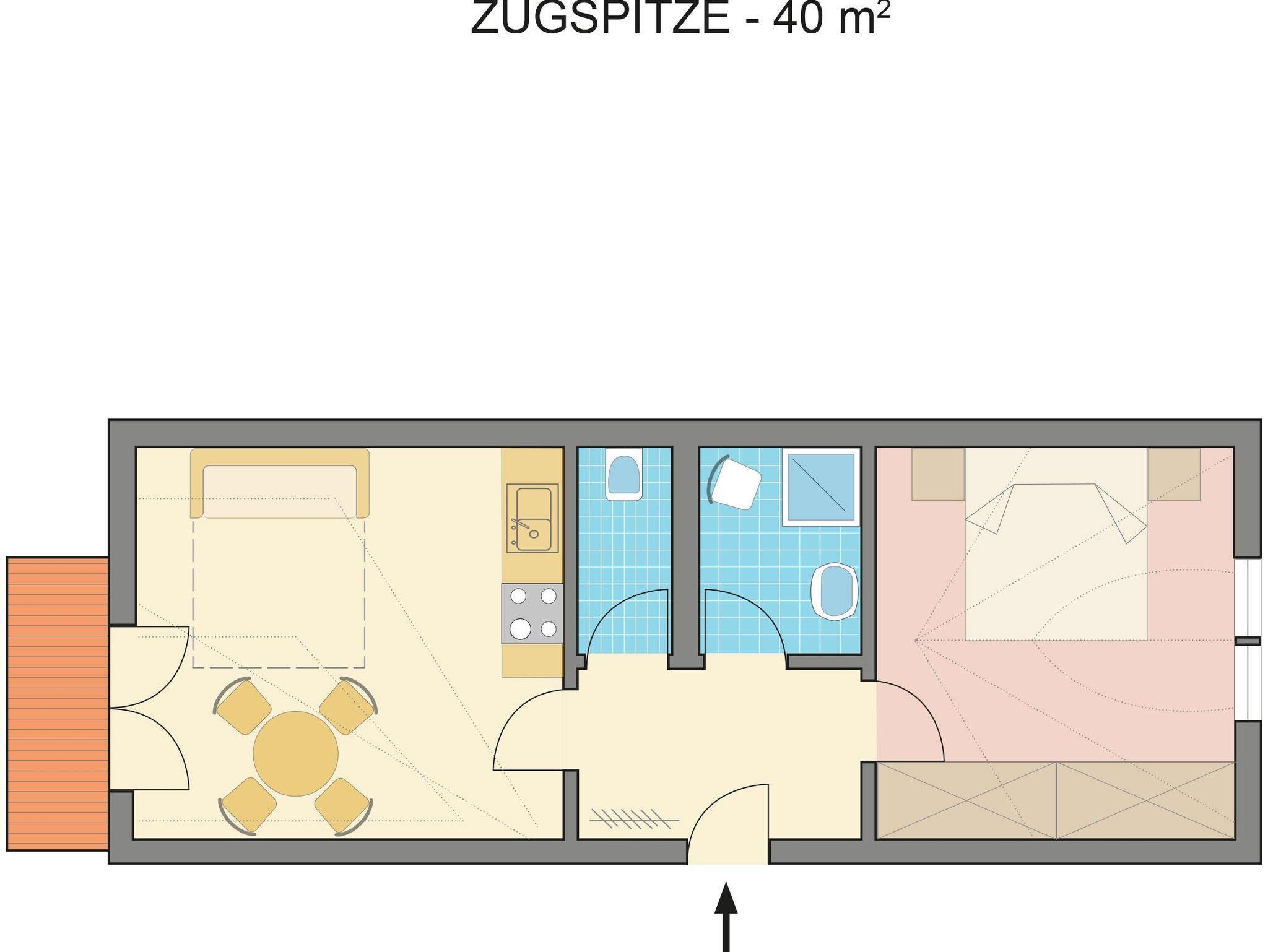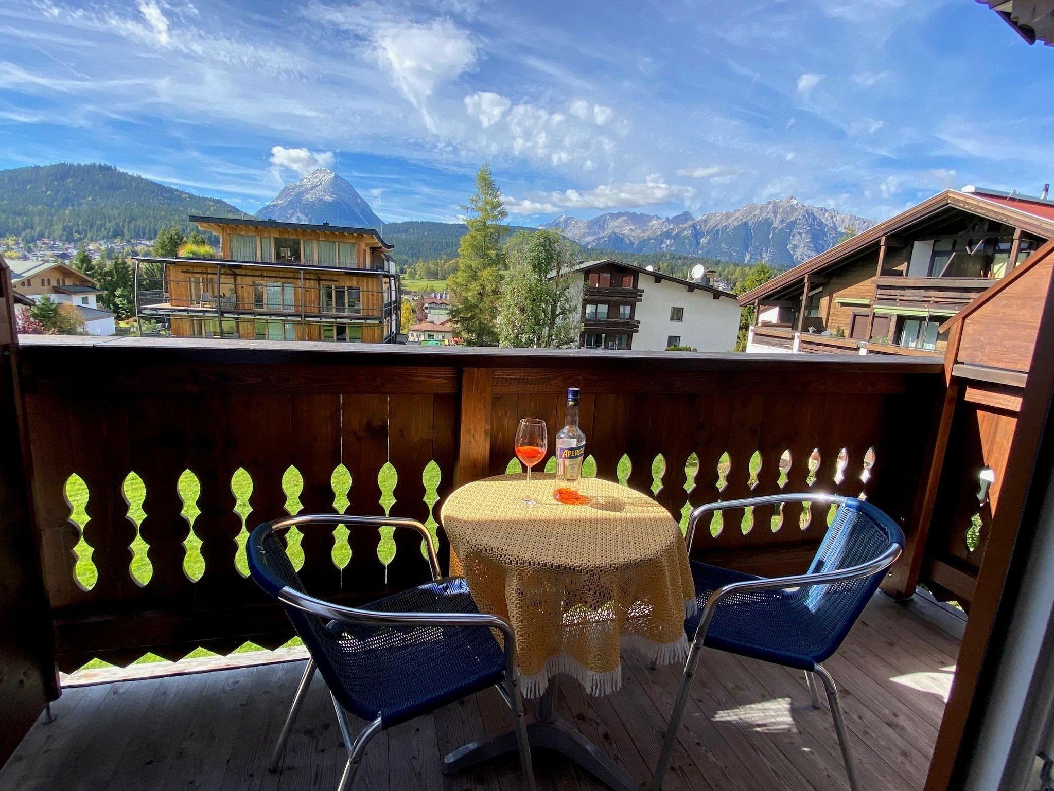 Großzügiges 2-Raum-Apartment (40 m²) im zweiten Stock mit Blick auf die Hohe Munde und das Wettersteingebirge. Wohnzimmer mit Küchenzeile, Esstisch und Couch, 1 Schlafzimmer. Ost-Westlage, Balkon, Badezimmer mit Dusche, getrenntes WC.