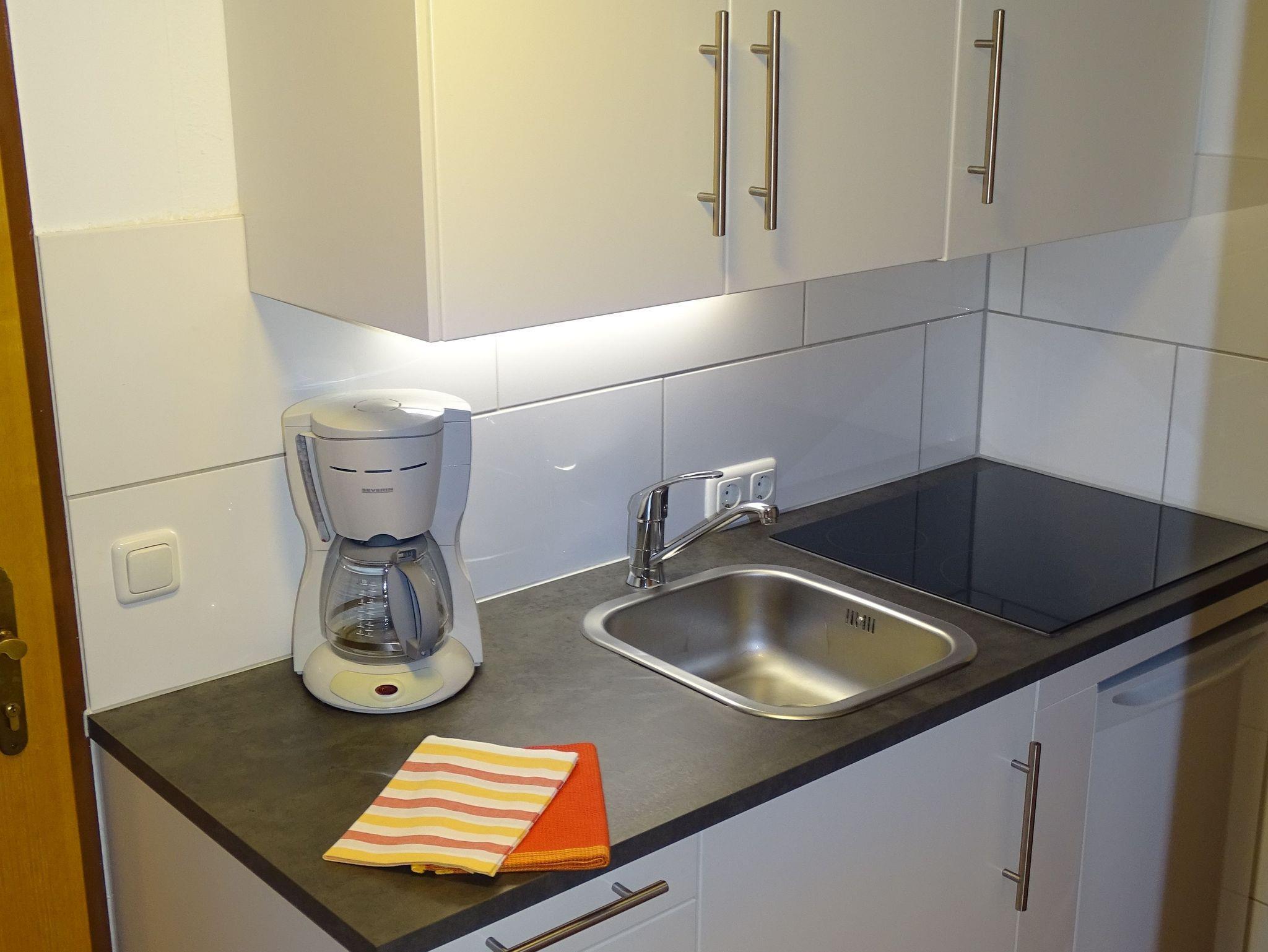 - Küchenzeile mit 2-Plattenherd, Kühlschrank, Kaffeemaschine, Ess- und Kochgeschirr