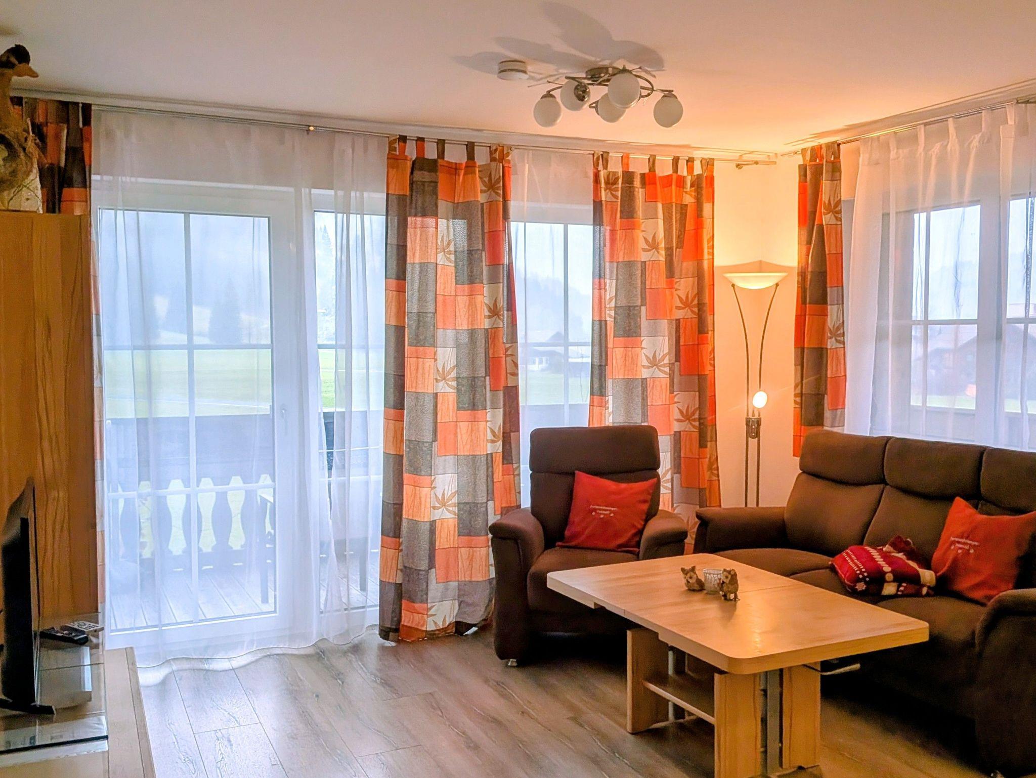 Der helle Wohn-Essbereich mit gemütlicher Sitzecke und Blick auf die Vils lädt zum Entspannen ein.