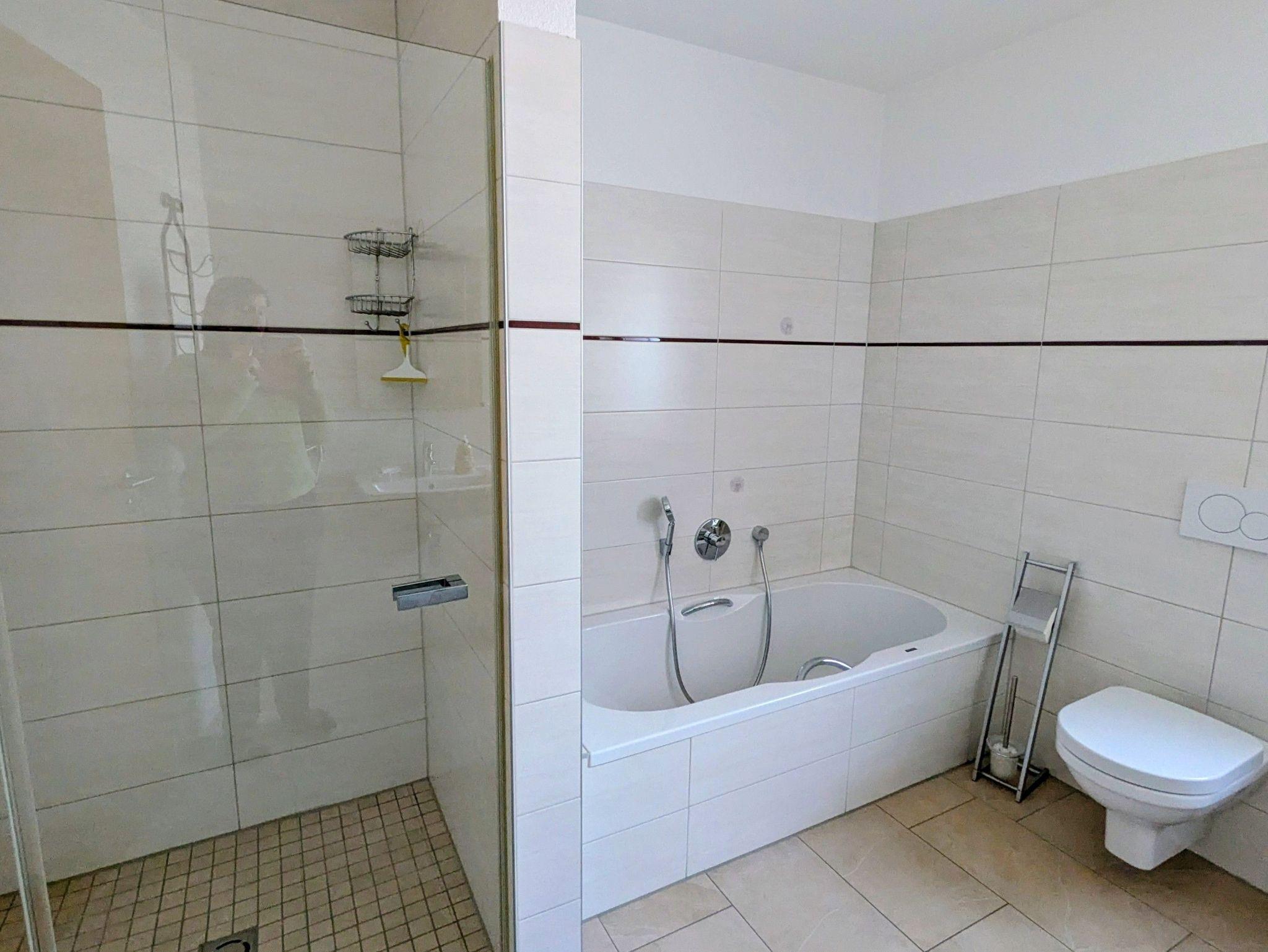 Schlafzimmer mit Doppelbett, komfortables Schlafsofa im Wohnraum, modernes Bad mit Dusche, WC und Föhn.