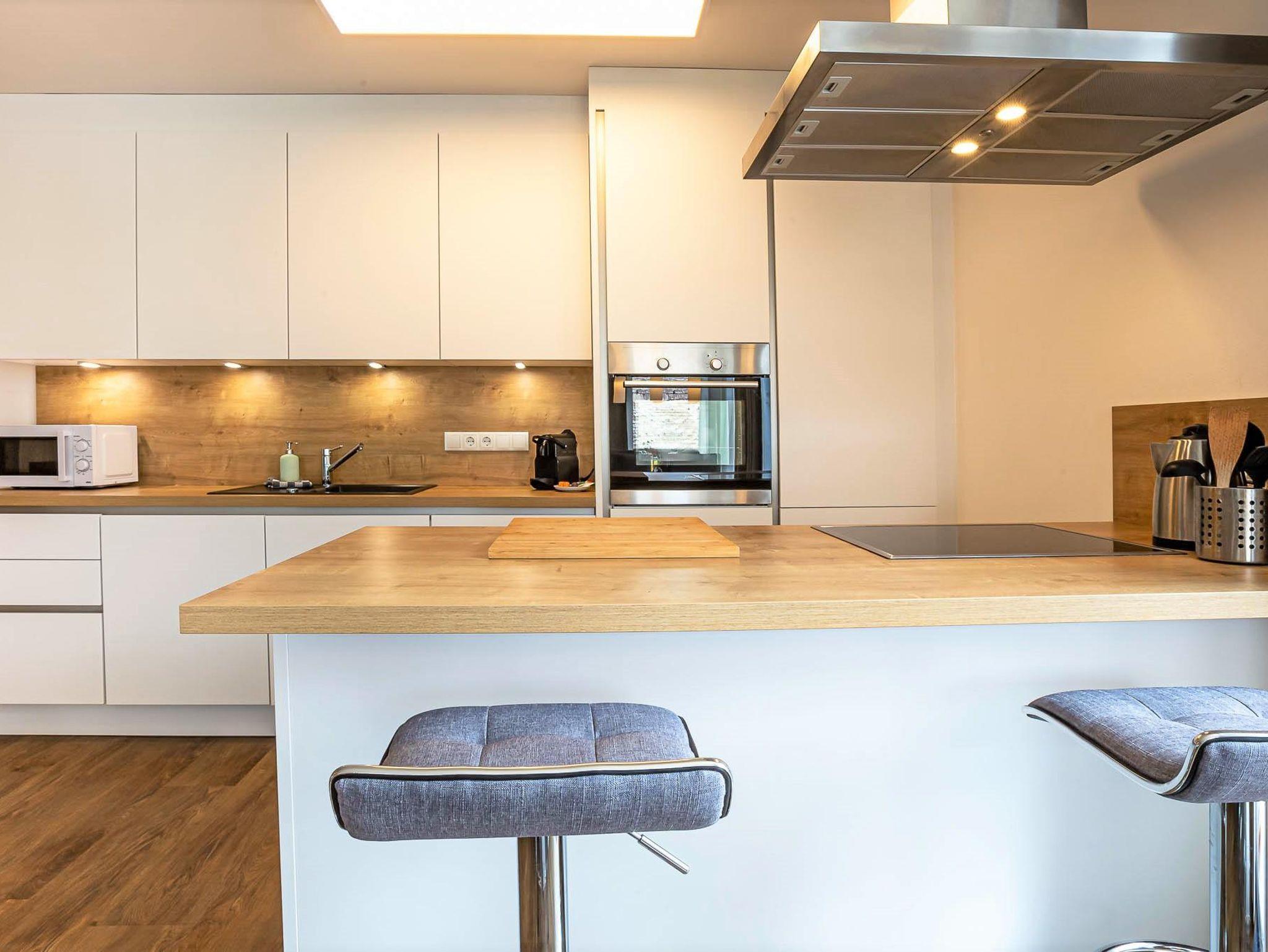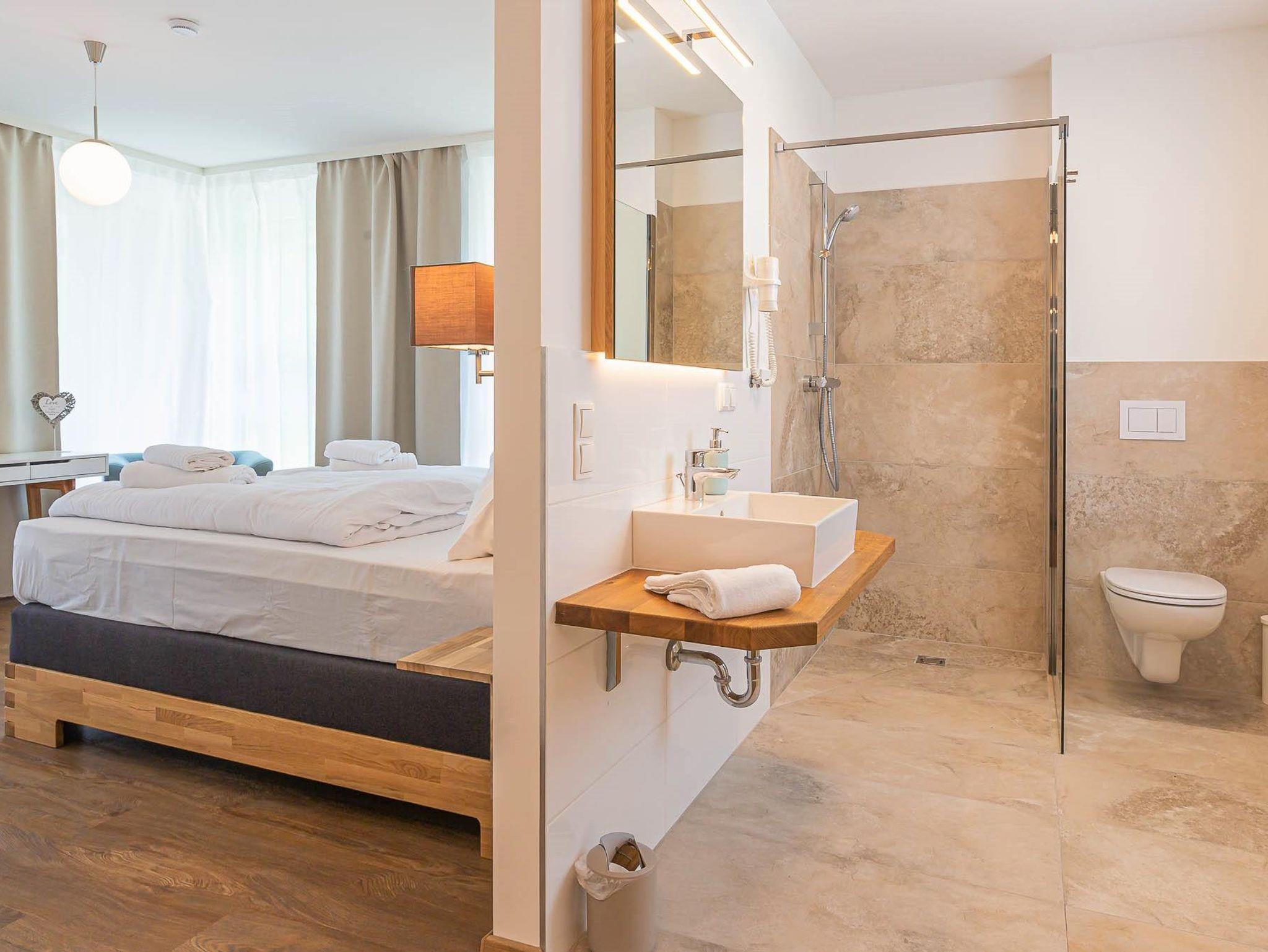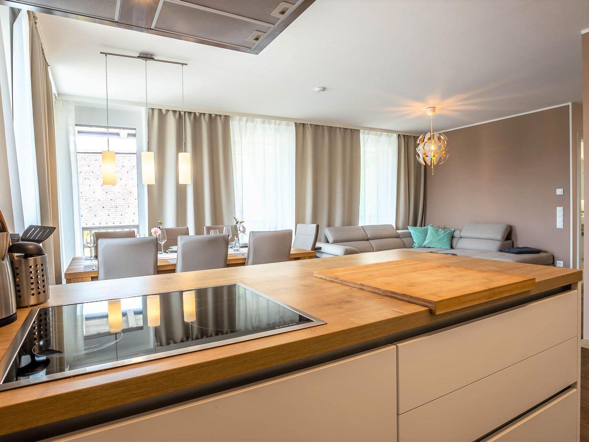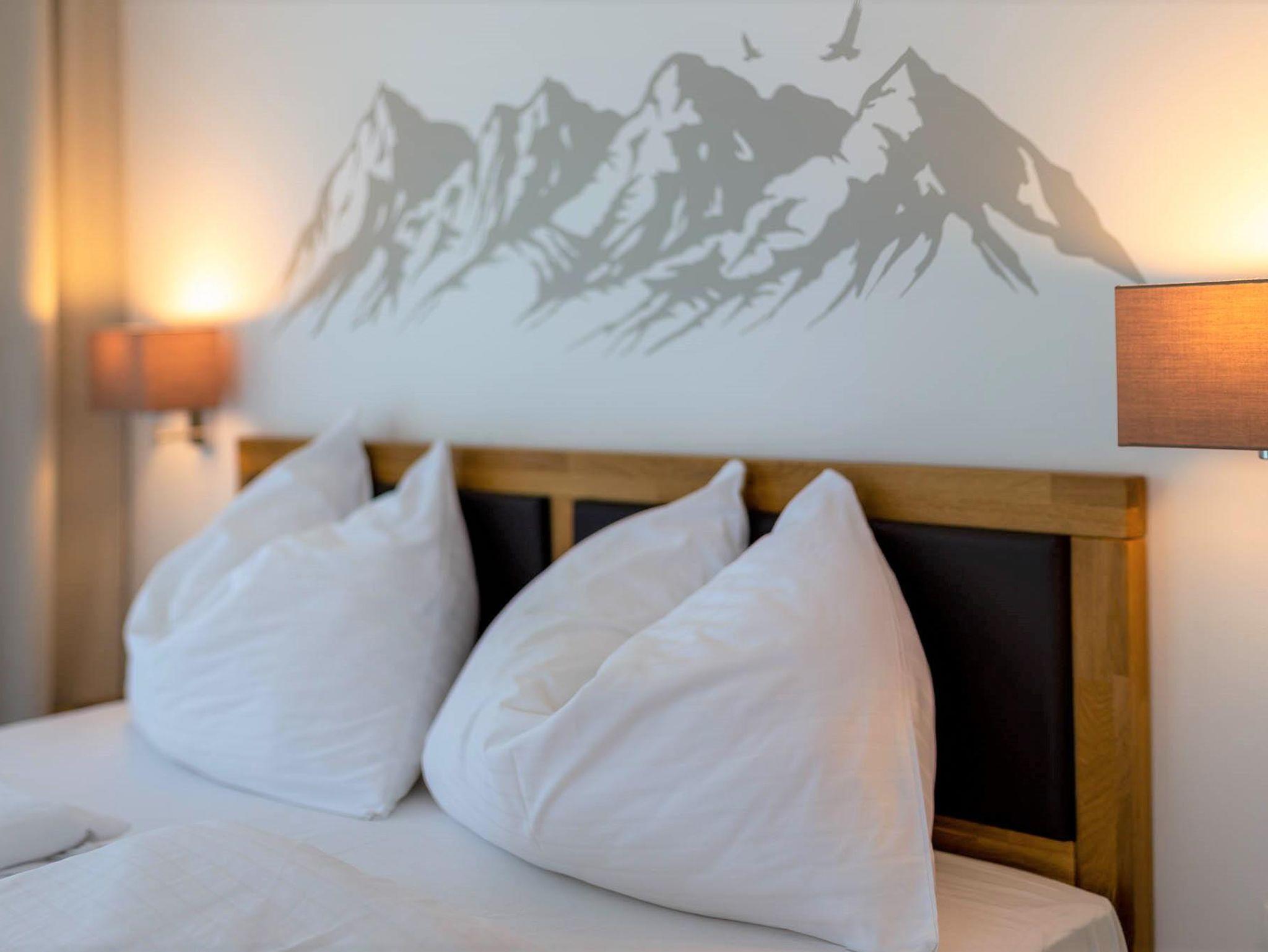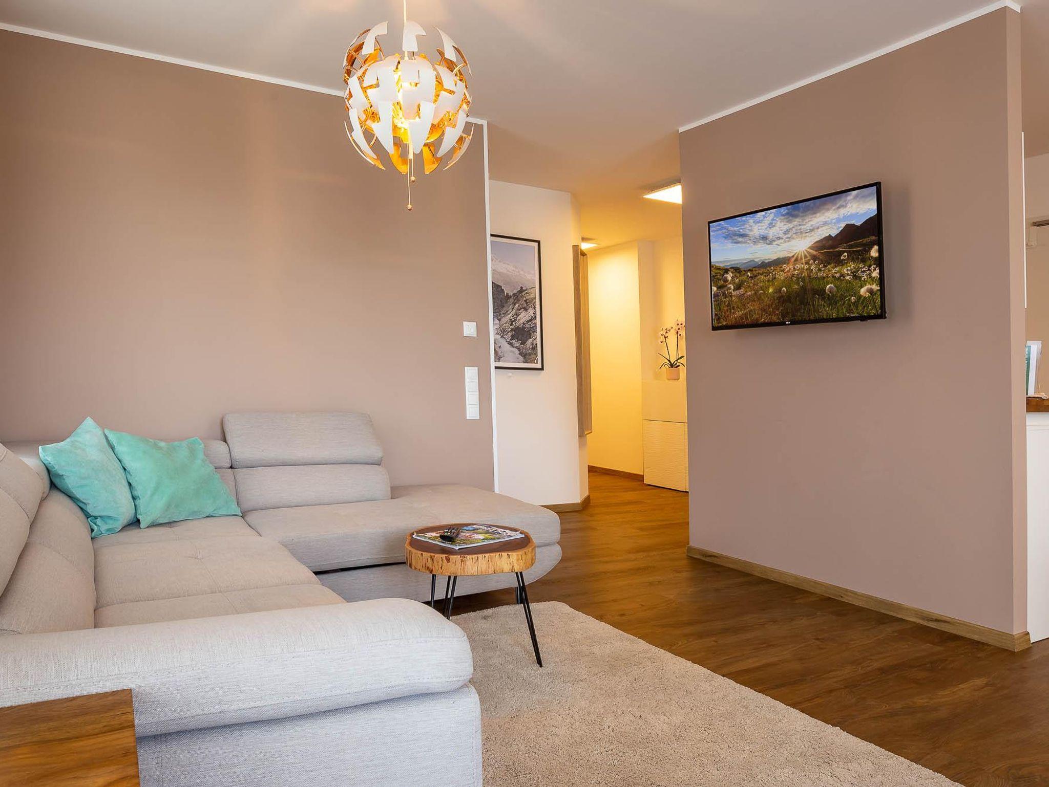 Willkommen in Ihrer Ferienwohnung! Die Wohnung bietet ein Schlafzimmer mit Etagenbett und Schrank, ein Schlafzimmer mit Doppelbett und Schrank sowie ein Schlafzimmer mit eigenem Duschbad (WC im angrenzenden Raum). Der großzügige Wohnbereich verfügt über ein bequemes Sofa und einen Fernseher. Die offene Küche ist voll ausgestattet mit Herd, Kochfeld, Ofen, Toaster, Kaffeemaschine und allen nötigen Utensilien. Der Essbereich fügt sich harmonisch in den Raum ein. Alle Zimmer teilen sich einen Balkon mit herrlichem Blick auf die Berge – perfekt für Ihren Aufenthalt!