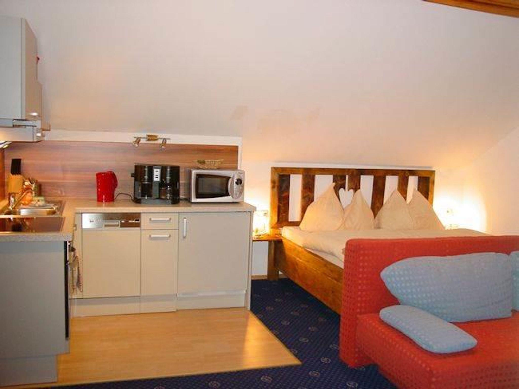 Das 35 m² große Studioappartement Königstuhl verfügt über ein gemütliches Doppelbett und eine Schlafcouch für bis zu 2 Personen. Dusche und WC sind hier getrennt. Die Küche ist voll ausgestattet mit Ceranfeld, Backrohr, Kühlschrank mit Gefrierfach, Mikrowelle, Geschirrspüler und Kaffeemaschine. Vom Balkon aus hat man einen wunderbaren Blick ins Tal.